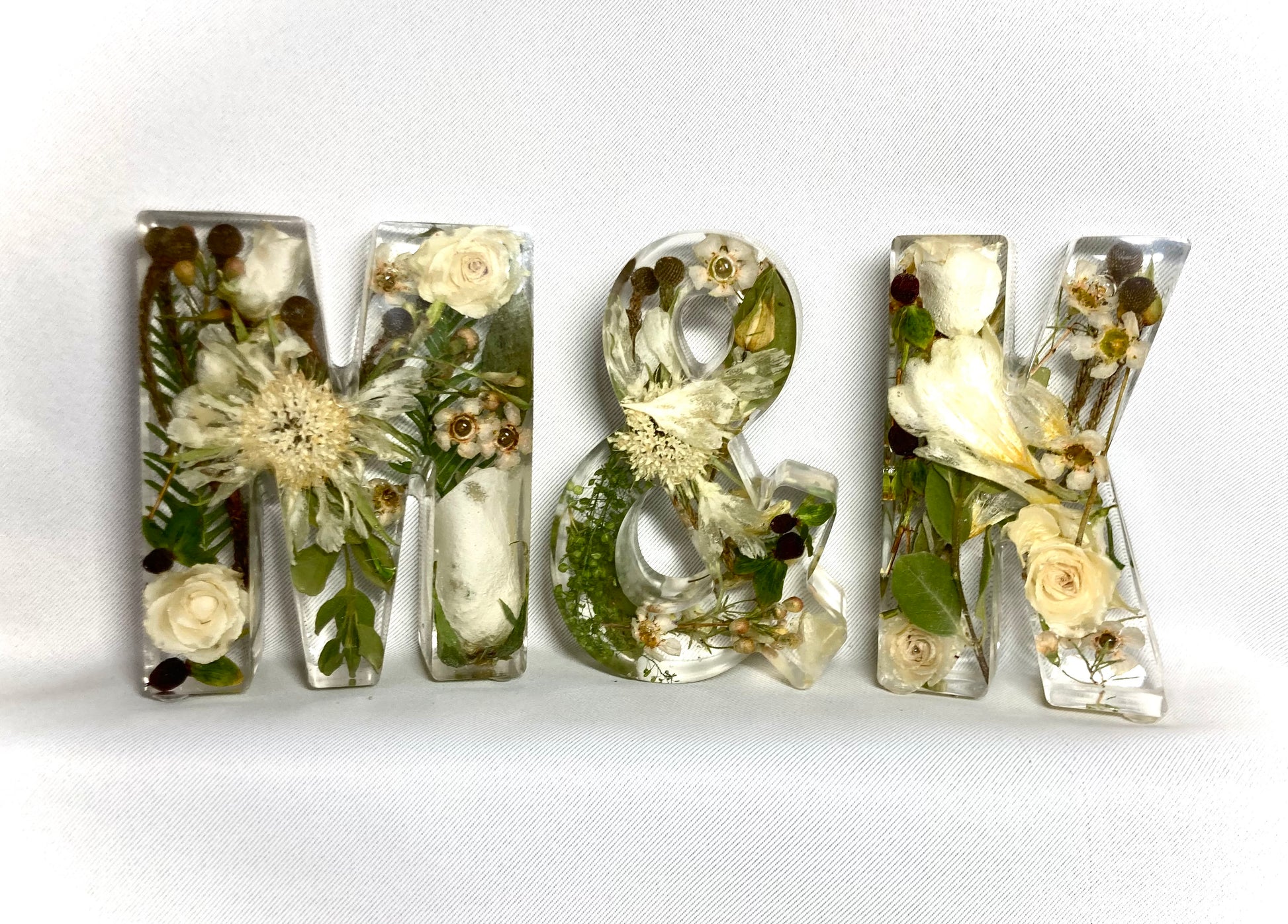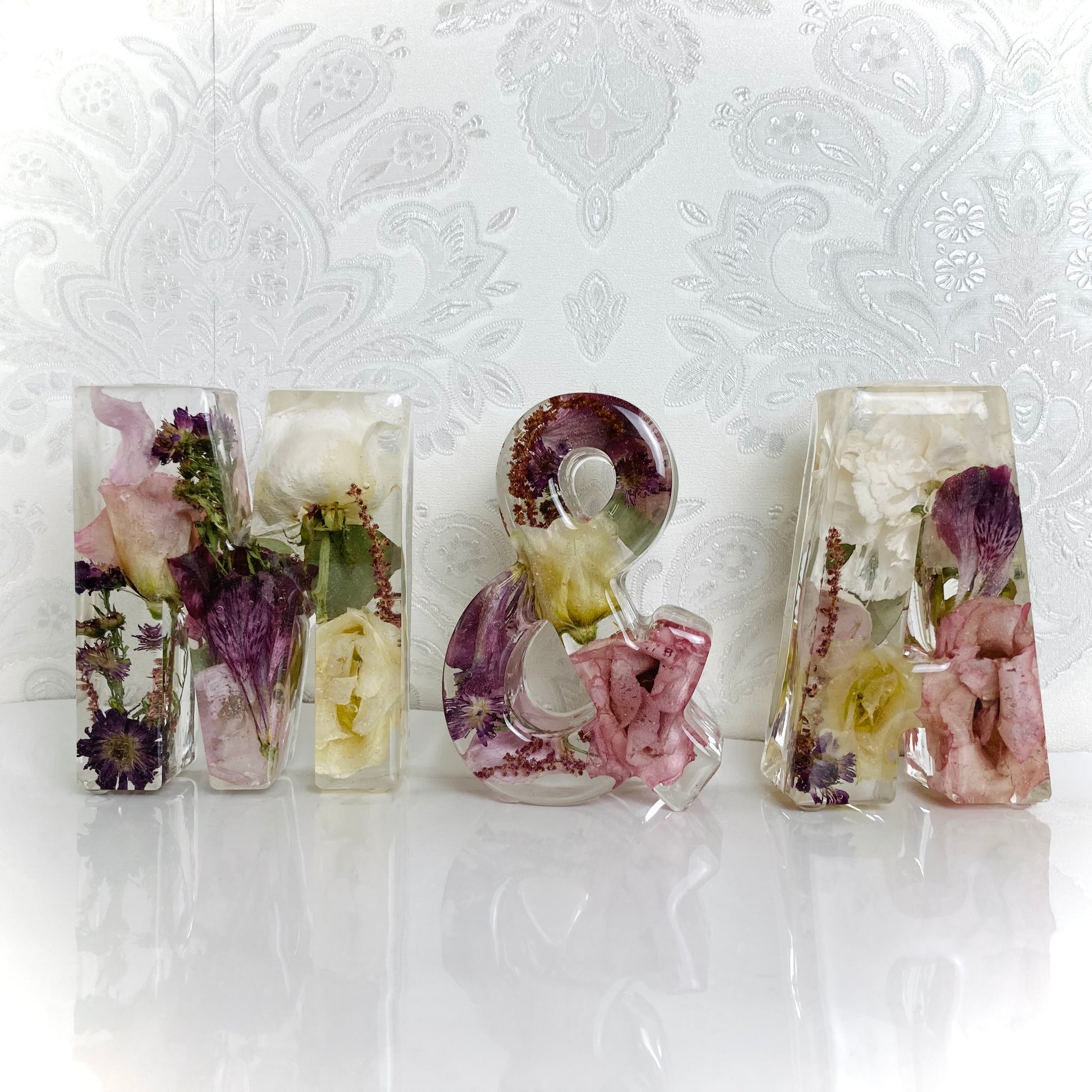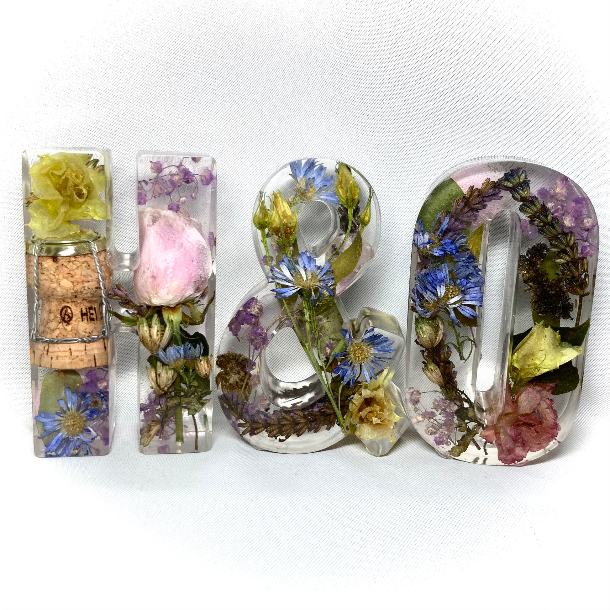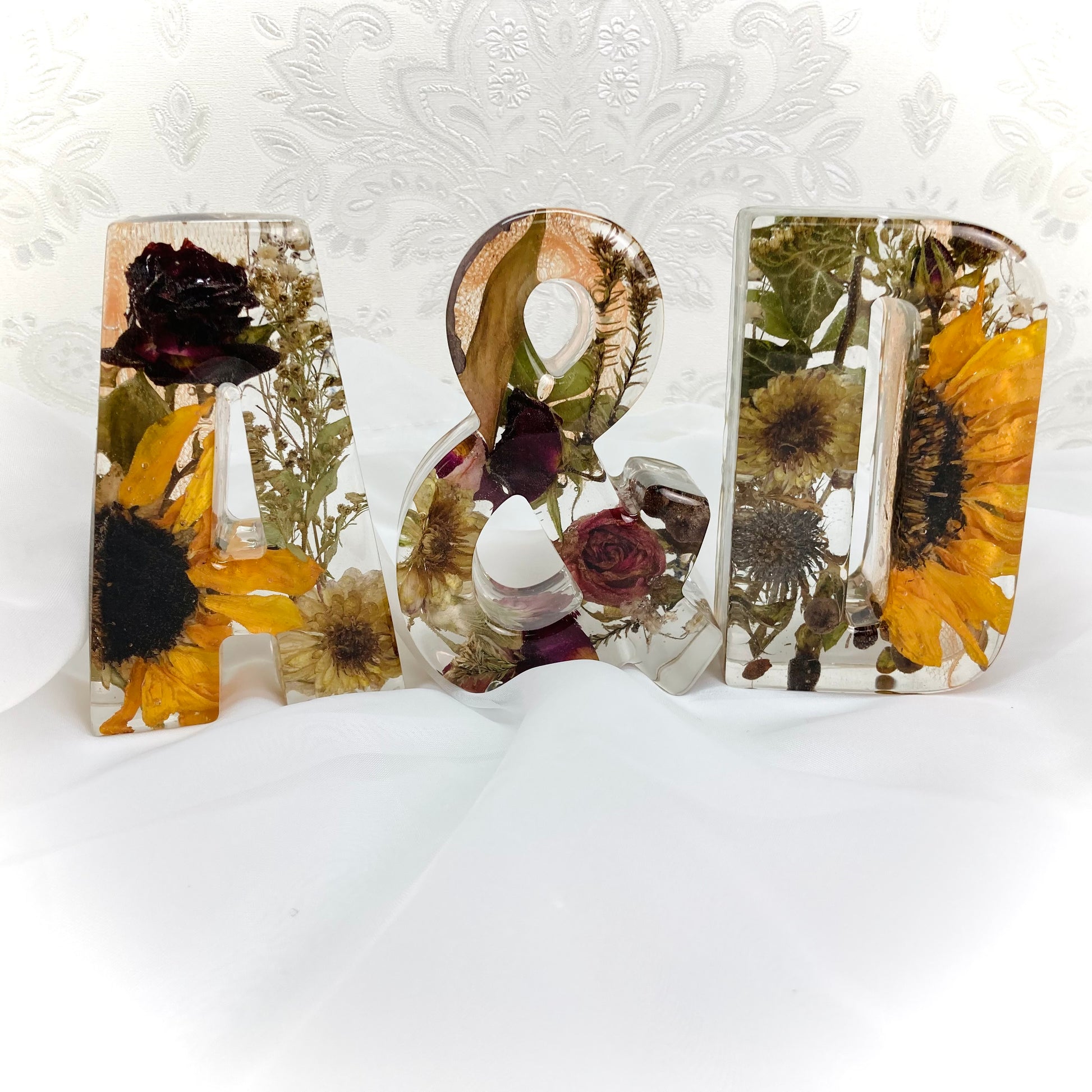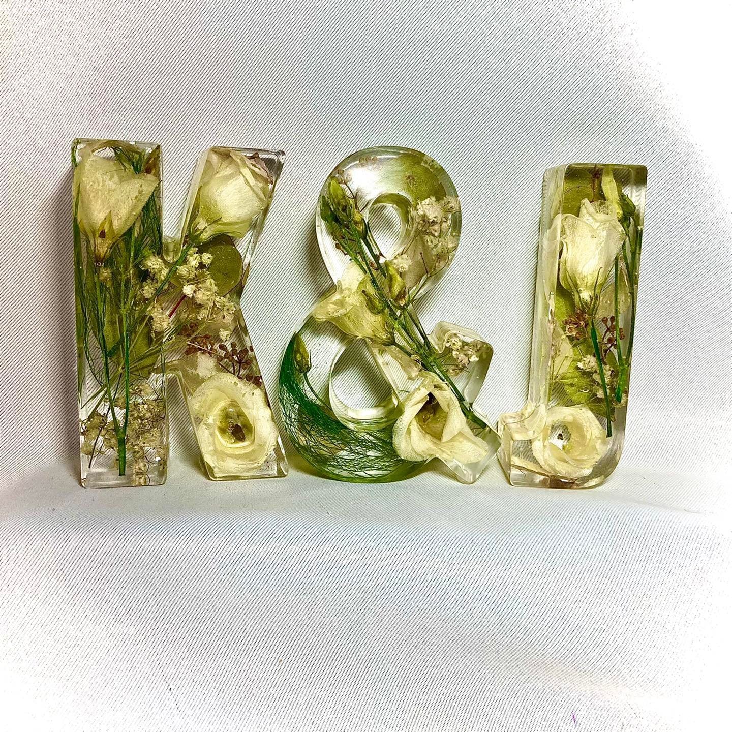 A package of two beautiful 11cm freestanding letter and a ampersand containing your own preserved memorial or wedding flowers.