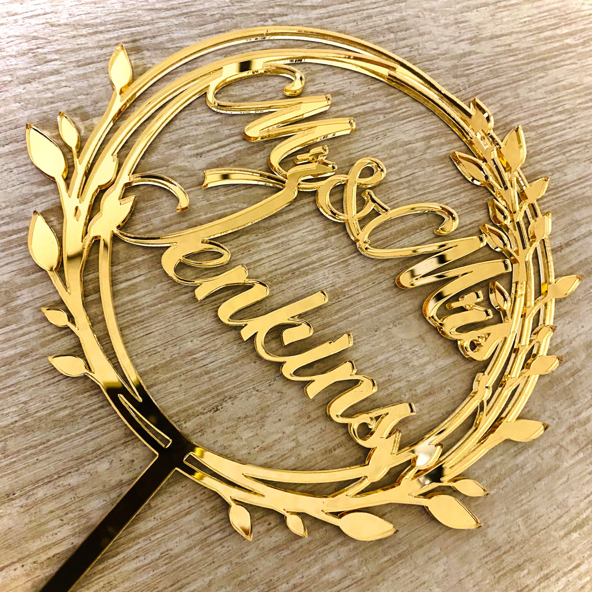 These cake toppers are made from 3mm mirrored gold laser cut and can contain the names and date of your choice.