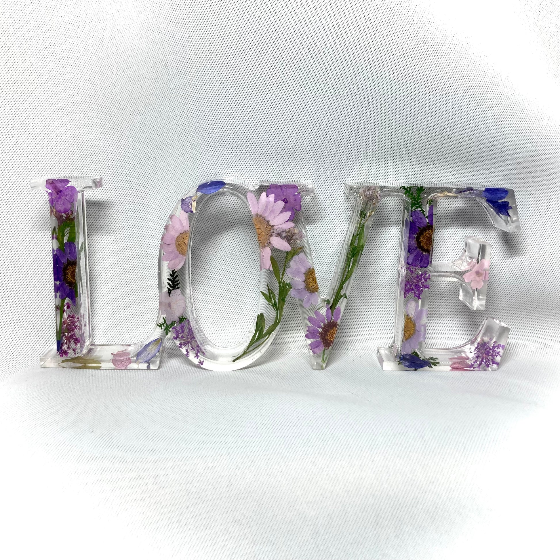 A beautiful freestanding love sign containing purple flowers and foliage.