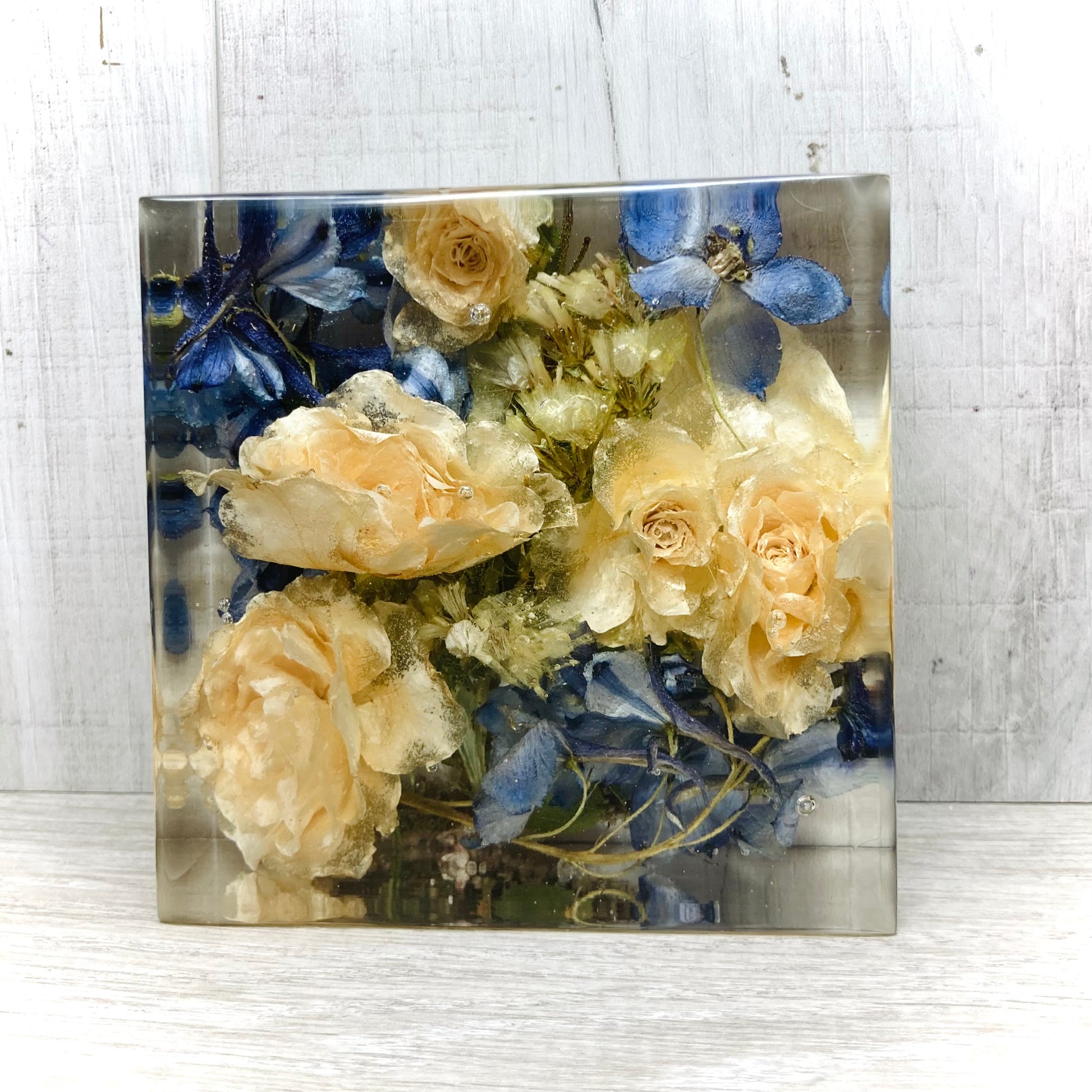 The 10cm display block is a beautiful, square-shaped keepsake that allows you to showcase your preserved flowers in a timeless, front-facing display. Its compact size makes it perfect for preserving medium to small-sized flowers, such as a single rose, creating an elegant and meaningful display that captures the essence of your flowers.