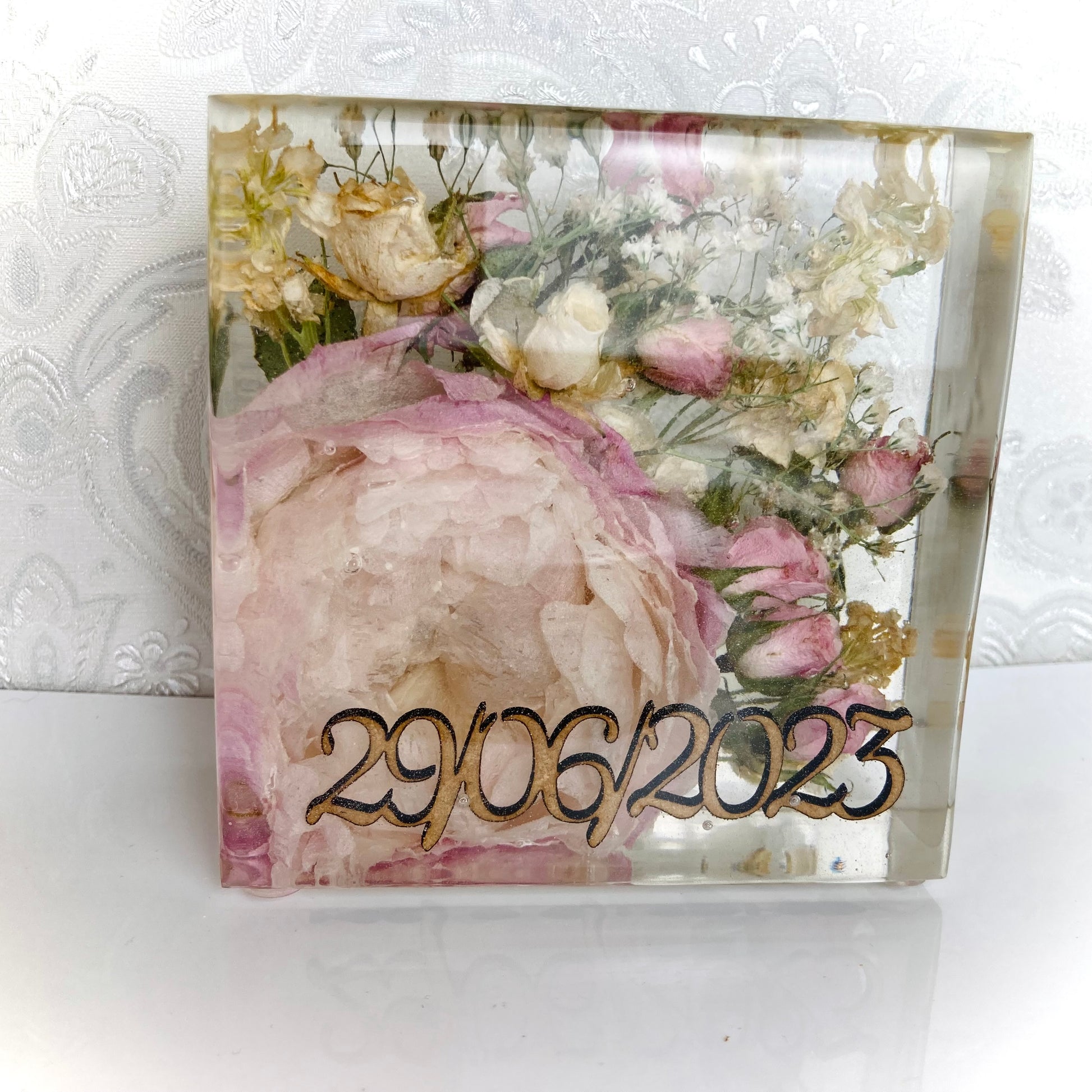 Confetti, ribbon, beads, or other keepsakes can also be preserved if sent with your flowers. Cremation ashes and loved ones’ hair can be included for a more personal touch. Additionally, photos, jewellery, or other cherished items can be incorporated to create a truly meaningful keepsake.