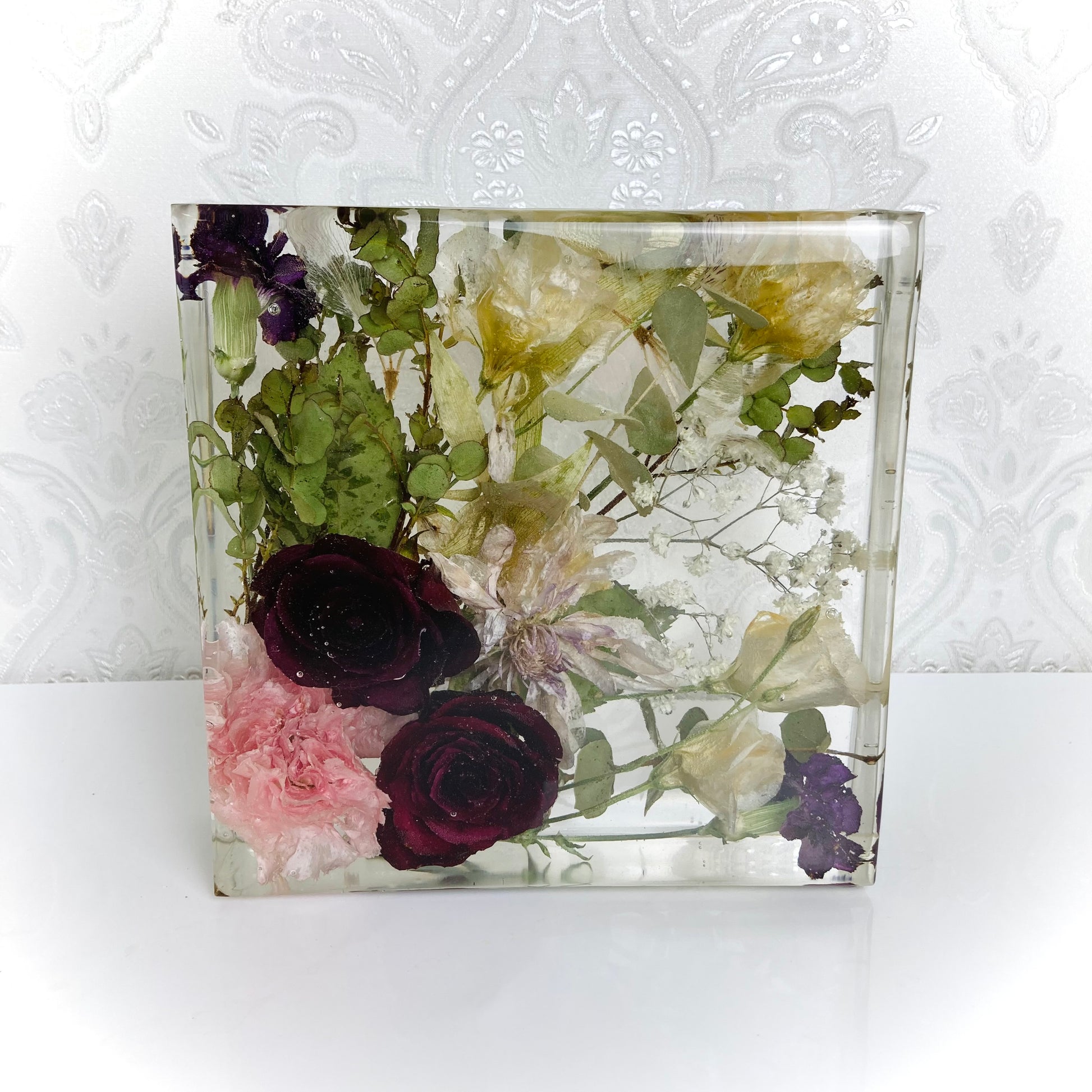 Confetti, ribbon, beads, or other keepsakes can also be preserved if sent with your flowers. Cremation ashes and loved ones’ hair can be included for a more personal touch. Additionally, photos, jewellery, or other cherished items can be incorporated to create a truly meaningful keepsake.
