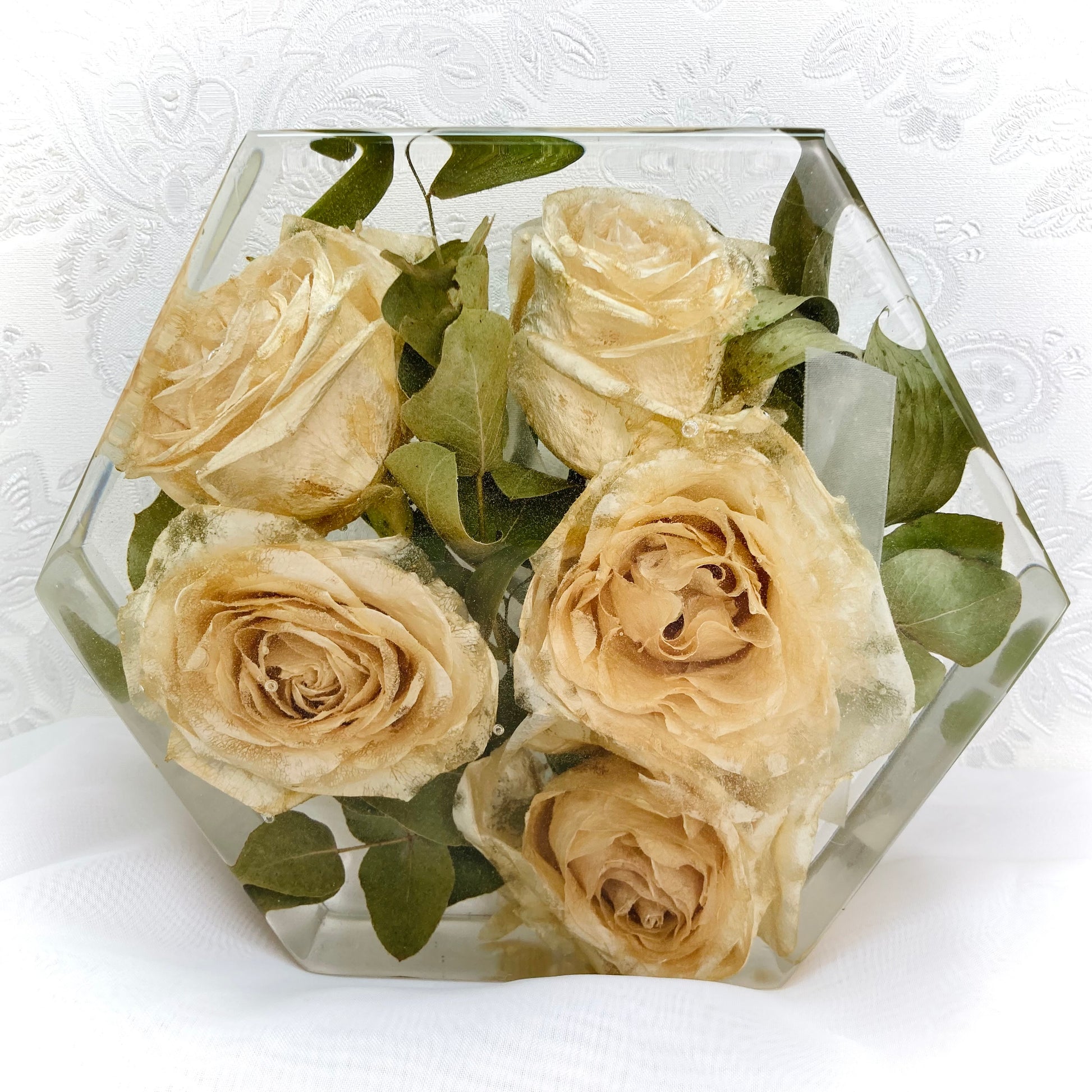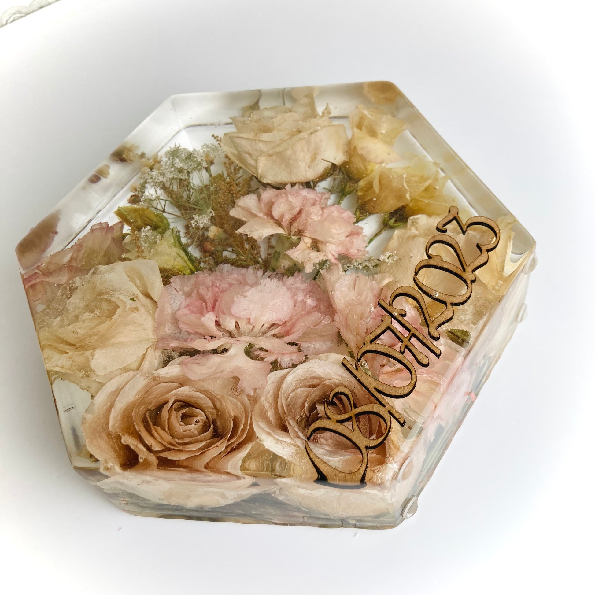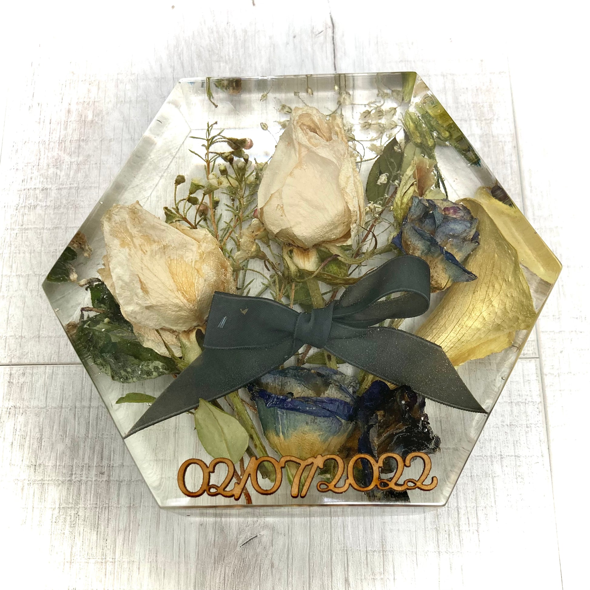 Confetti, ribbon, beads or any other keepsakes can also be preserved if it has been sent with your flowers.
