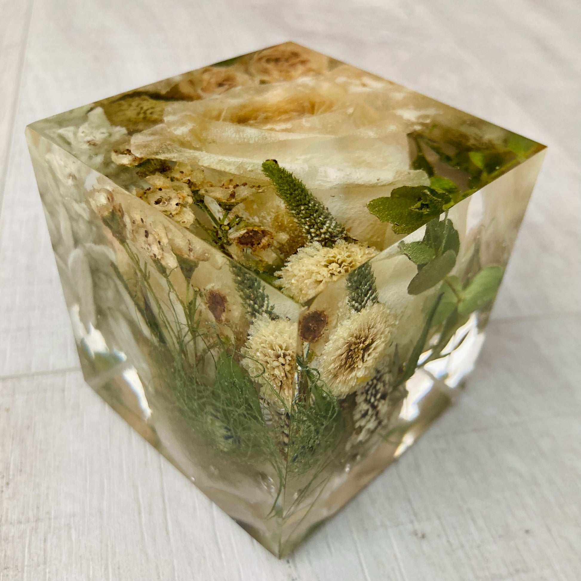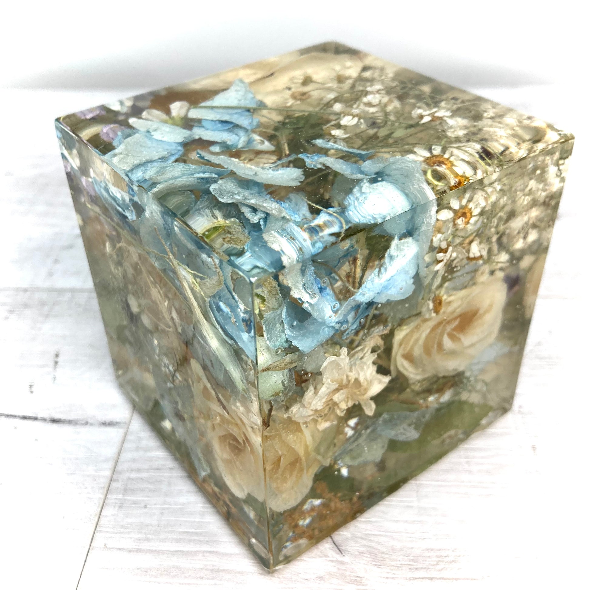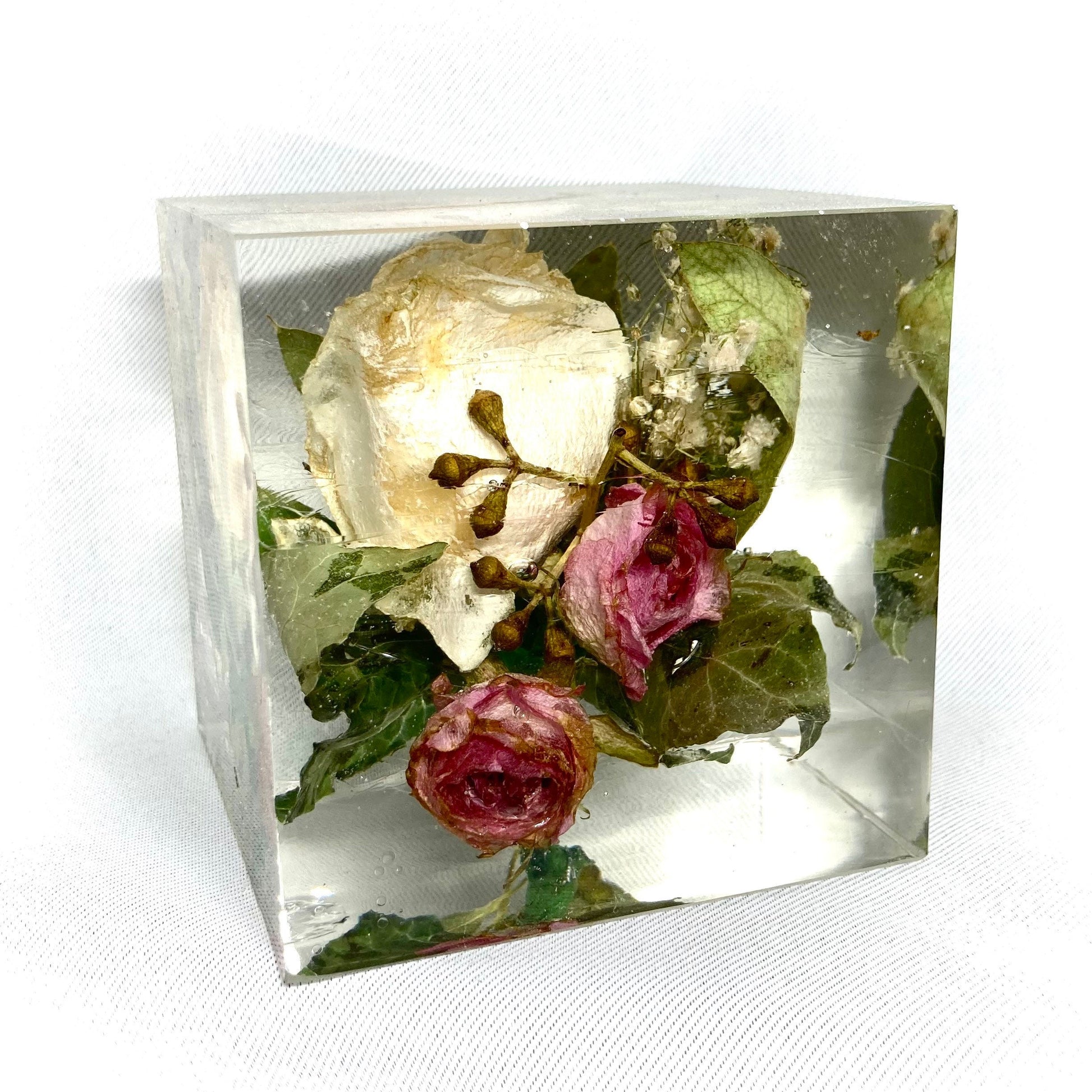 Our 8cm cube is a compact and affordable way to preserve your cherished flowers while creating a unique keepsake. Its design allows you to enjoy a beautiful 3D view of your flowers from every angle, making it a perfect display piece for any space especially a mantle piece or a desk.