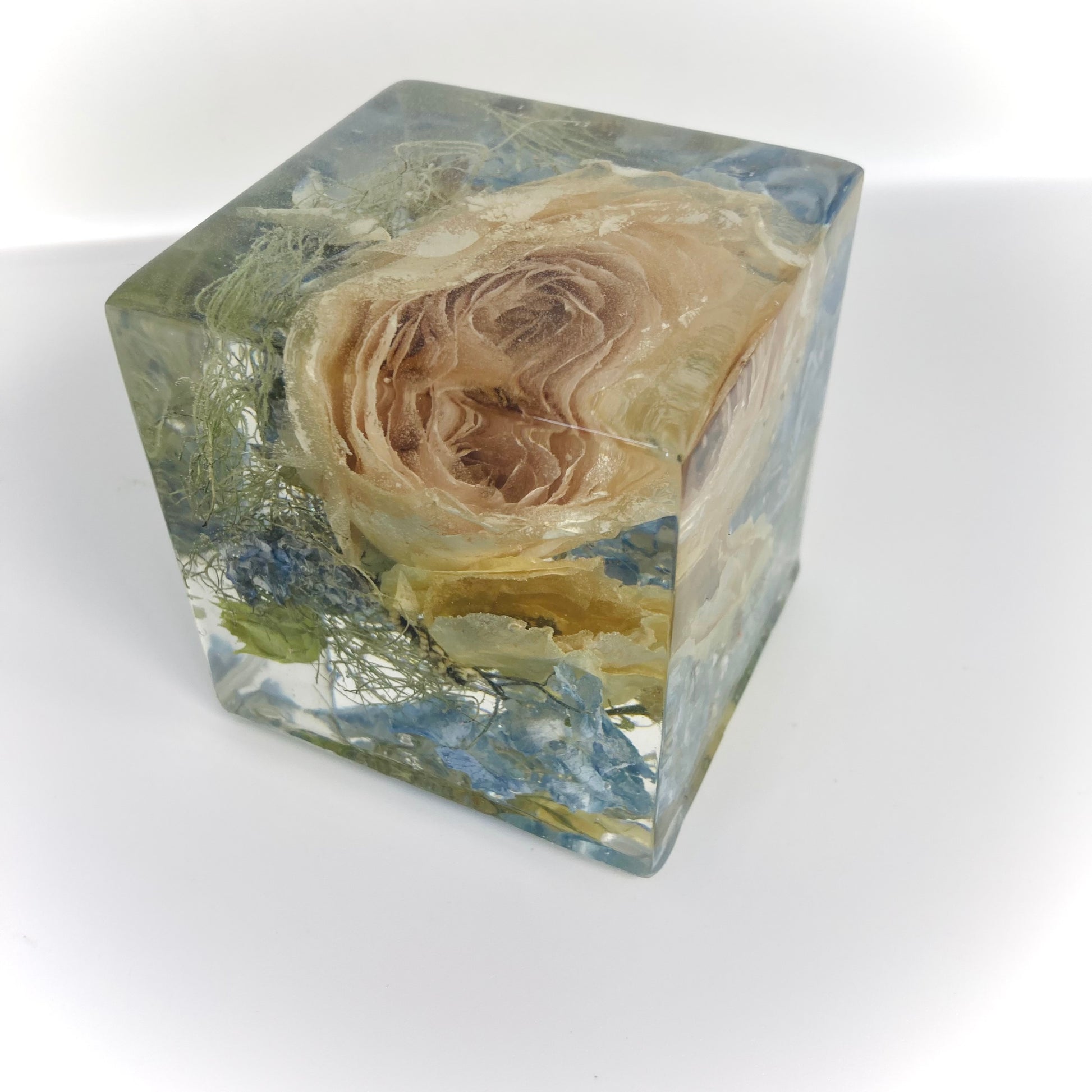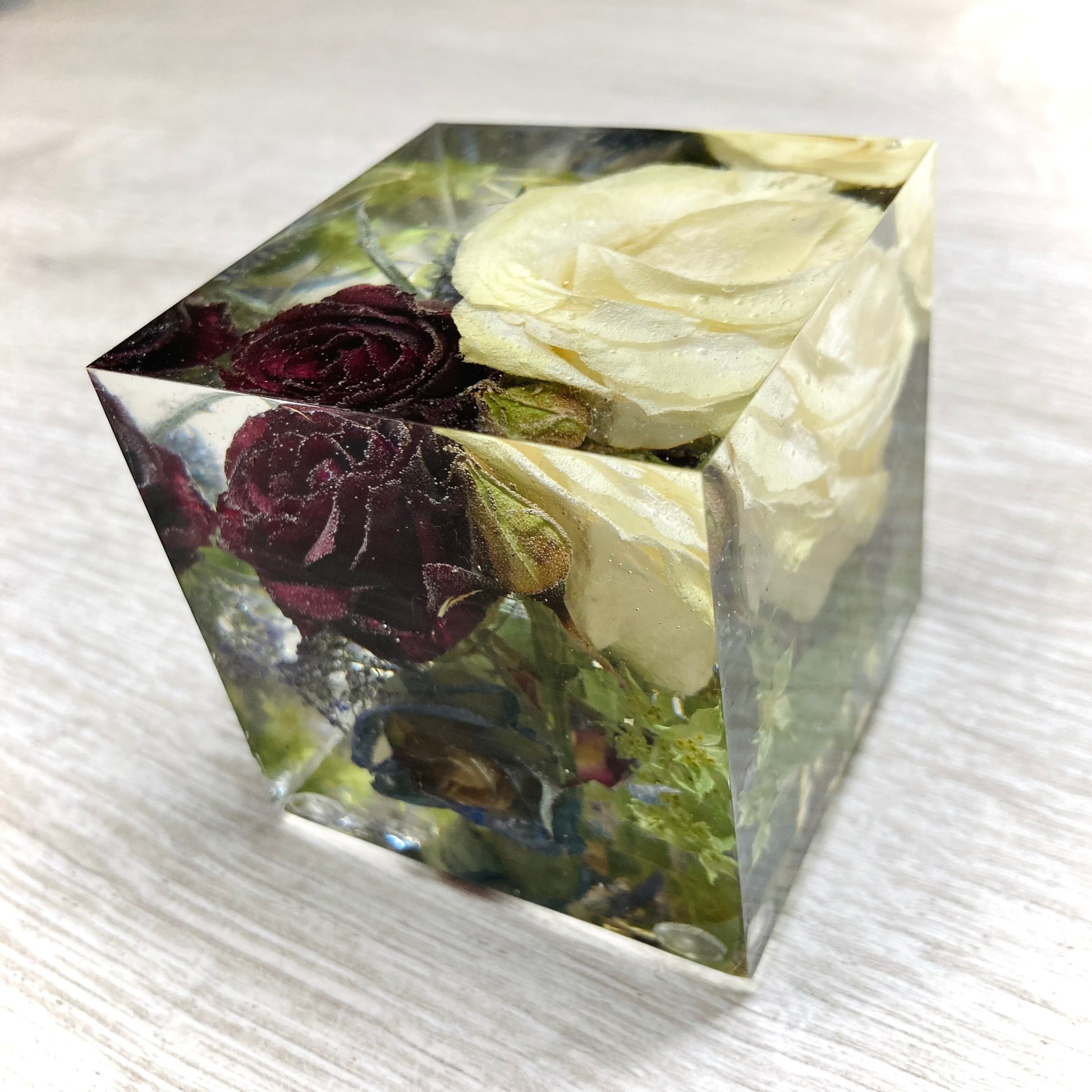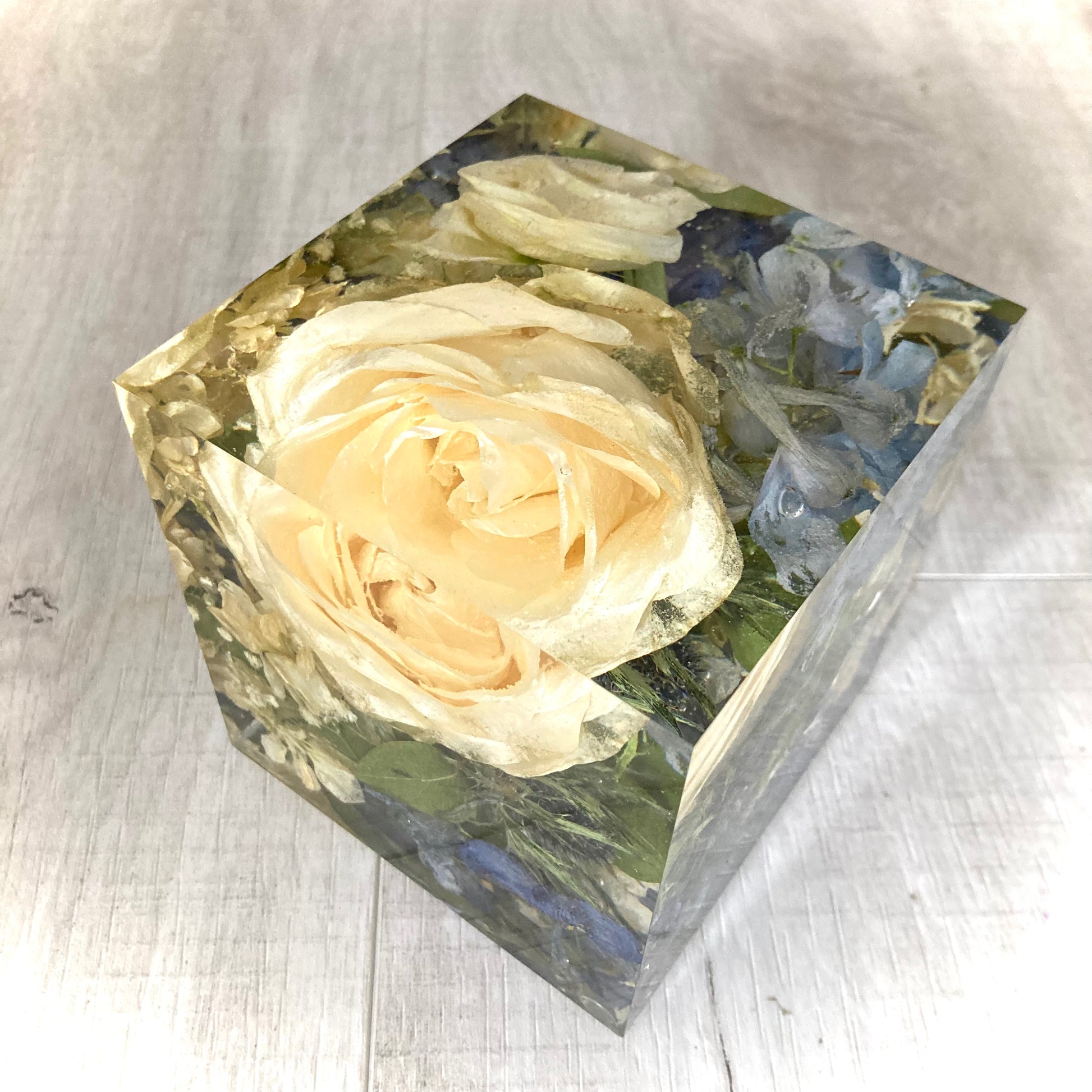 Our 8cm cube is a compact and affordable way to preserve your cherished flowers while creating a unique keepsake. Its design allows you to enjoy a beautiful 3D view of your flowers from every angle, making it a perfect display piece for any space especially a mantle piece or a desk.