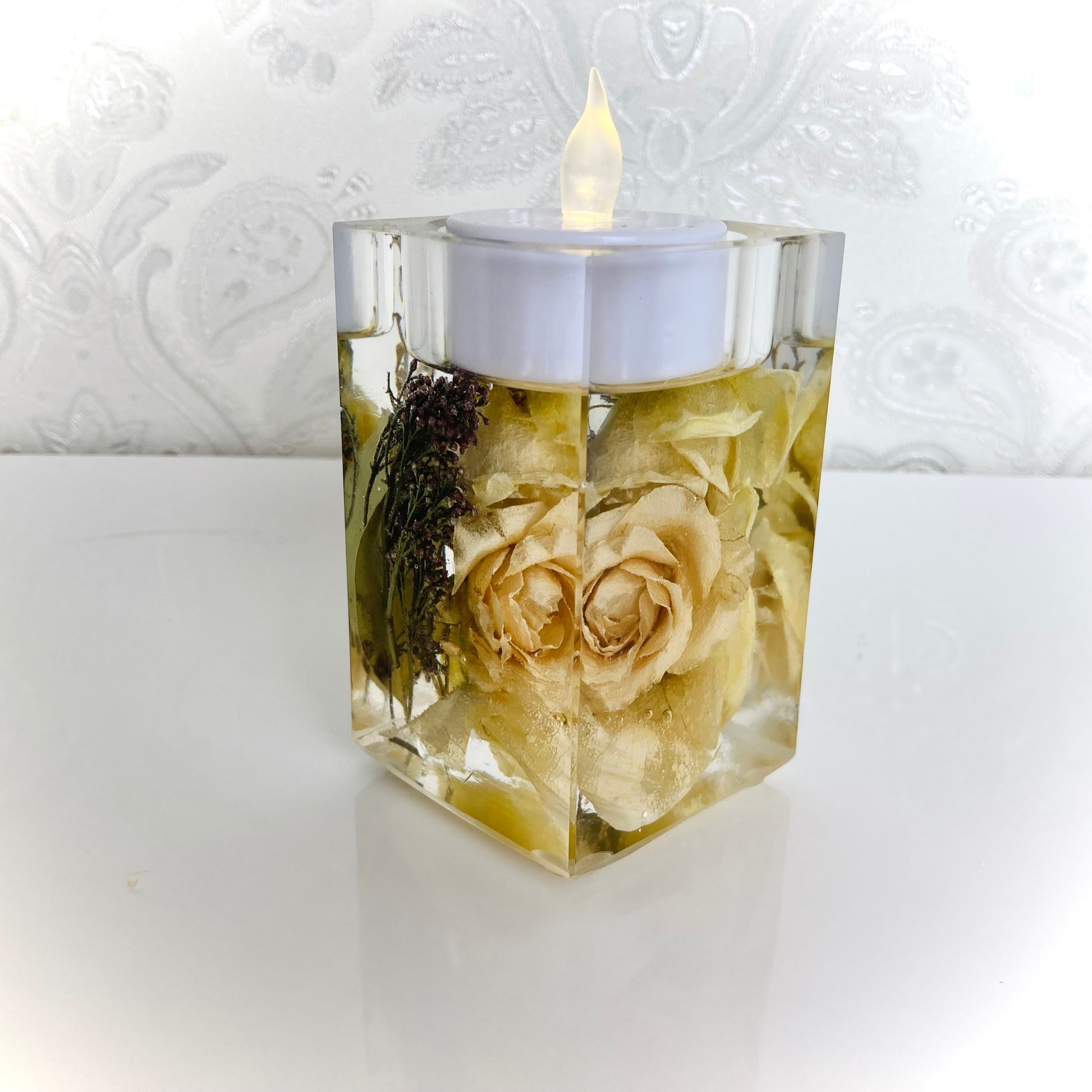 A beautiful pillar tea light holder containing your own real dried flowers and foliage. This is tea light holder is 8cm tall and 5cm across so suitable for small spray roses, small flowers and foliage. If your flowers are larger we will use petals and pieces of petals to complete the piece.