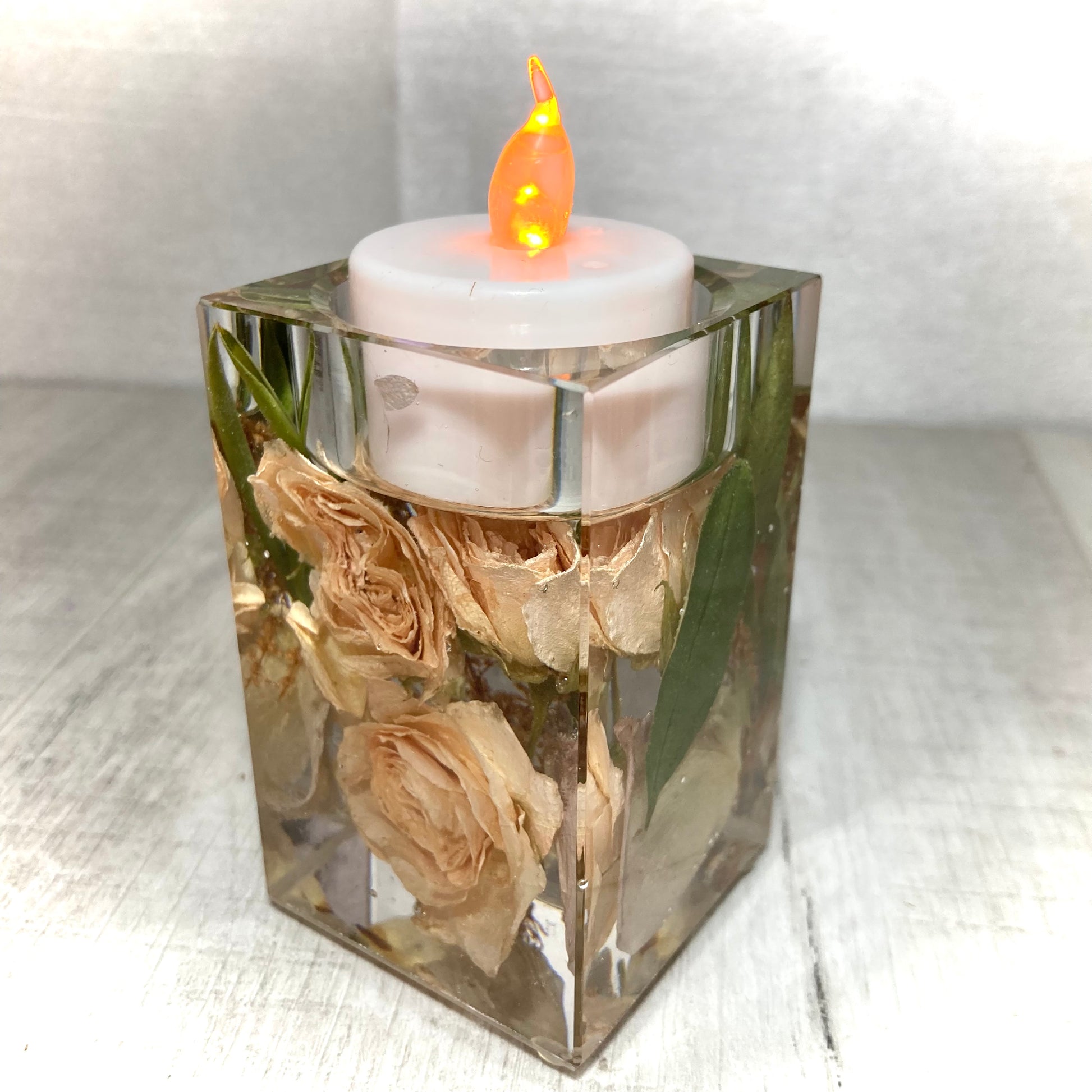 Resin is NOT high enough heat resistance for a real candle we will supply a electric tea light with your keepsake. Do not use a real flame candle with this item.