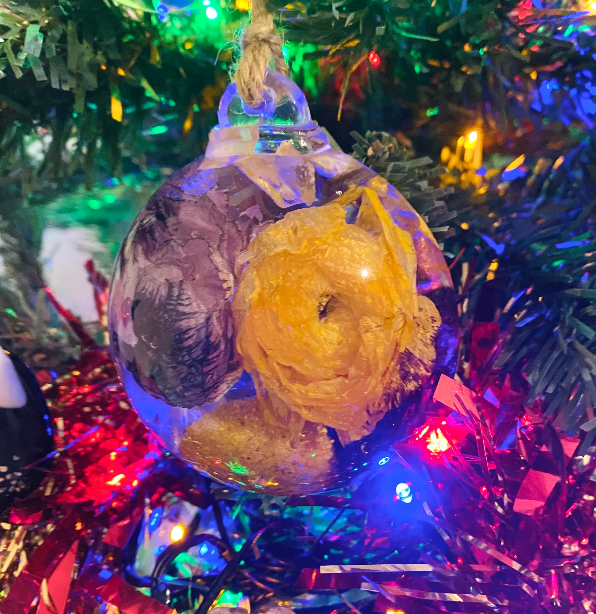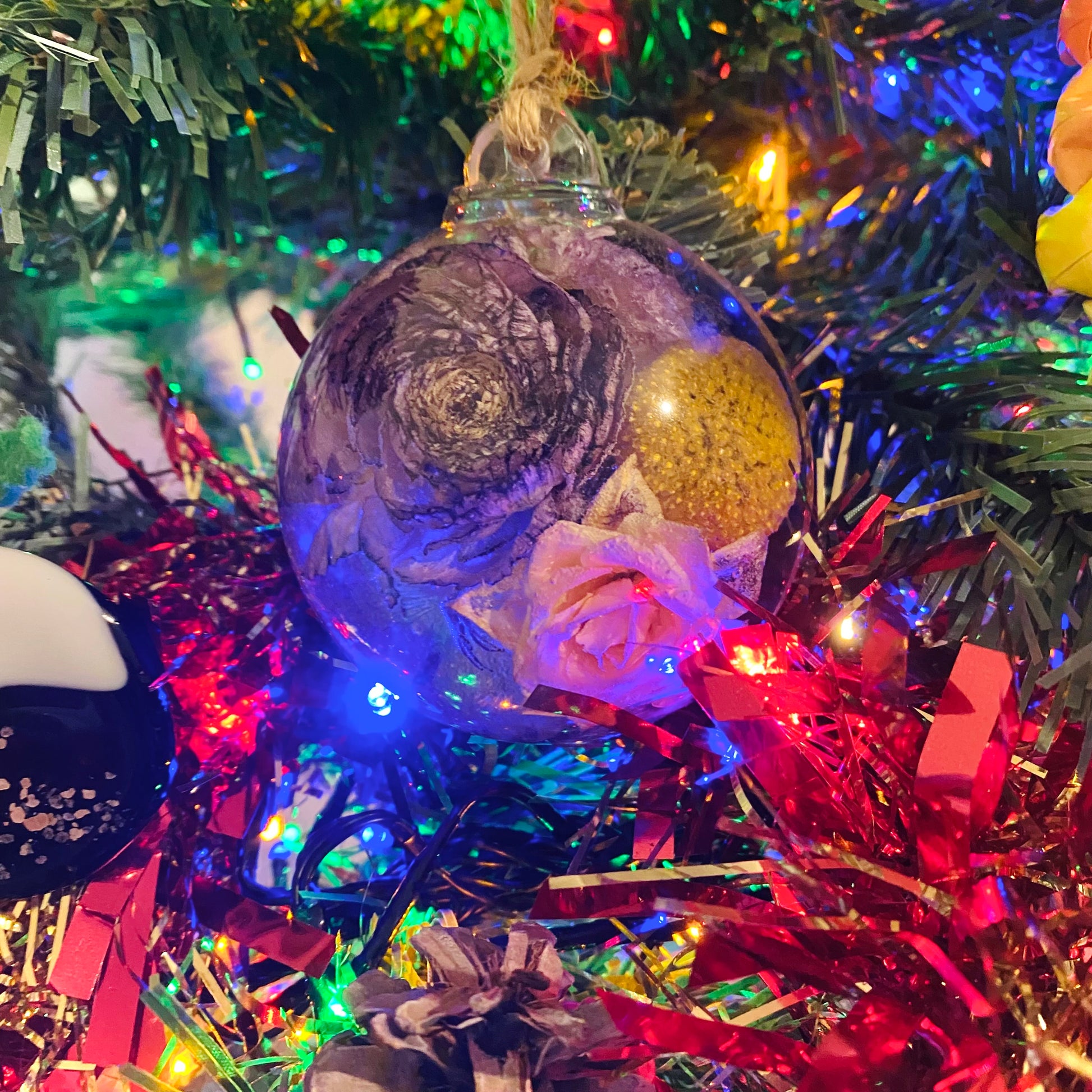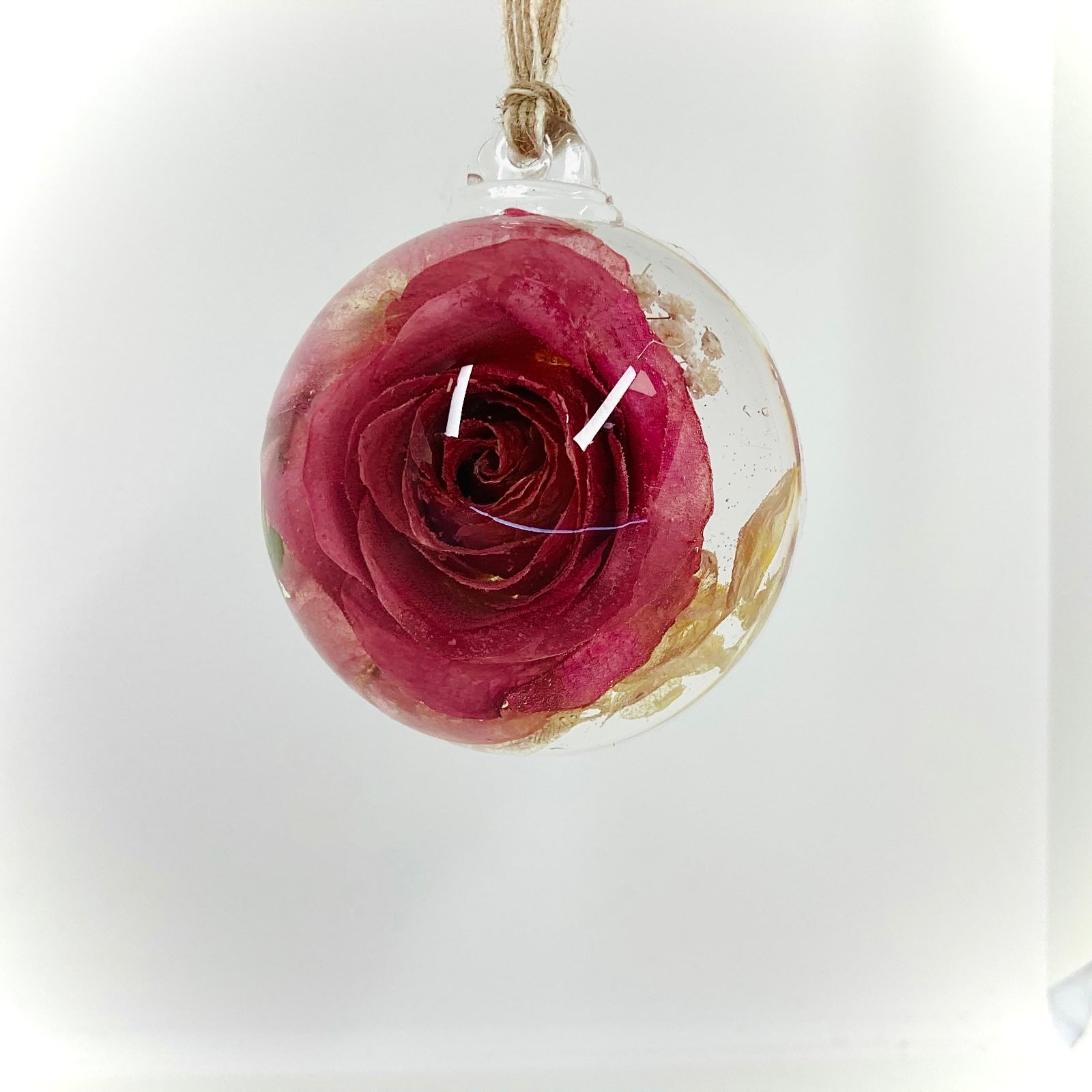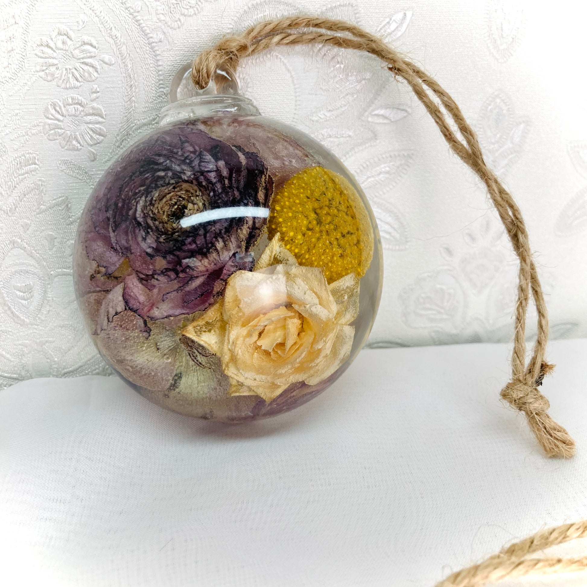This stunning resin bauble is the perfect way to preserve your cherished wedding flowers. Handcrafted with the utmost care and attention to detail, this bauble is not only a beautiful memento but also a lovely reminder every year when you put up your Christmas tree.