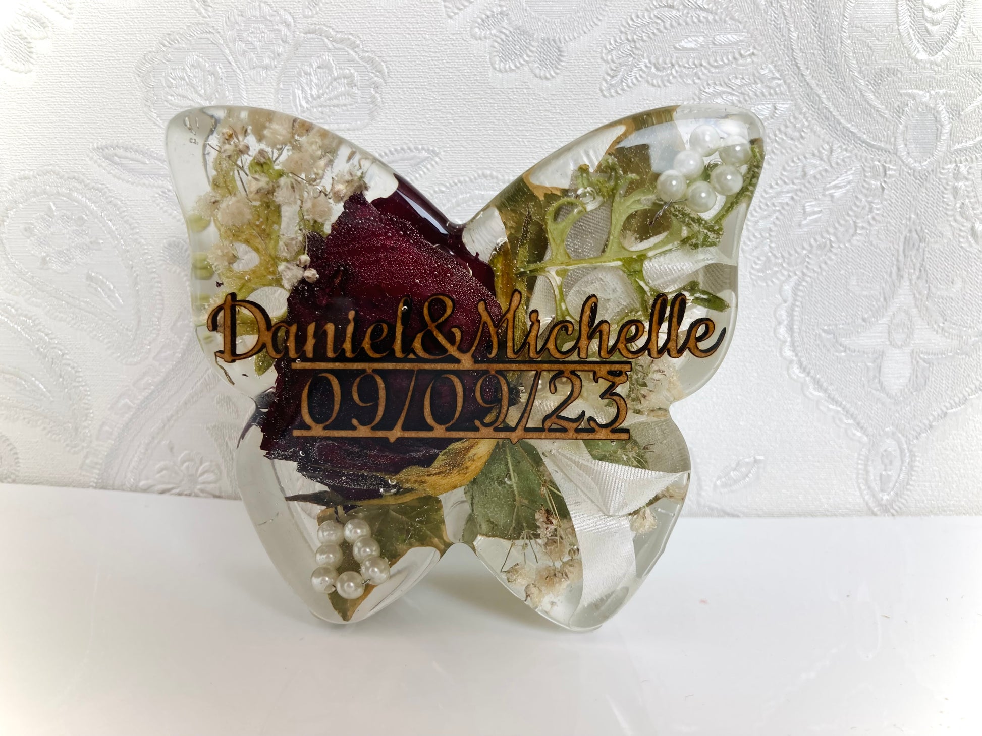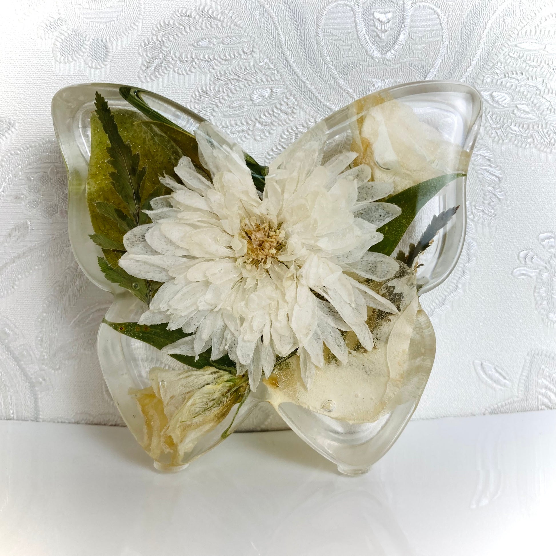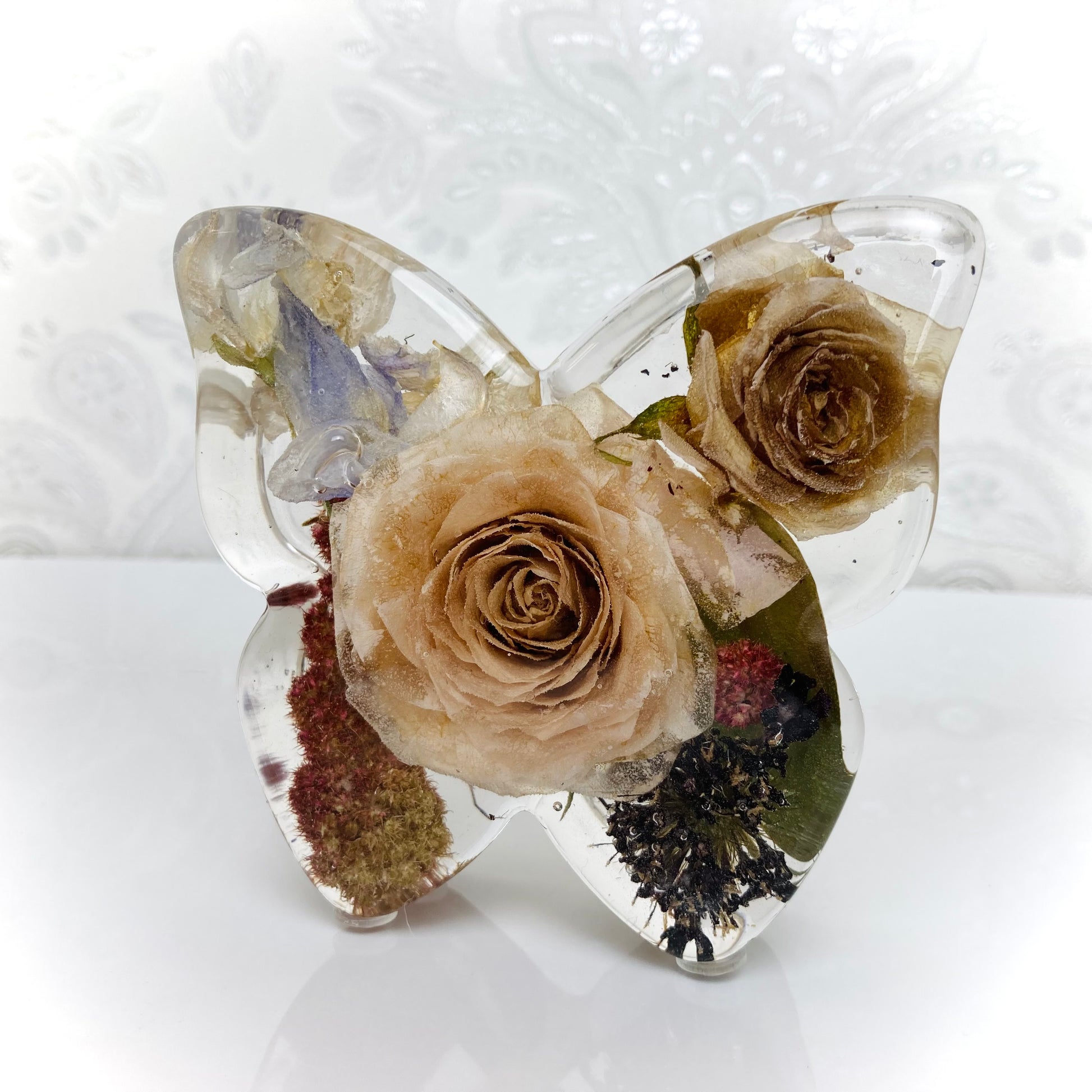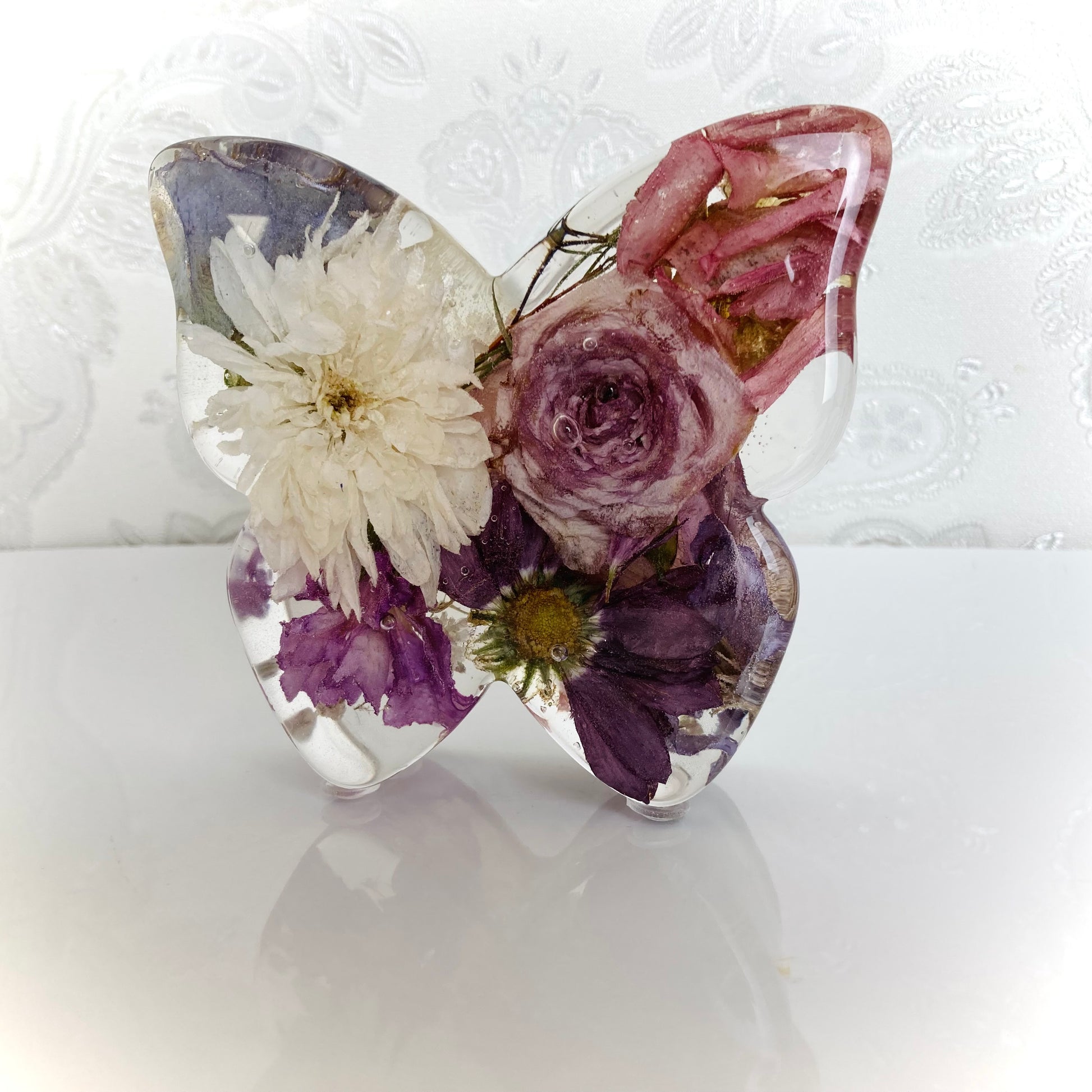 A beautiful resin freestanding butterfly containing your own real dried flowers and foliage. This butterfly is 9cm across and 2.5cm deep so suitable for small spray roses, small flowers and foliage. If your flowers are larger we will use petals and pieces of petals to complete the piece.