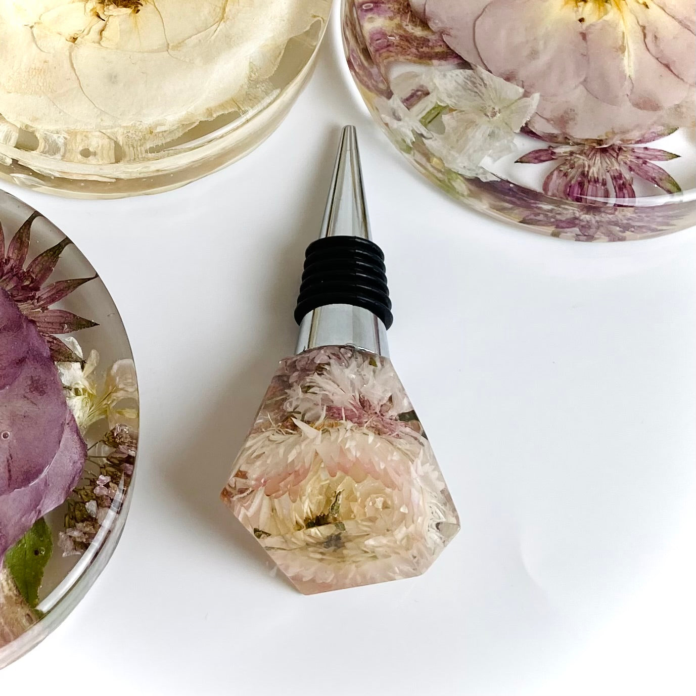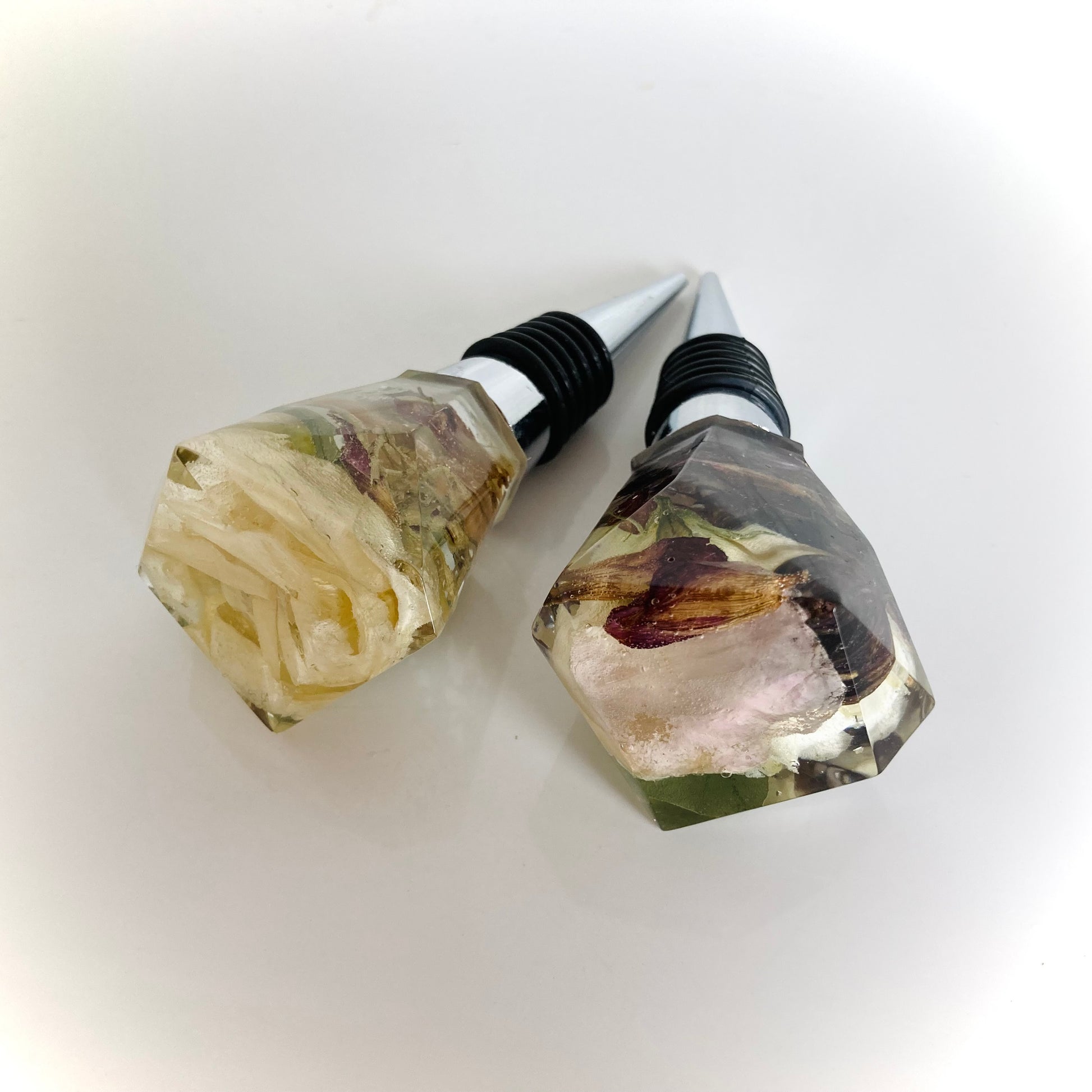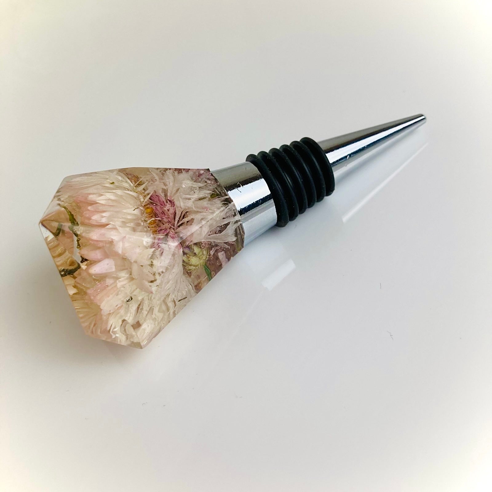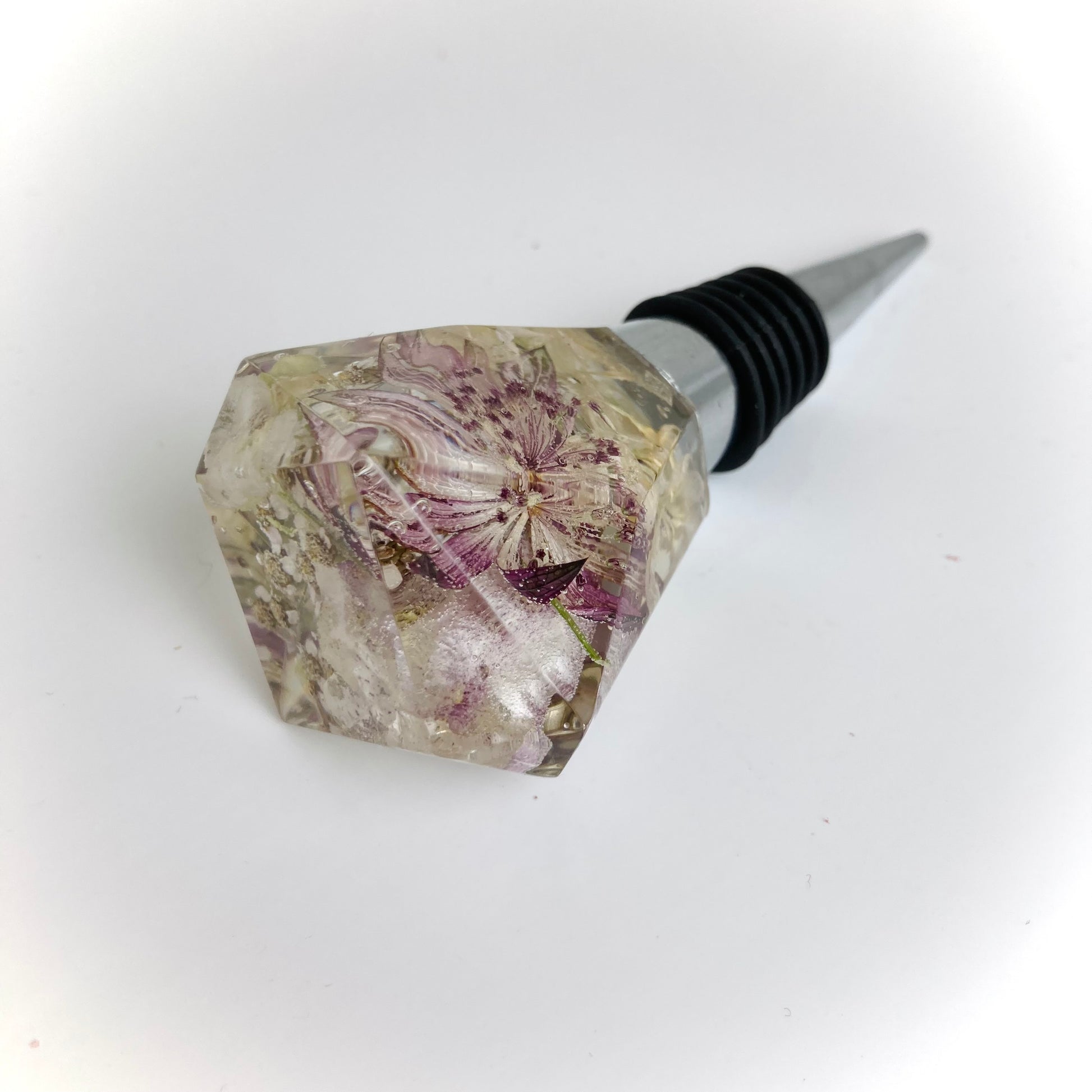 A beautiful crystal shaped wine bottle stopper containing your own preserved wedding or funeral flowers and foliage.