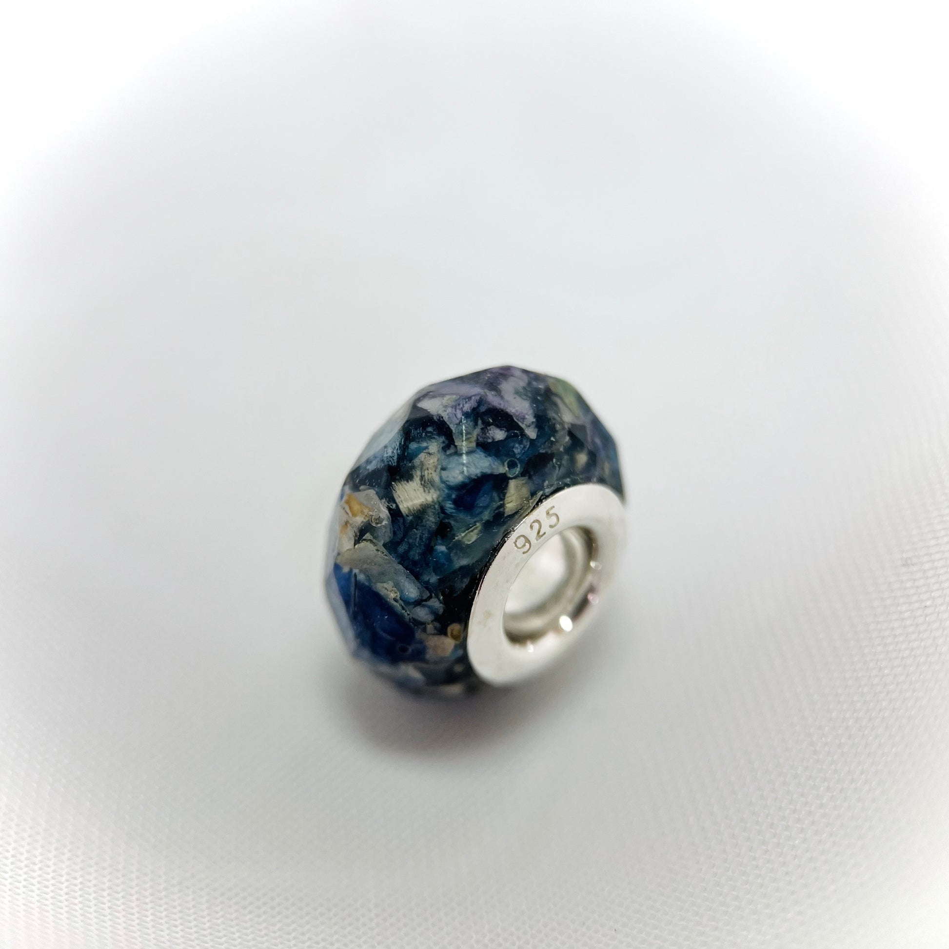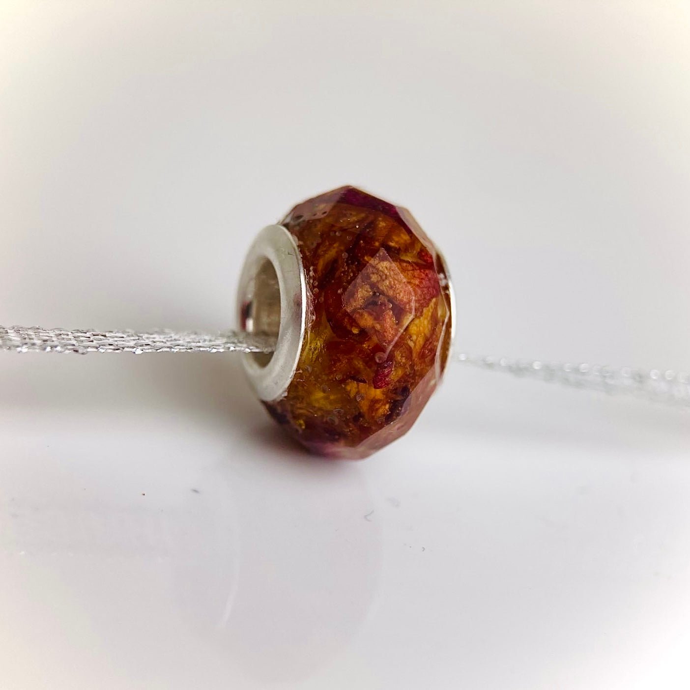A beautiful faceted bead charm with a 5mm sterling silver centre containing your own real dried flowers and foliage. These charms are suitable to put on a necklace or a popular charm bracelet.