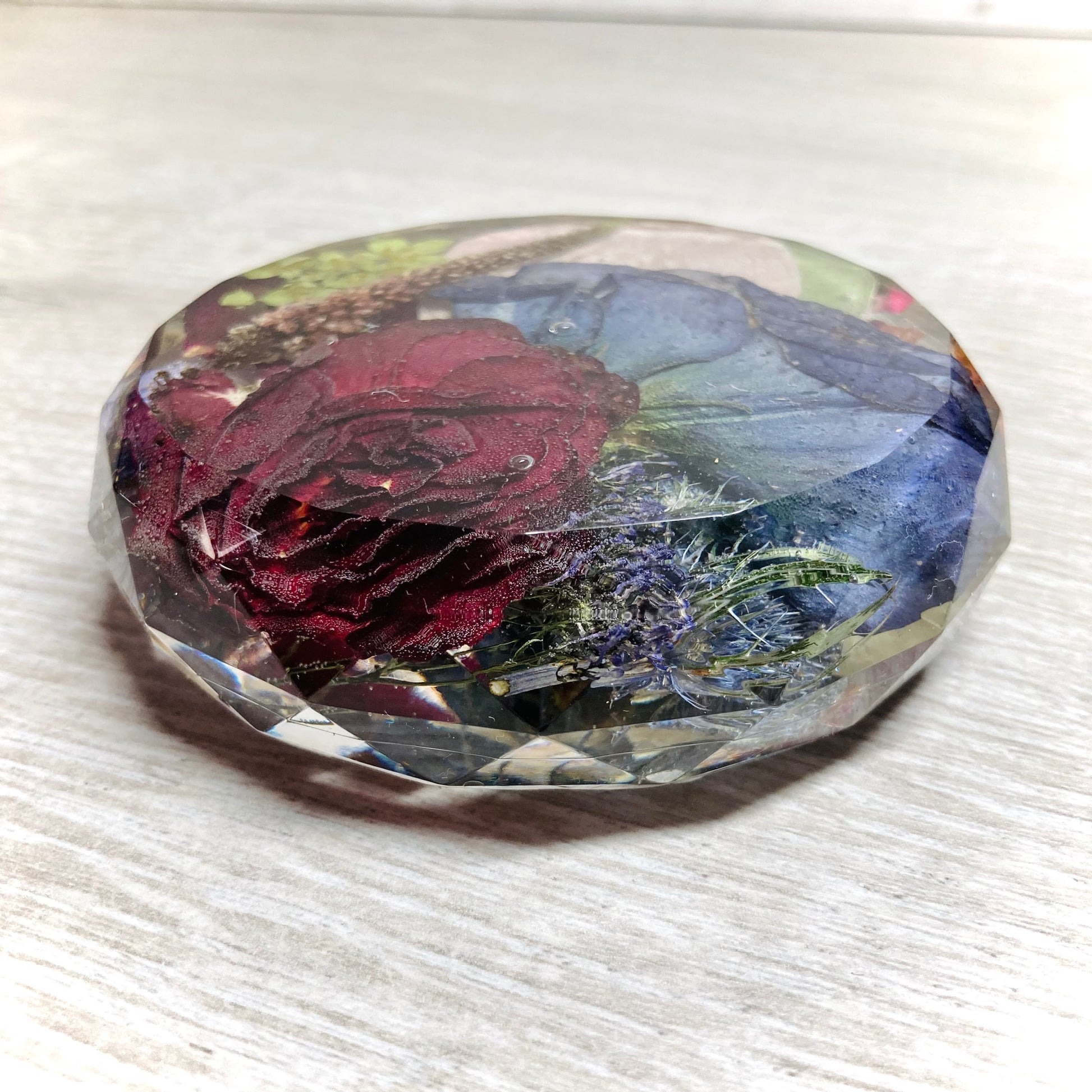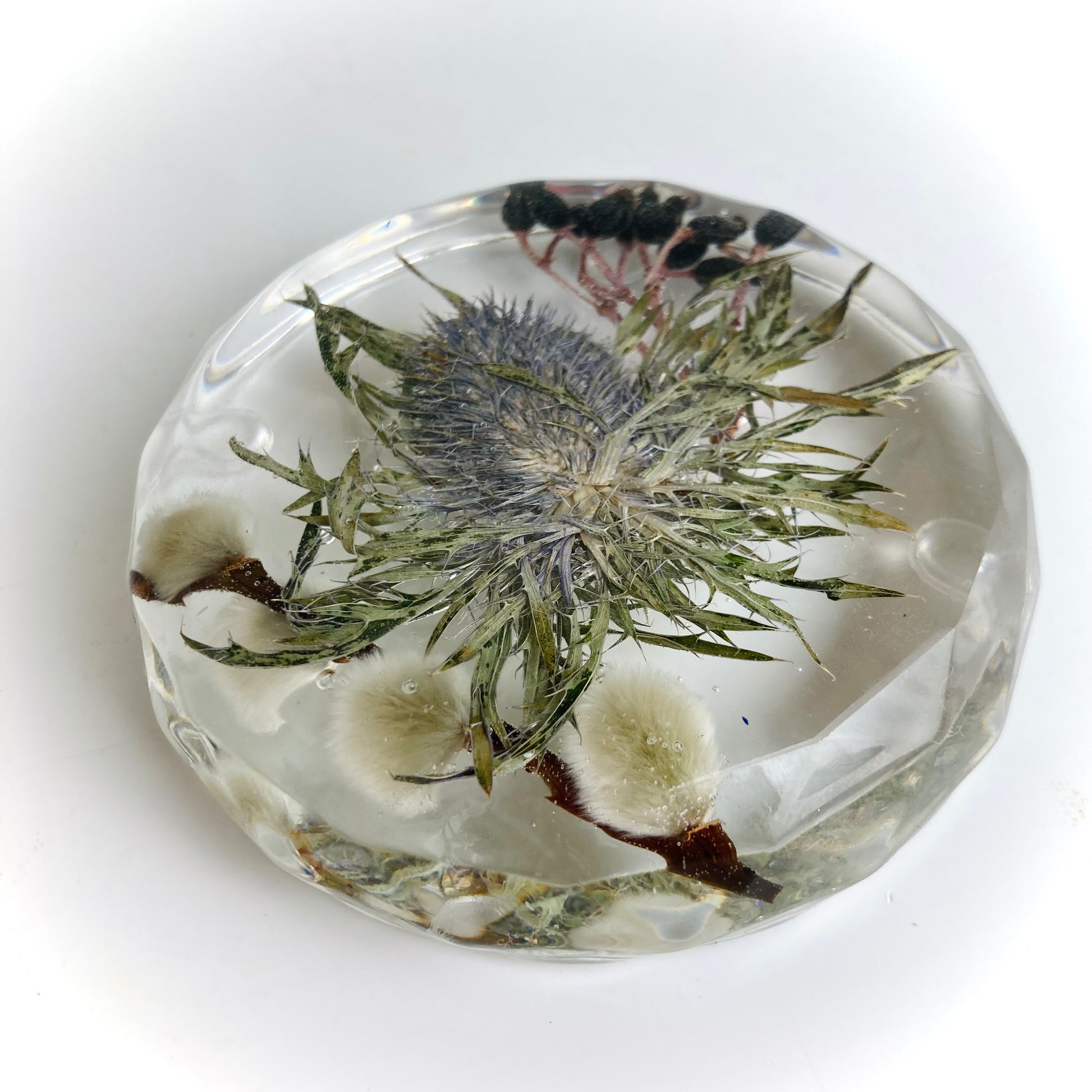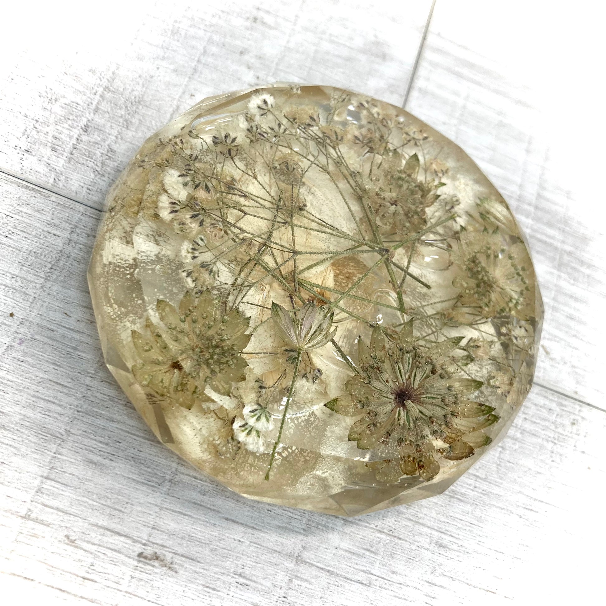 A beautiful 10cm faceted heat resistant drinks coaster containing your own preserved dried and foliage.