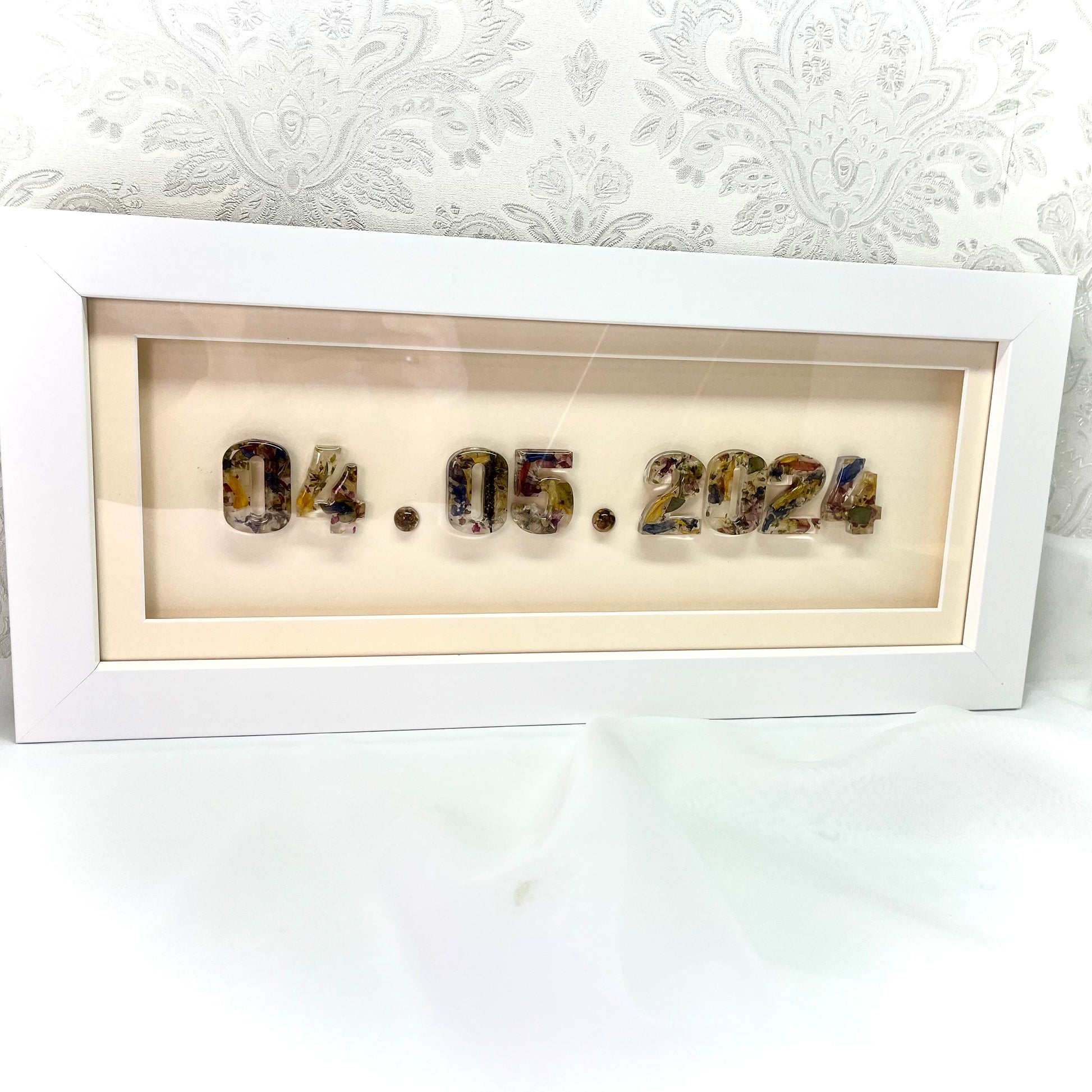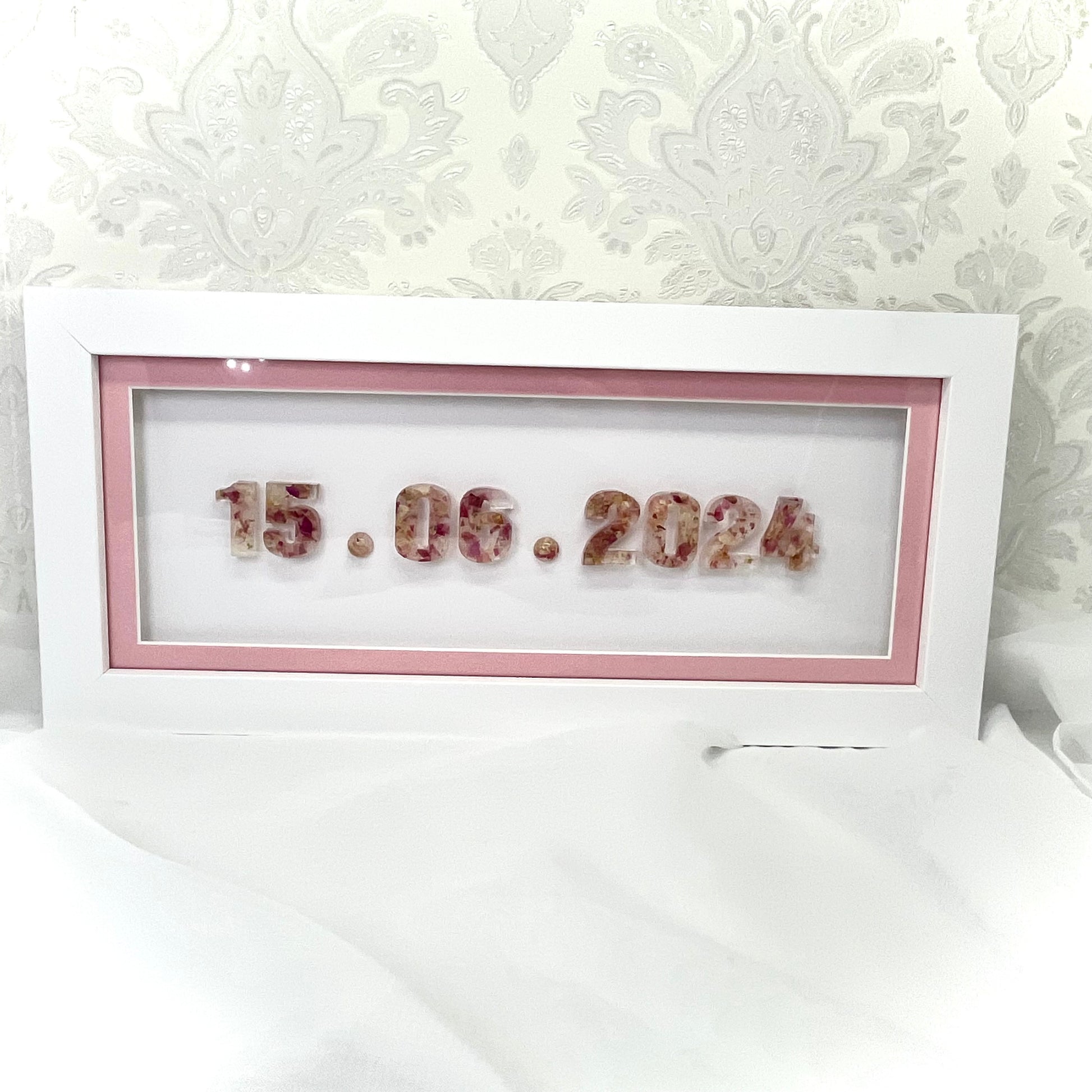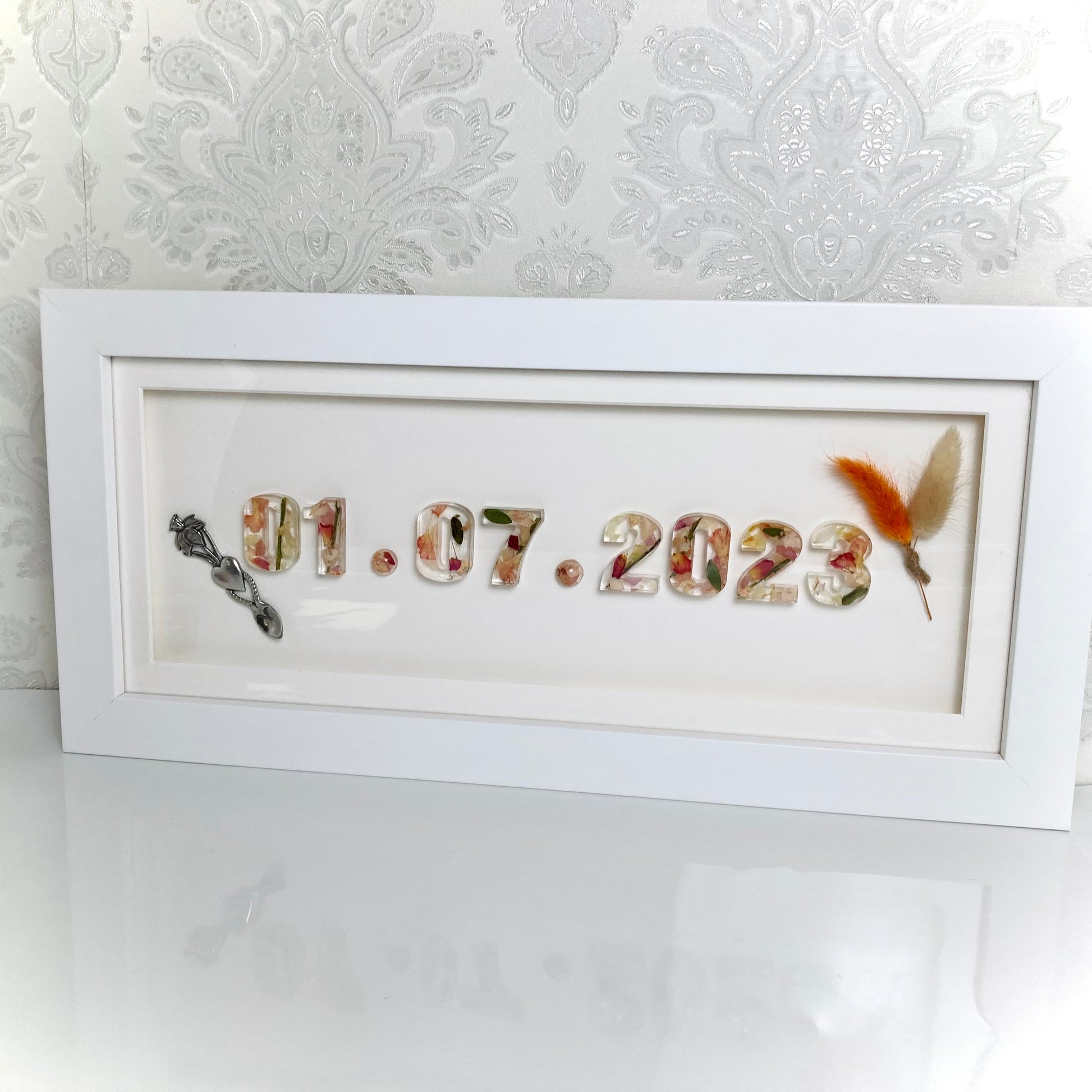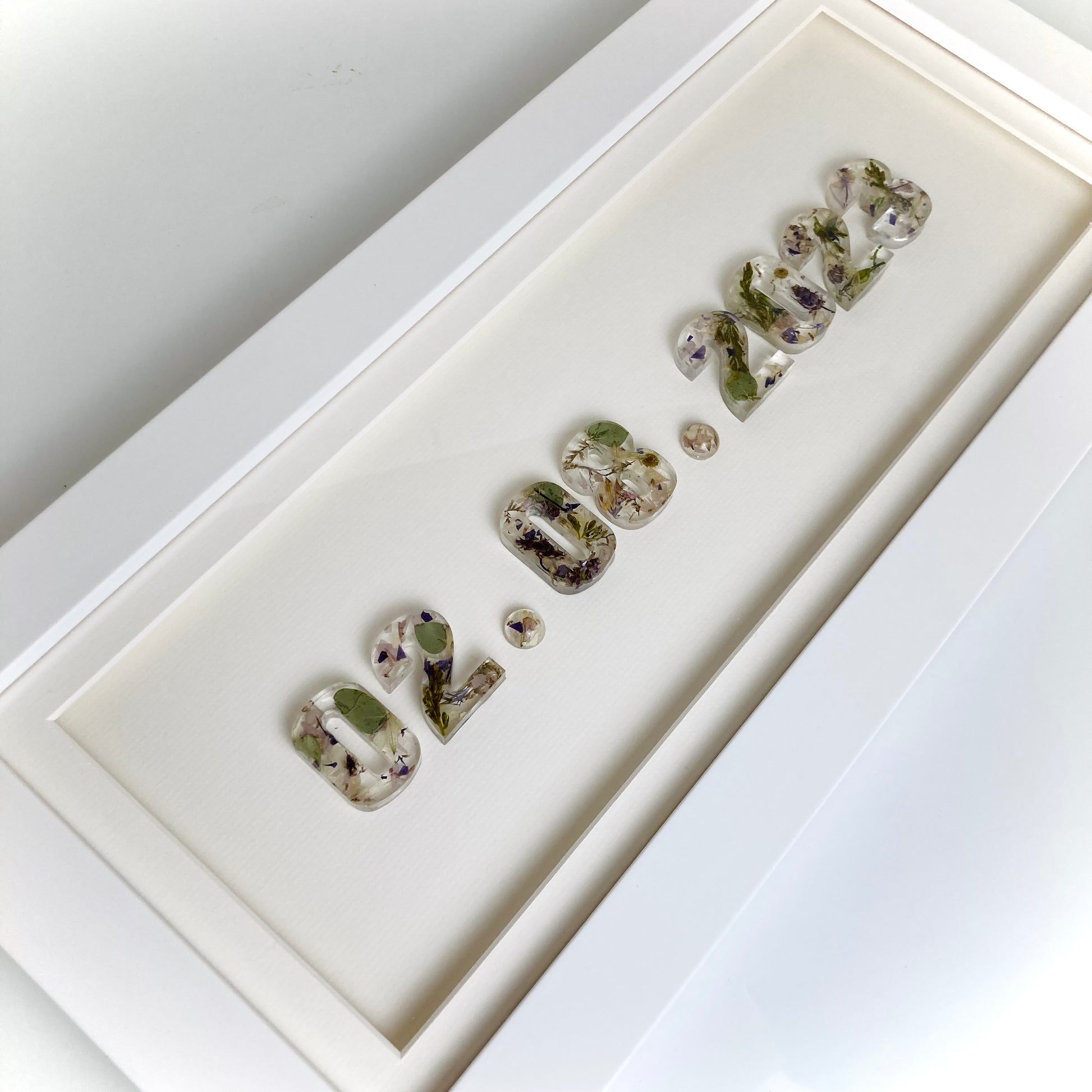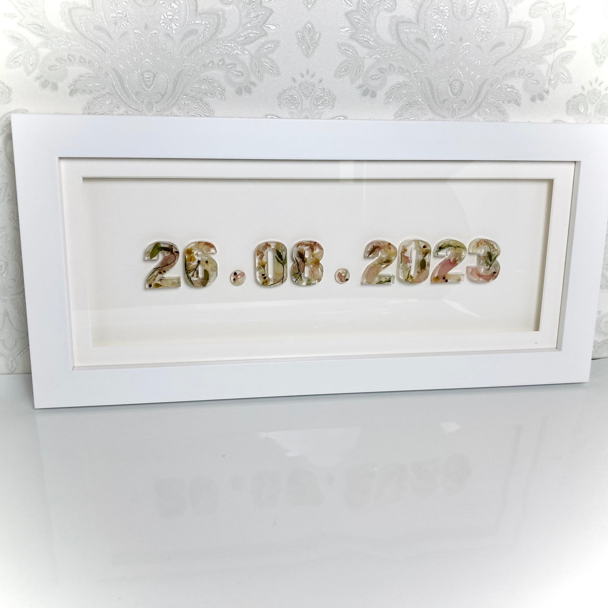 A beautiful framed date containing your own preserved wedding or funeral flowers and foliage. The frame pictured is just an example tour frame could contain your flowers preserved into letters such as your surname.