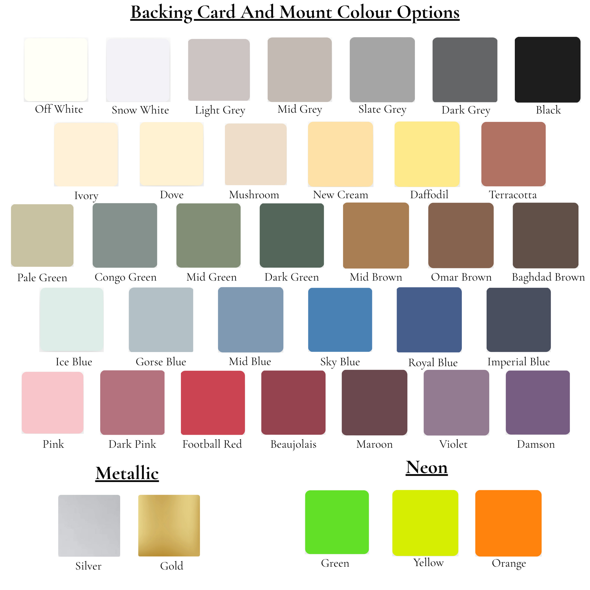 Make your preservation frame truly unique by selecting the backing card and mount color from our extensive range of options. When placing your order, simply specify your preferred color from the choices displayed in our photos. If no colour is specified, you will receive a white backing card and mount.
