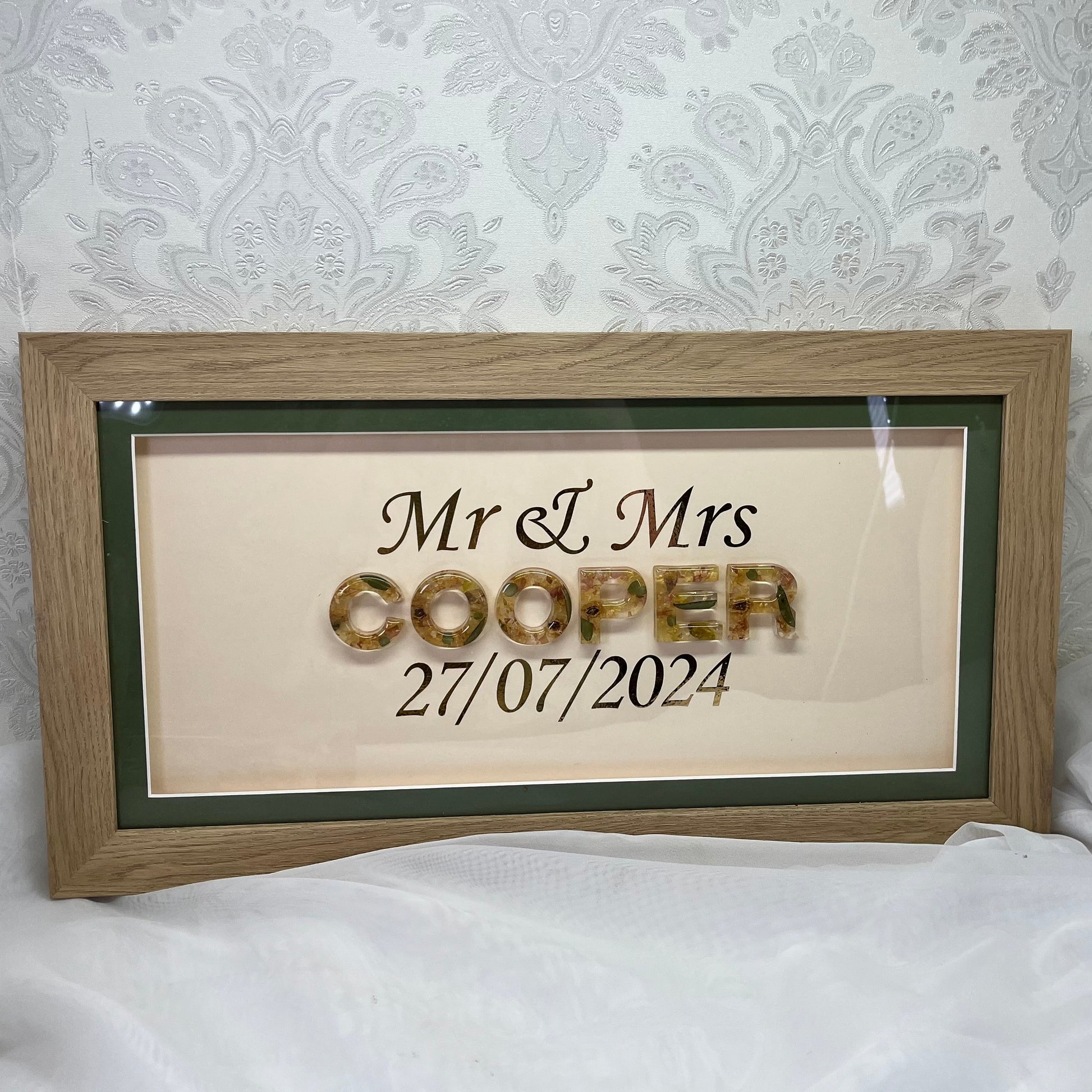 A beautiful framed surname containing your own preserved wedding or funeral flowers and foliage. The frame pictured is a example of one we have previously made, the text can be personalised to say whatever you would like.