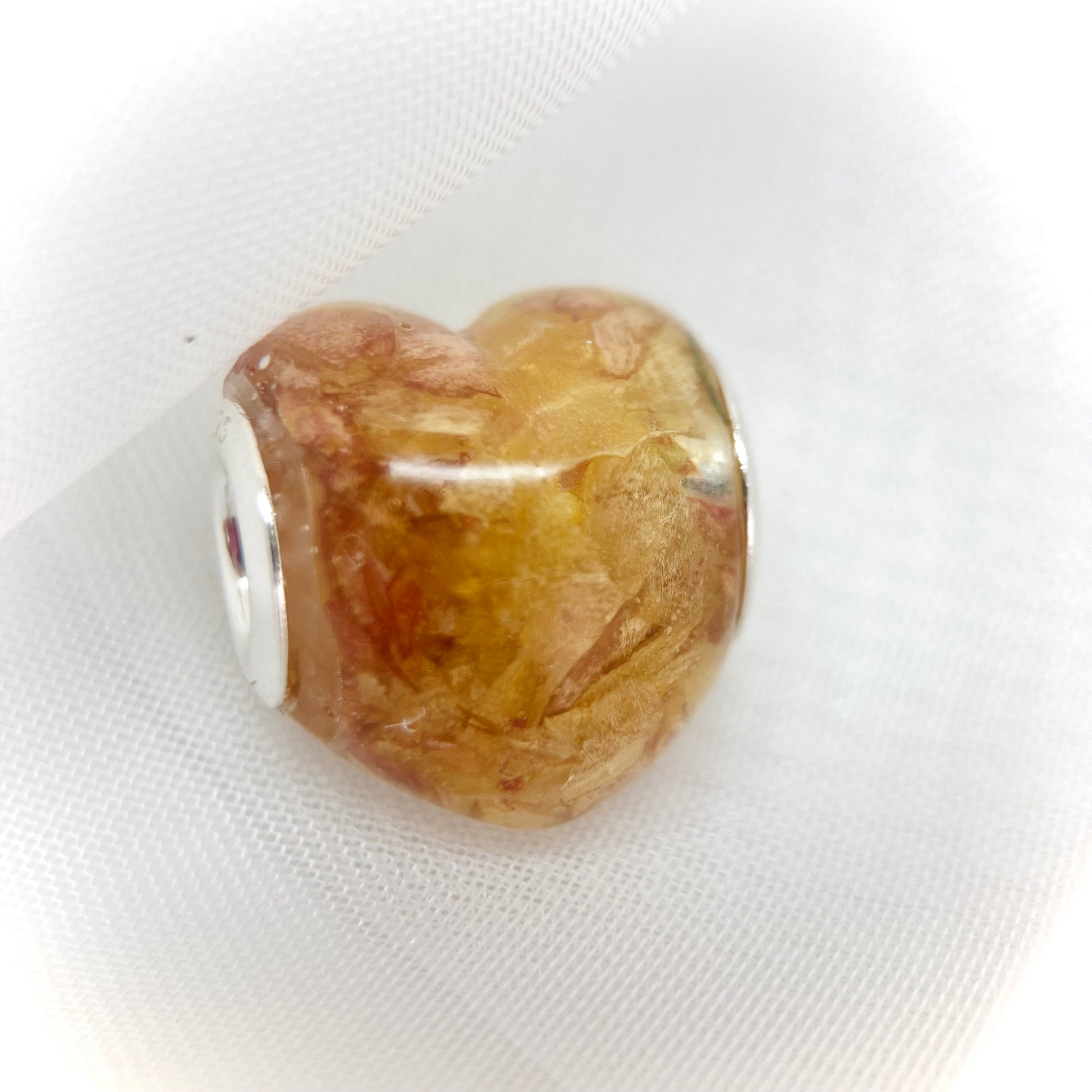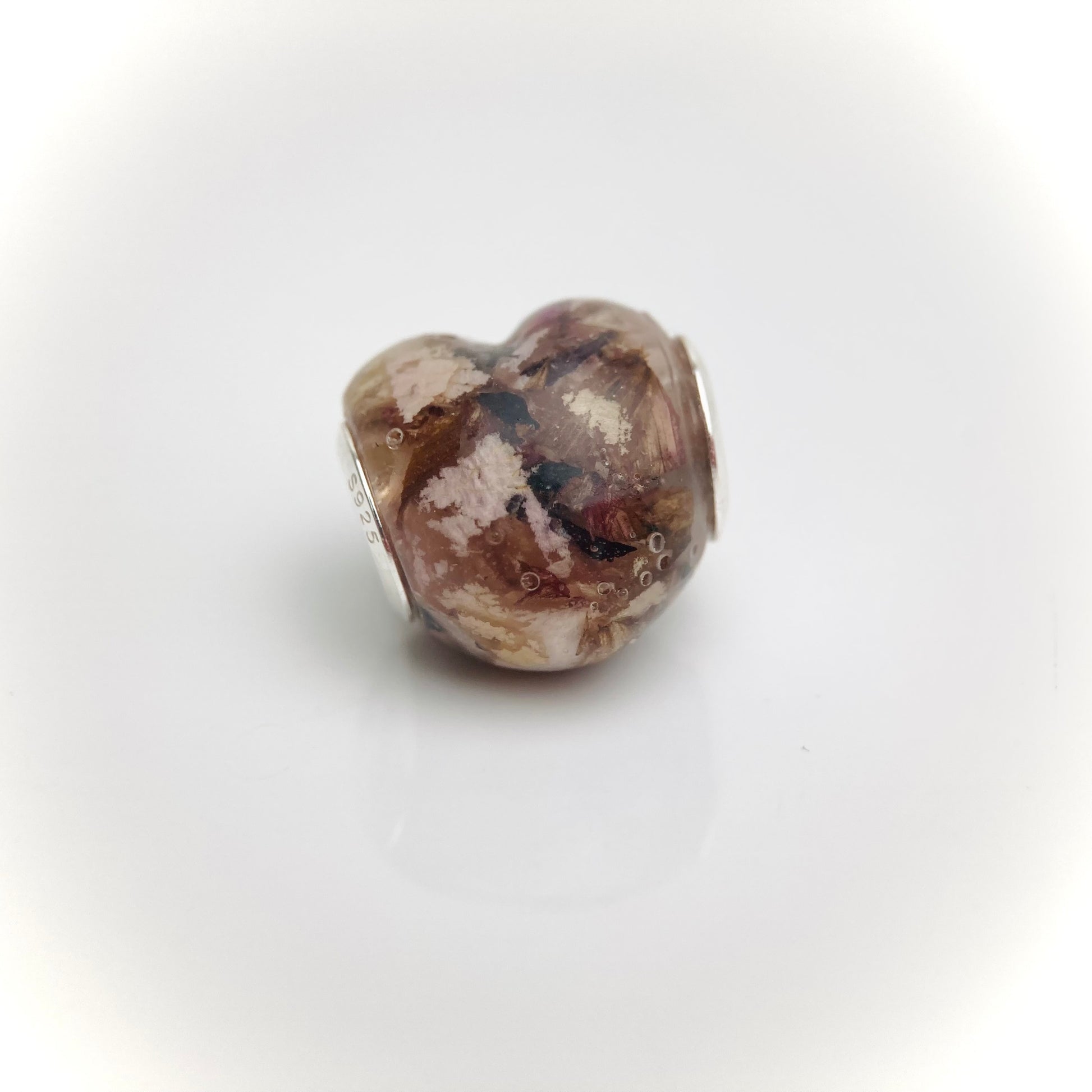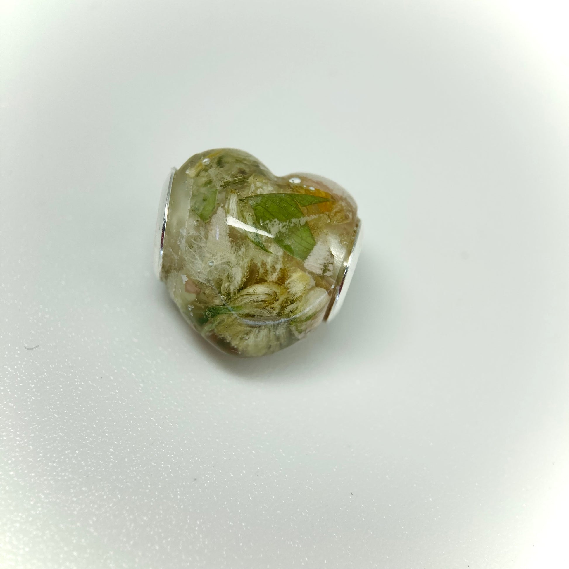 A beautiful heart shaped bead charm with a 5mm sterling silver centre containing your own real dried flowers and foliage. These charms are suitable to put on a necklace or a popular charm bracelet.