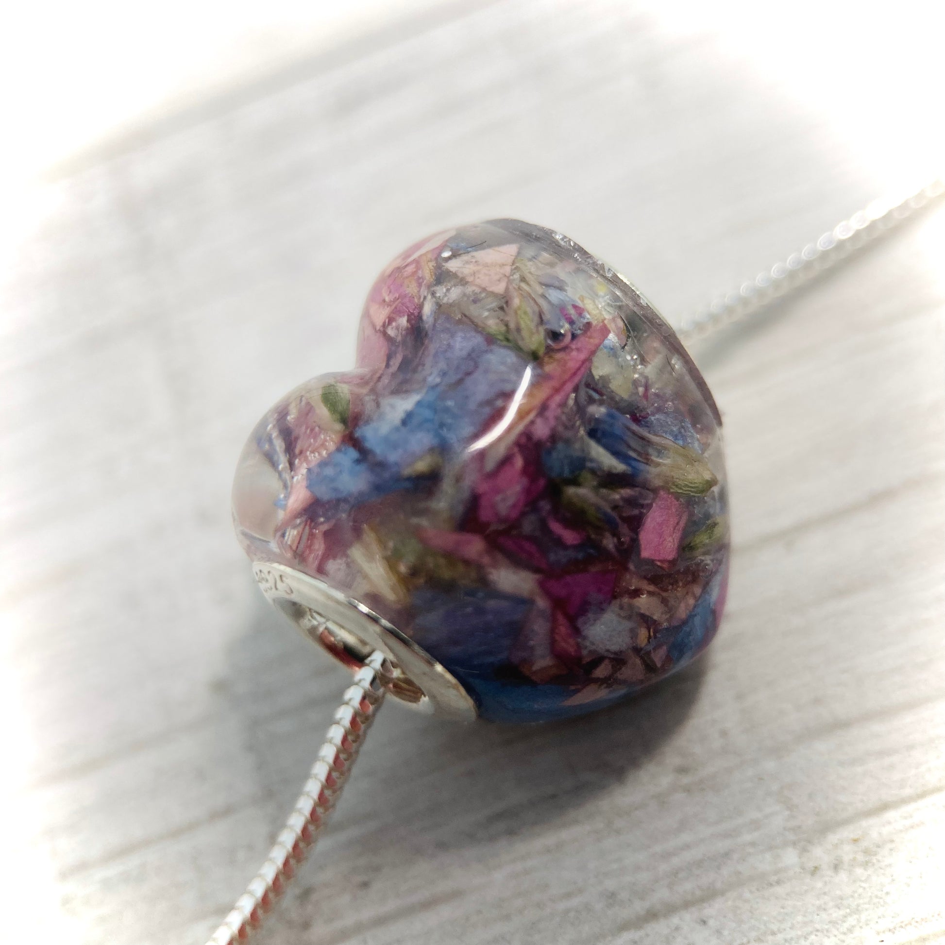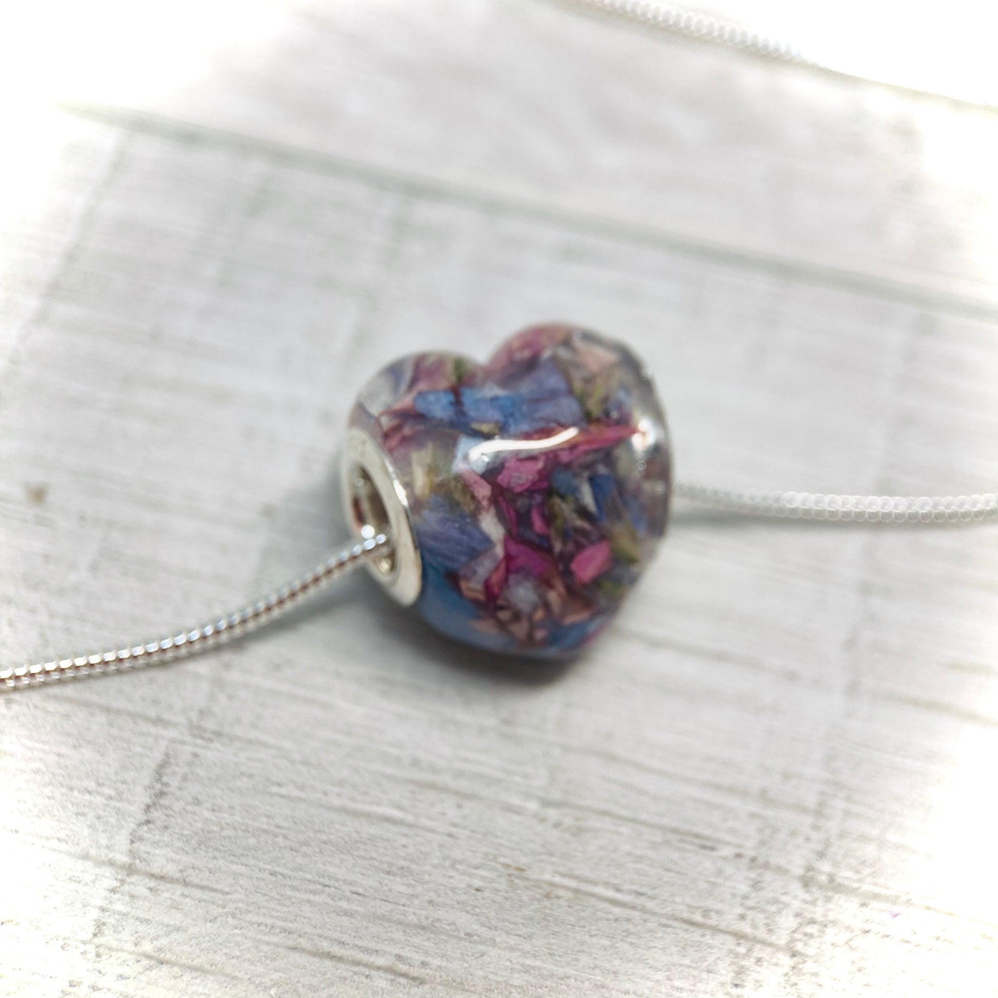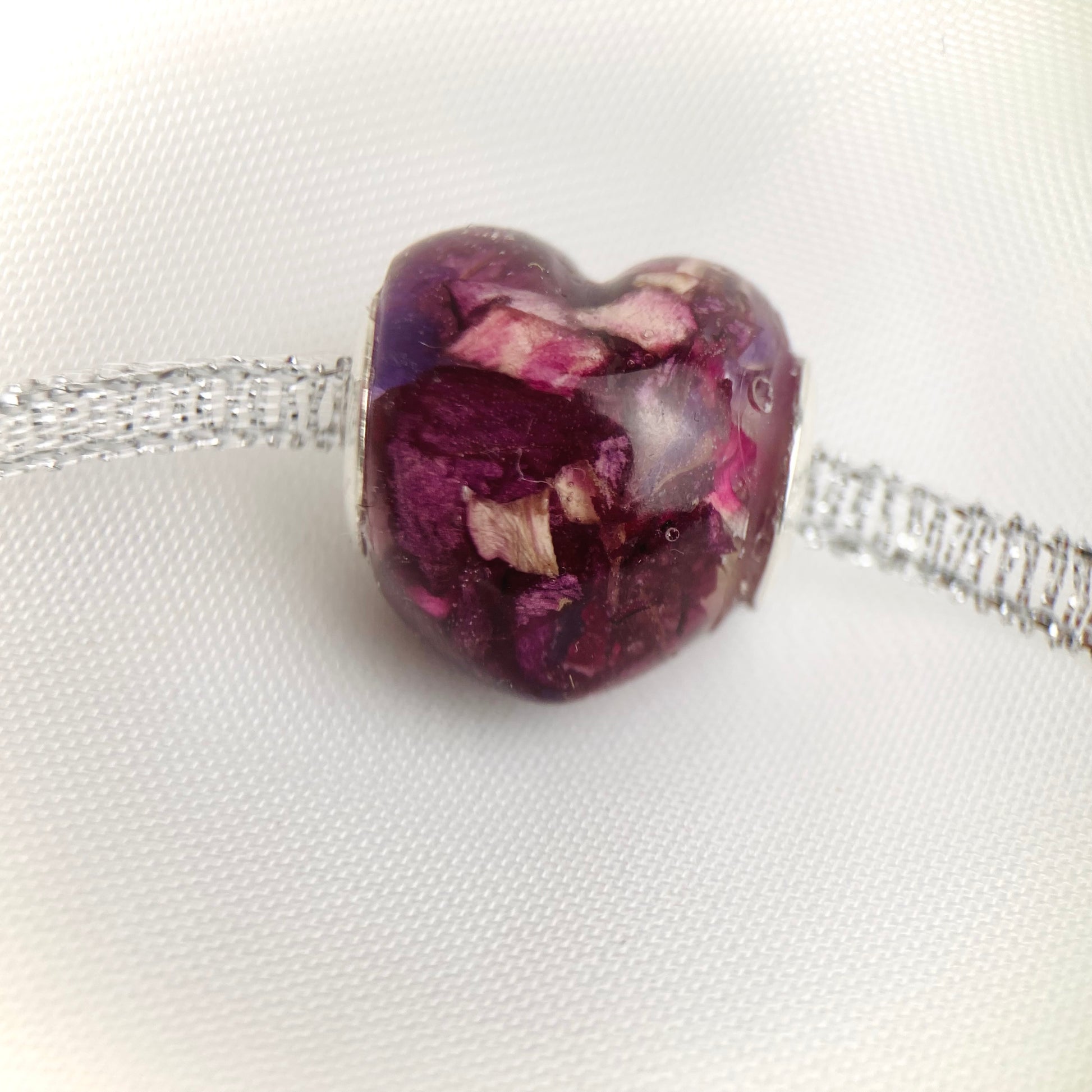 A beautiful heart shaped bead charm with a 5mm sterling silver centre containing your own real dried flowers and foliage. These charms are suitable to put on a necklace or a popular charm bracelet.
