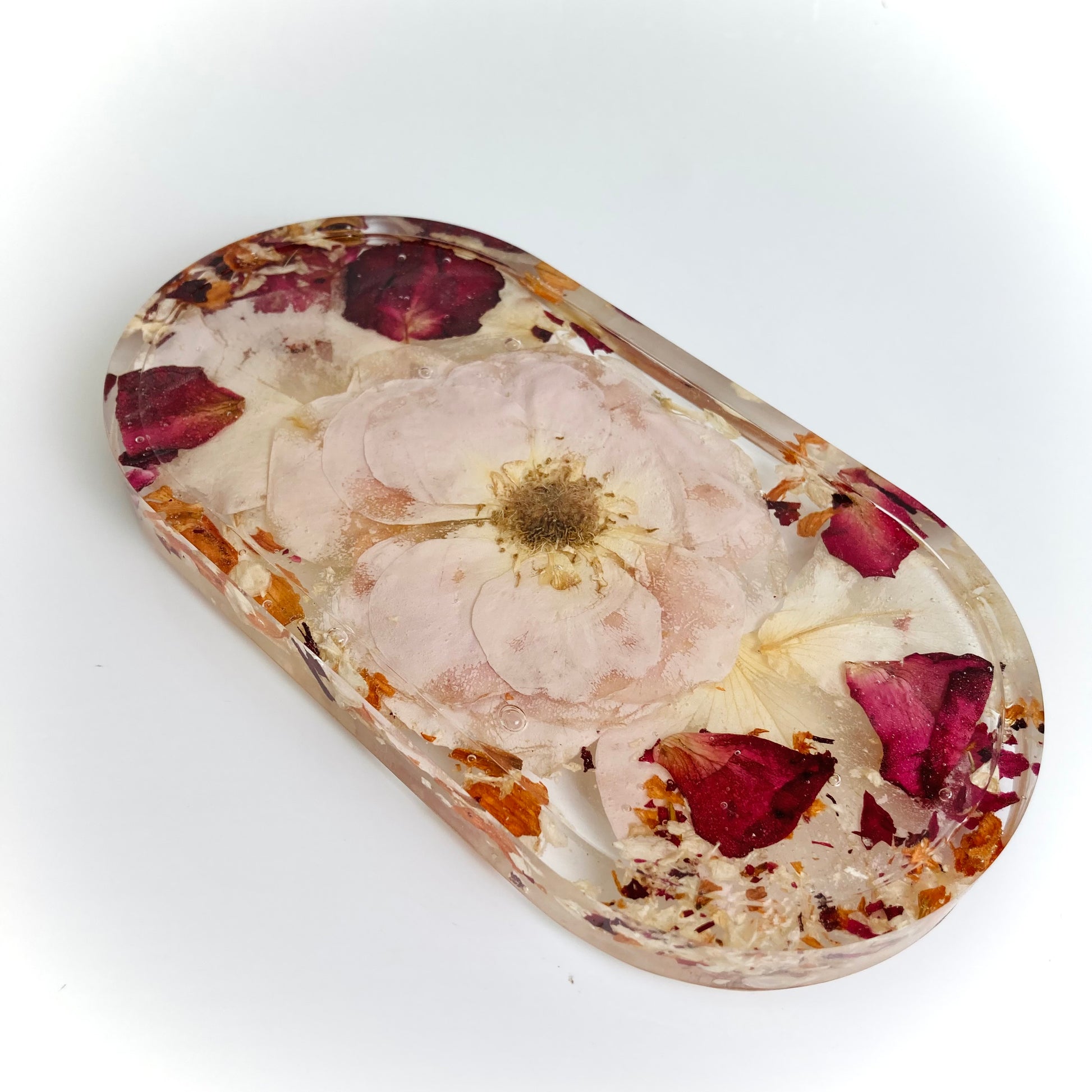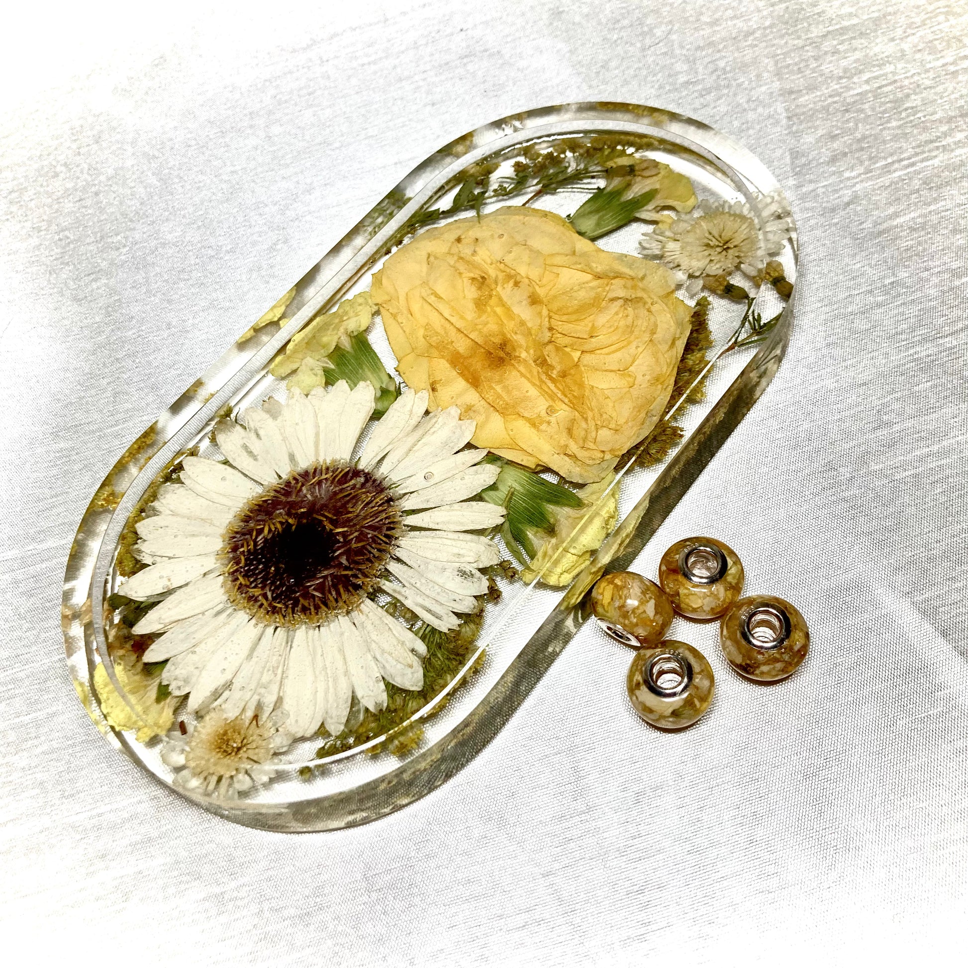 A beautiful oval shaped jewellery dish containing your own real dried wedding or funeral flowers and foliage.