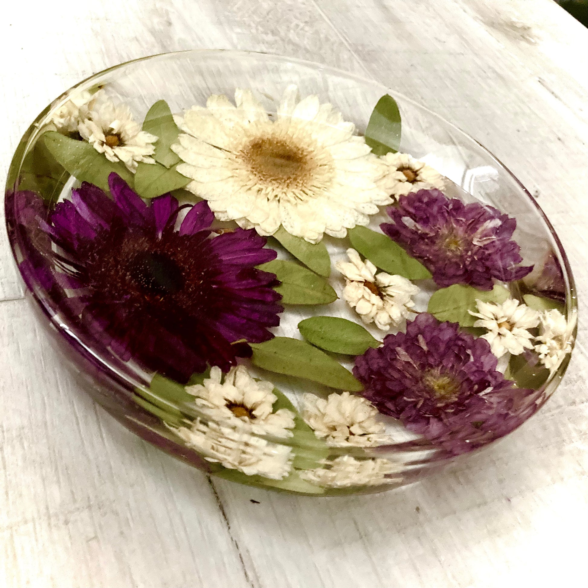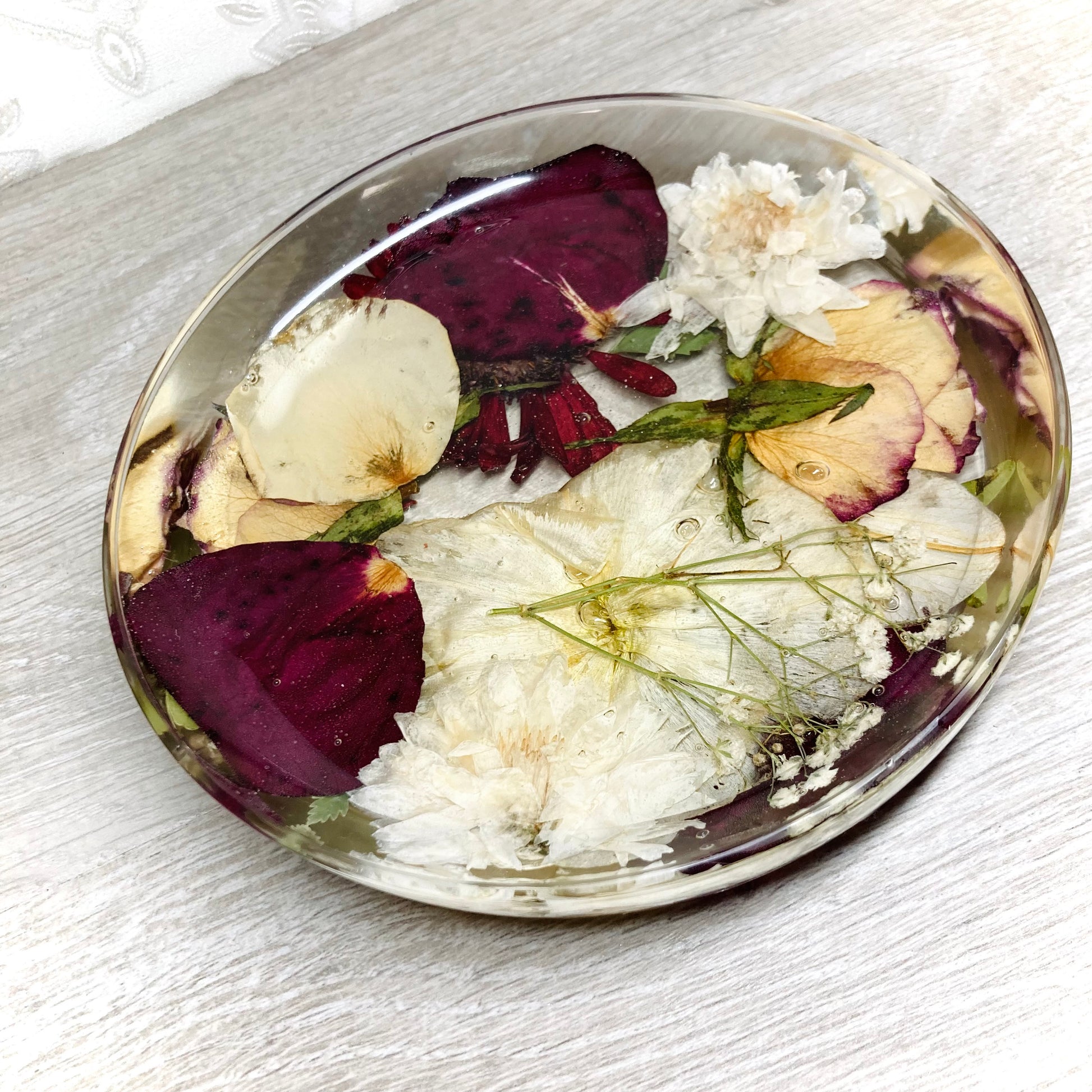 A beautiful round shaped jewellery dish containing your own real dried wedding or funeral flowers and foliage.