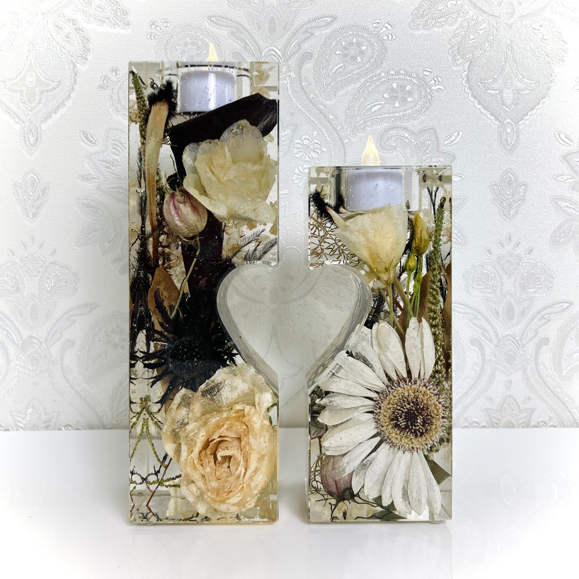 A beautiful twin heart tea light holder containing your own real dried flowers and foliage.