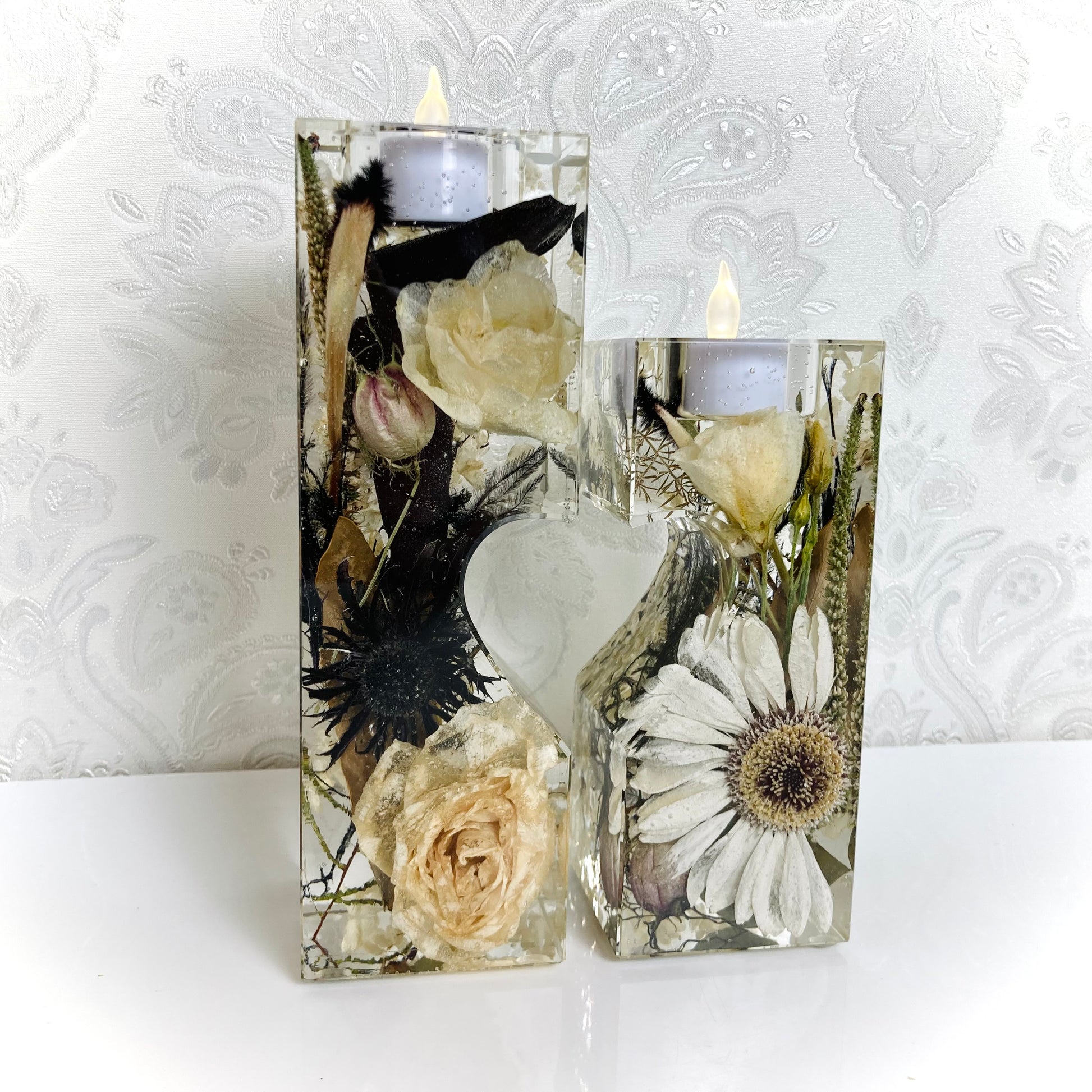 Resin is NOT high enough heat resistance for a real candle we will supply a electric tea light with your keepsake. Do not use a real flame candle with this item.