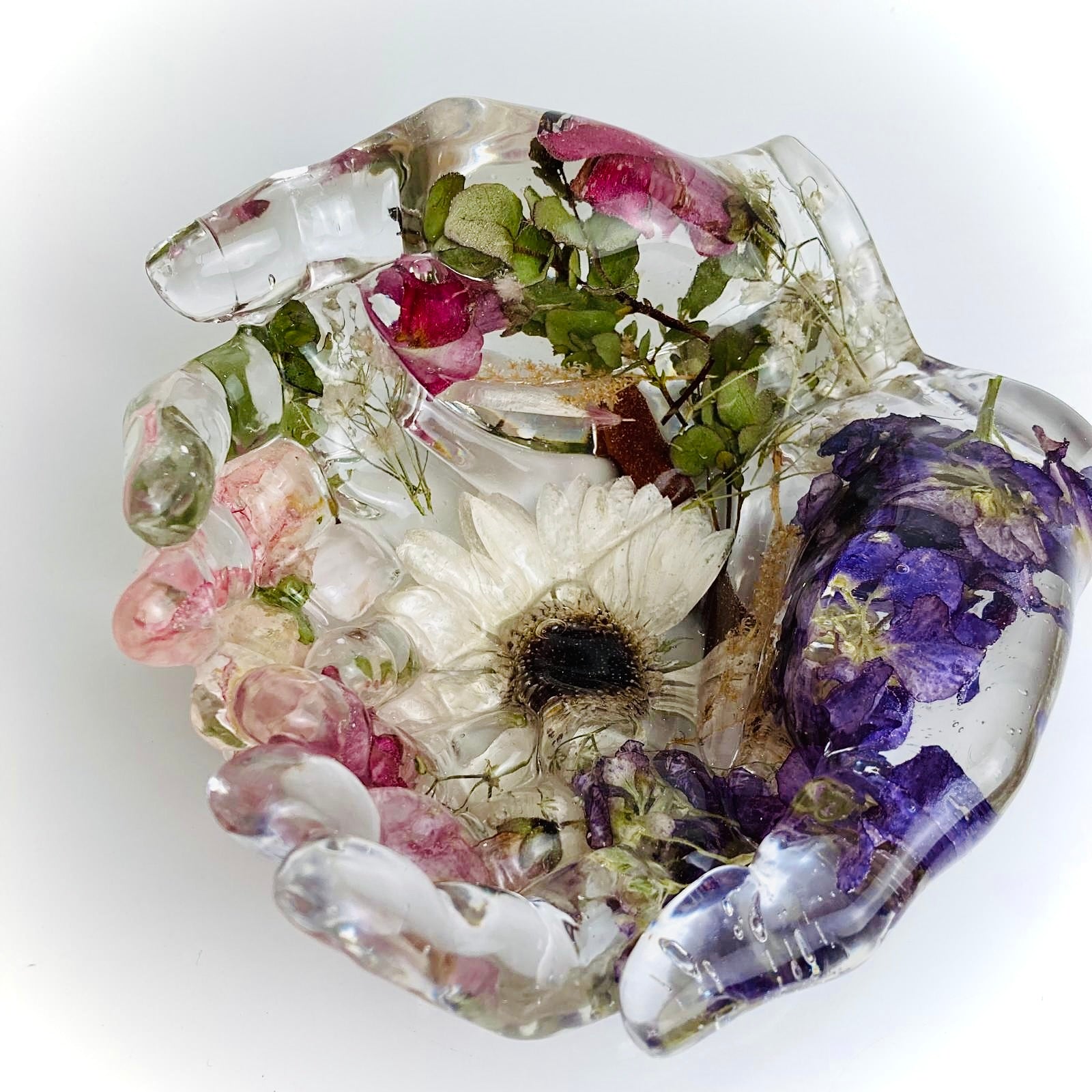 A beautiful cupped hands shaped jewellery tray containing your own preserved wedding or funeral flowers and foliage.