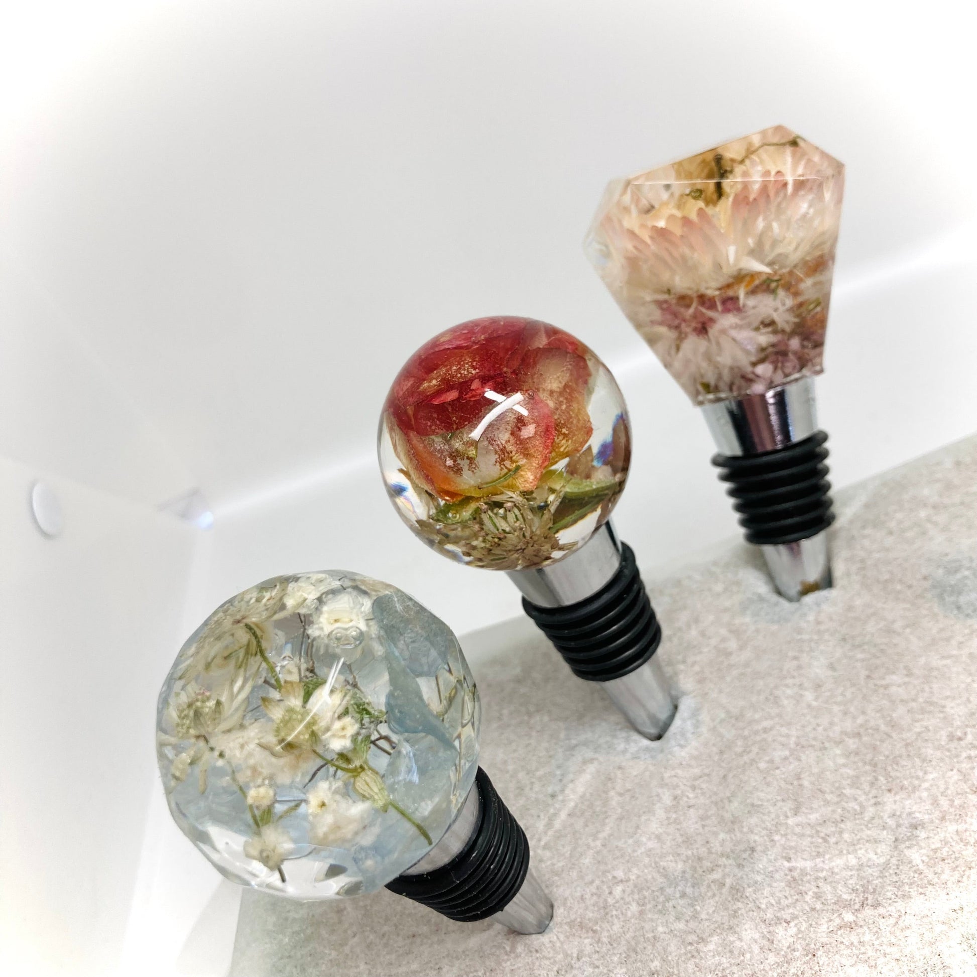 Celebrate your special day with the timeless beauty of preserved wedding flowers! Our Wedding Flower Preservation geode dining package is the perfect way to preserve the memories of your wedding day for years to come. Each item is handmade with real, carefully selected flowers that are preserved in a unique, resin-based process to maintain their vibrant color and texture. The coasters and tray are not only beautiful, but also functional, with a non slip rubber feet that protect your furniture from scratches and spills. The wine bottle stopper is available in either a smooth sphere, faceted sphere or crystal shape to suit your personal taste.