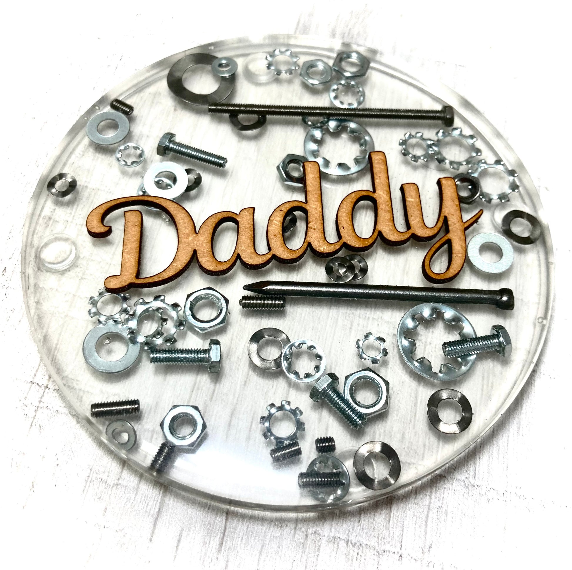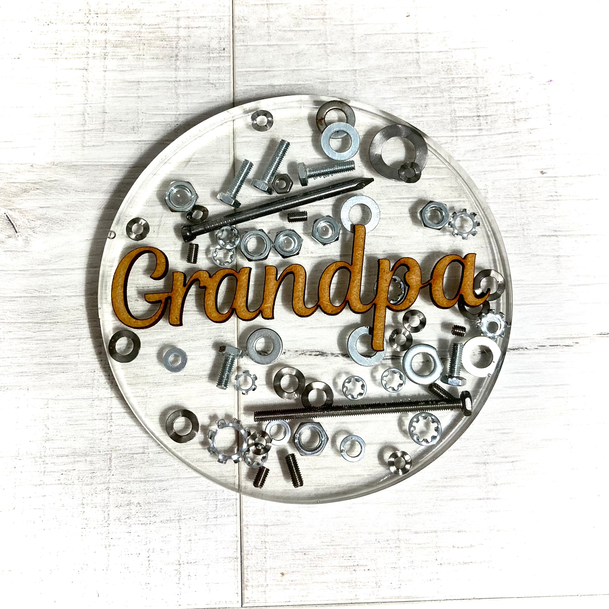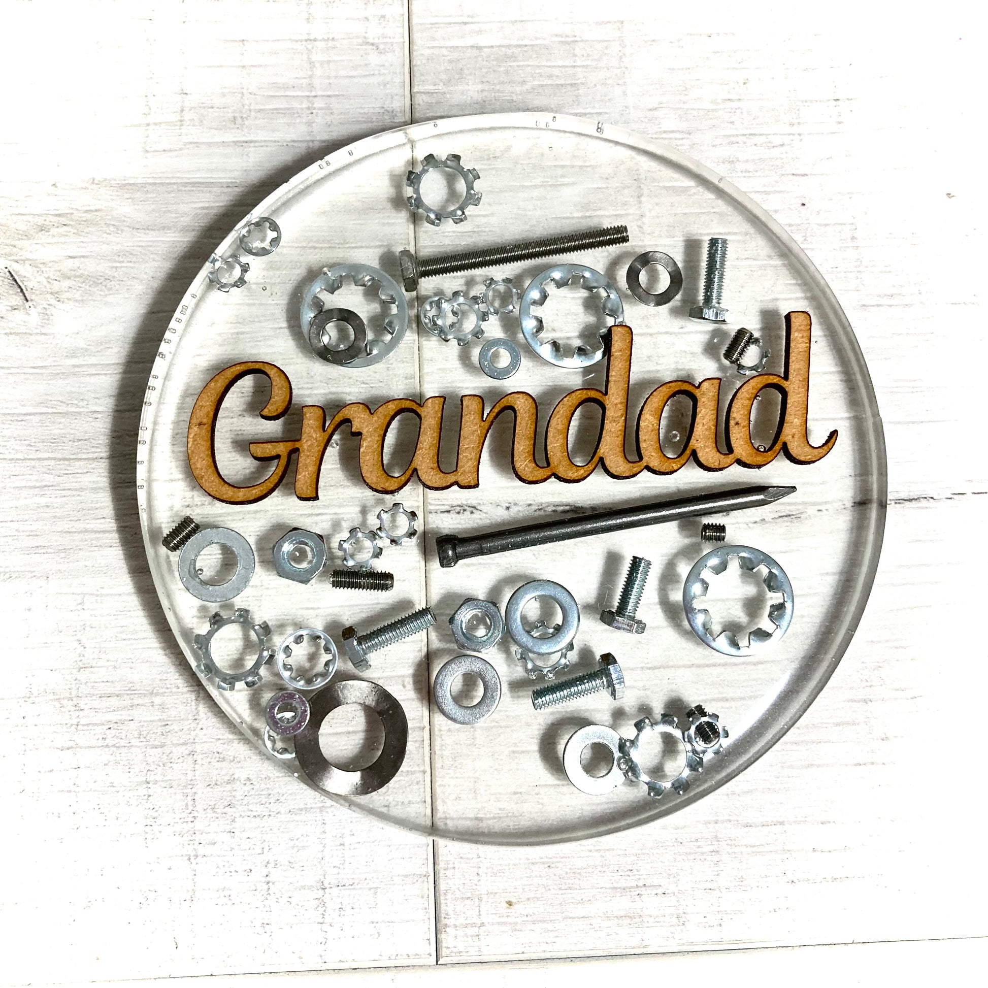 "Grandad" coaster made with 2.5cm high wooden lettering set inside and with a mix of real nuts, bolts, screws and washers.