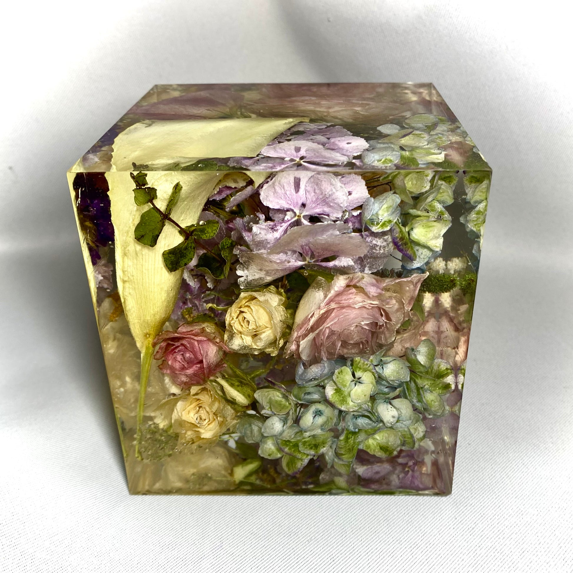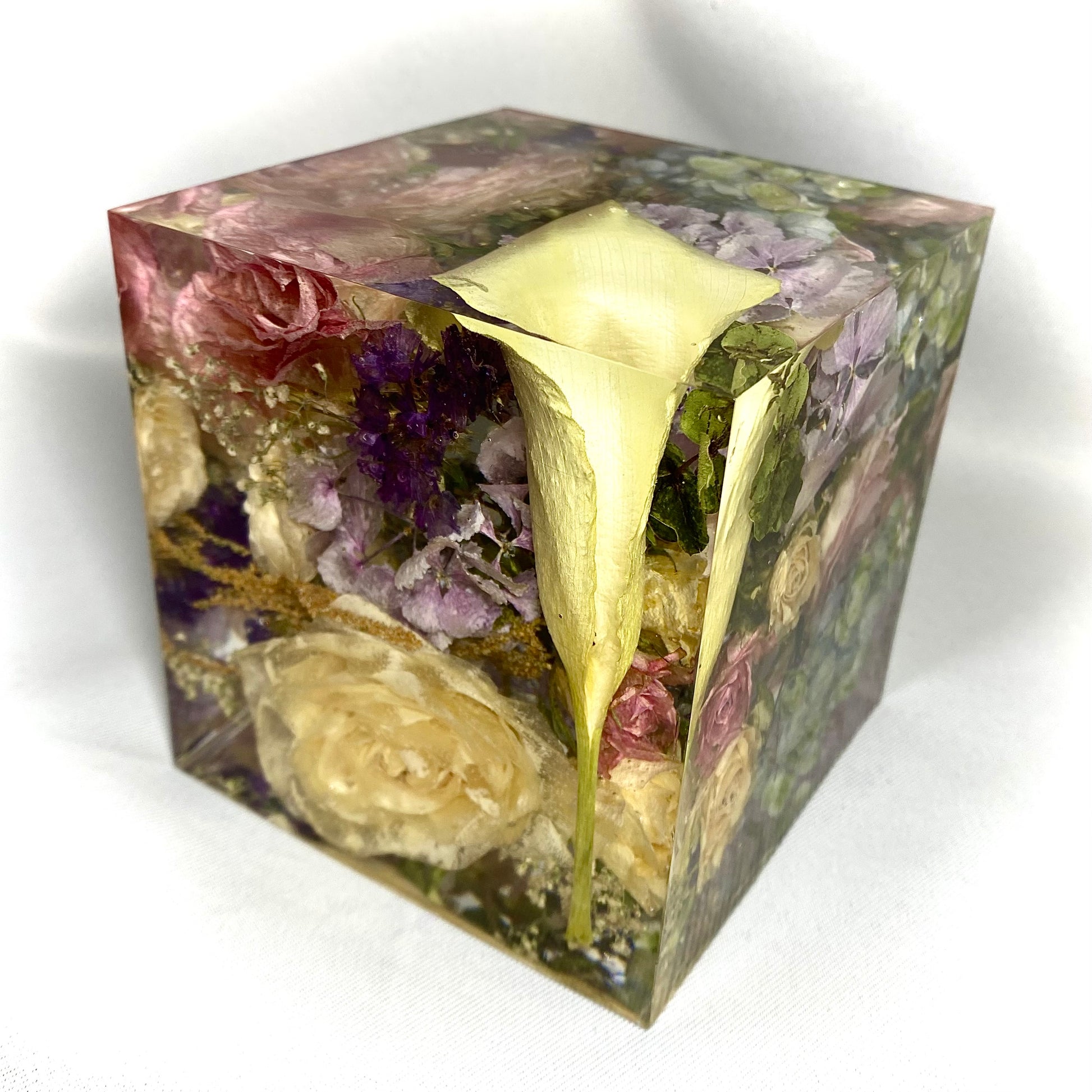 A beautiful 10cm cube containing mixed florals including a Cala lily, a variety of pink roses, pink and blue hydrangeas, pink lisianthus and a white rose.