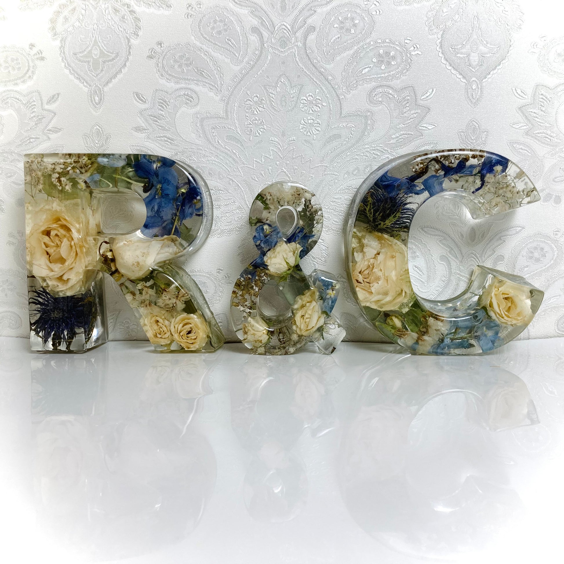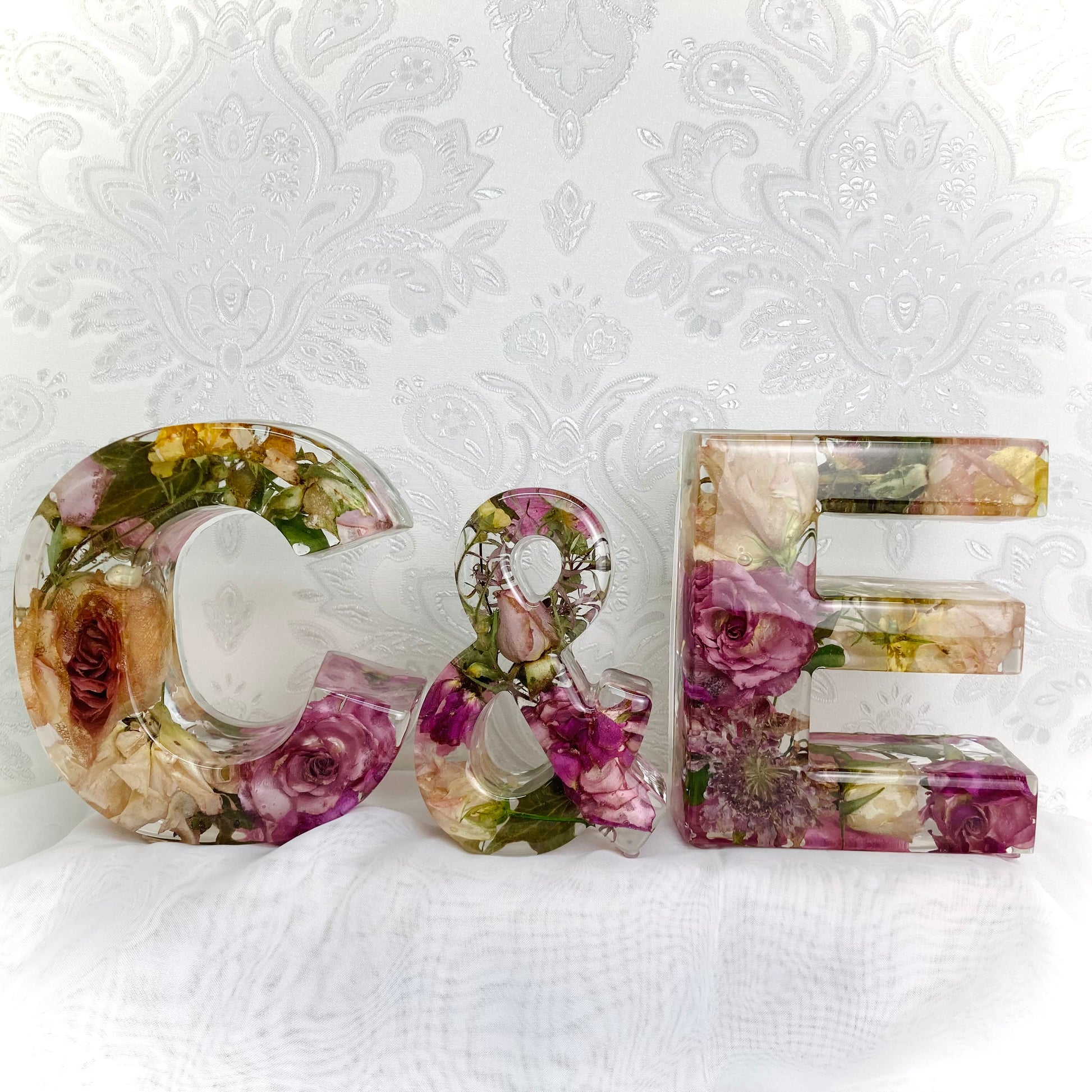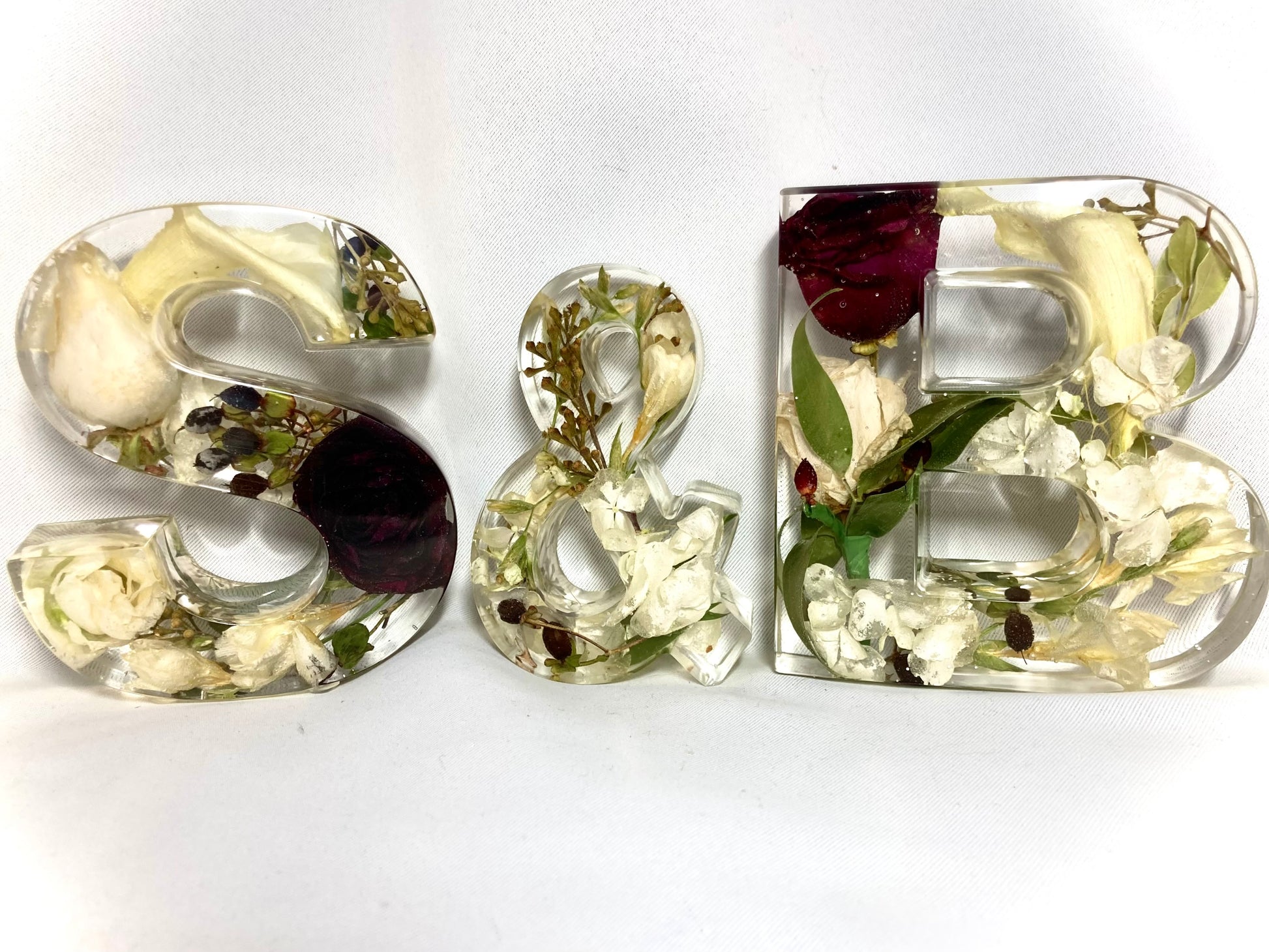 A package of two beautiful 13cm freestanding letters and a 11cm freestanding ampersand containing your own preserved memorial or wedding flowers.