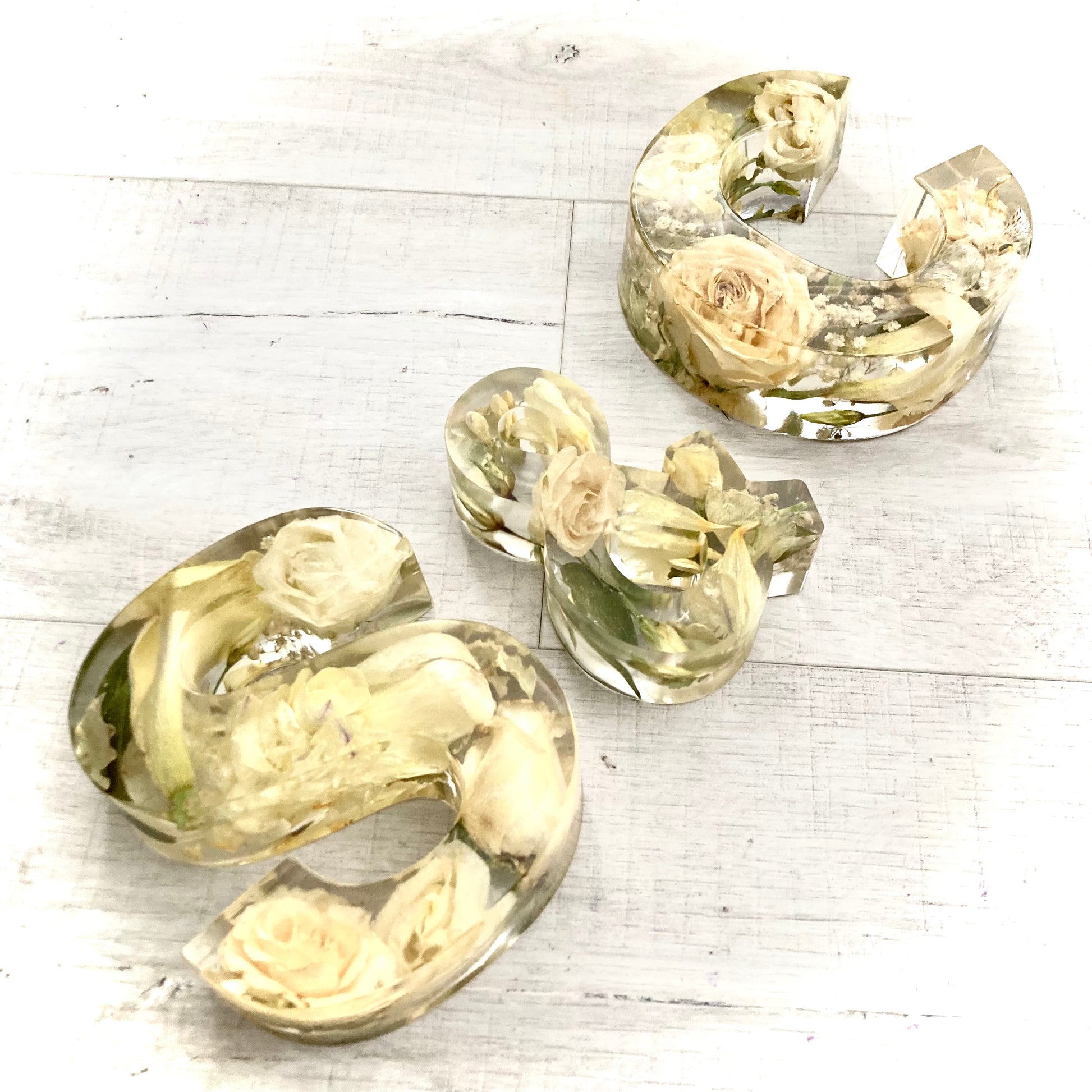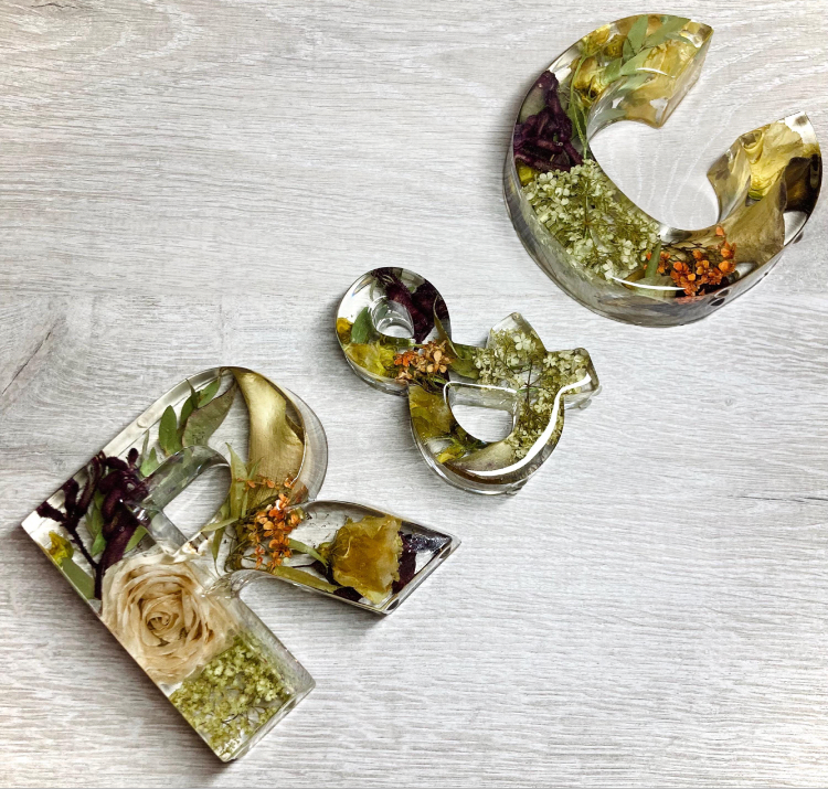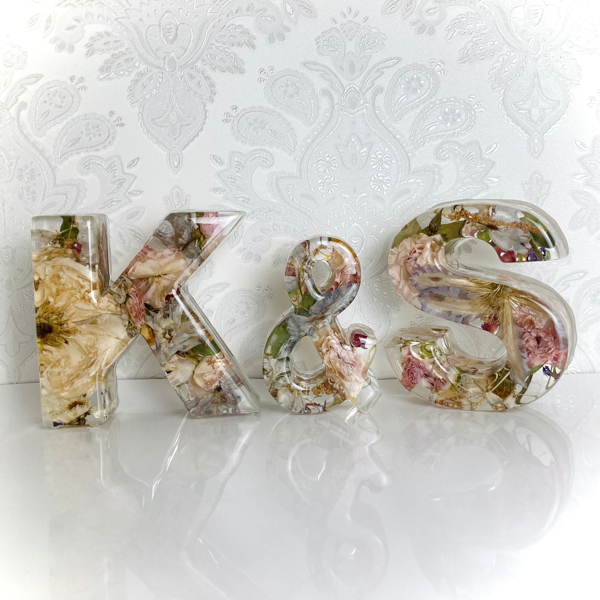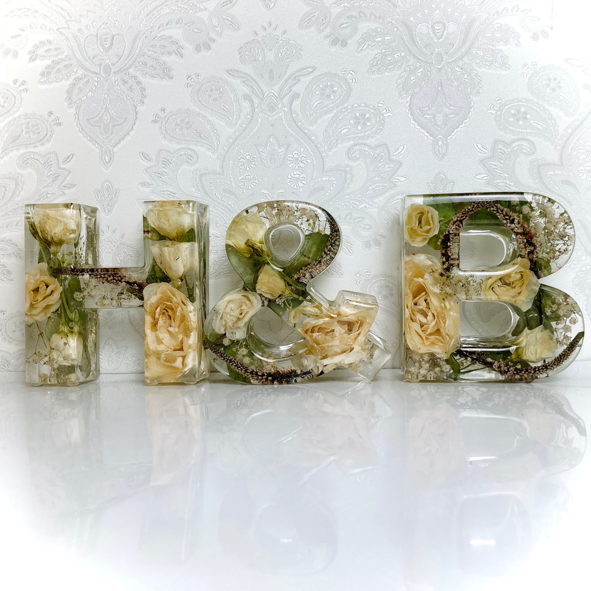 A package of two beautiful 13cm freestanding letters and a 11cm freestanding ampersand containing your own preserved memorial or wedding flowers.