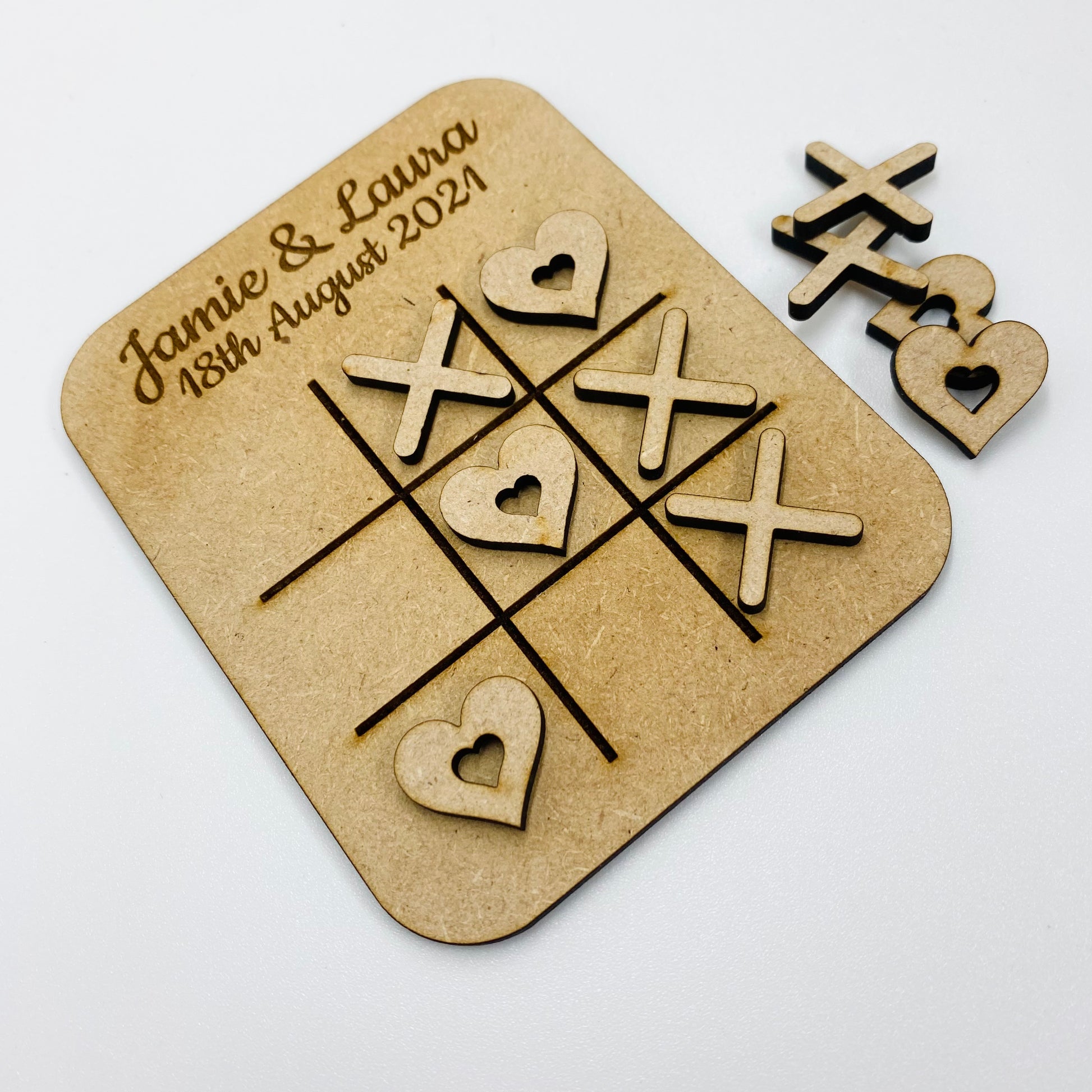 Crafted from durable 3mm MDF, each game board is intricately engraved with the classic Tic Tac Toe grid, alongside the names of the happy couple and their wedding date for a personalized touch.