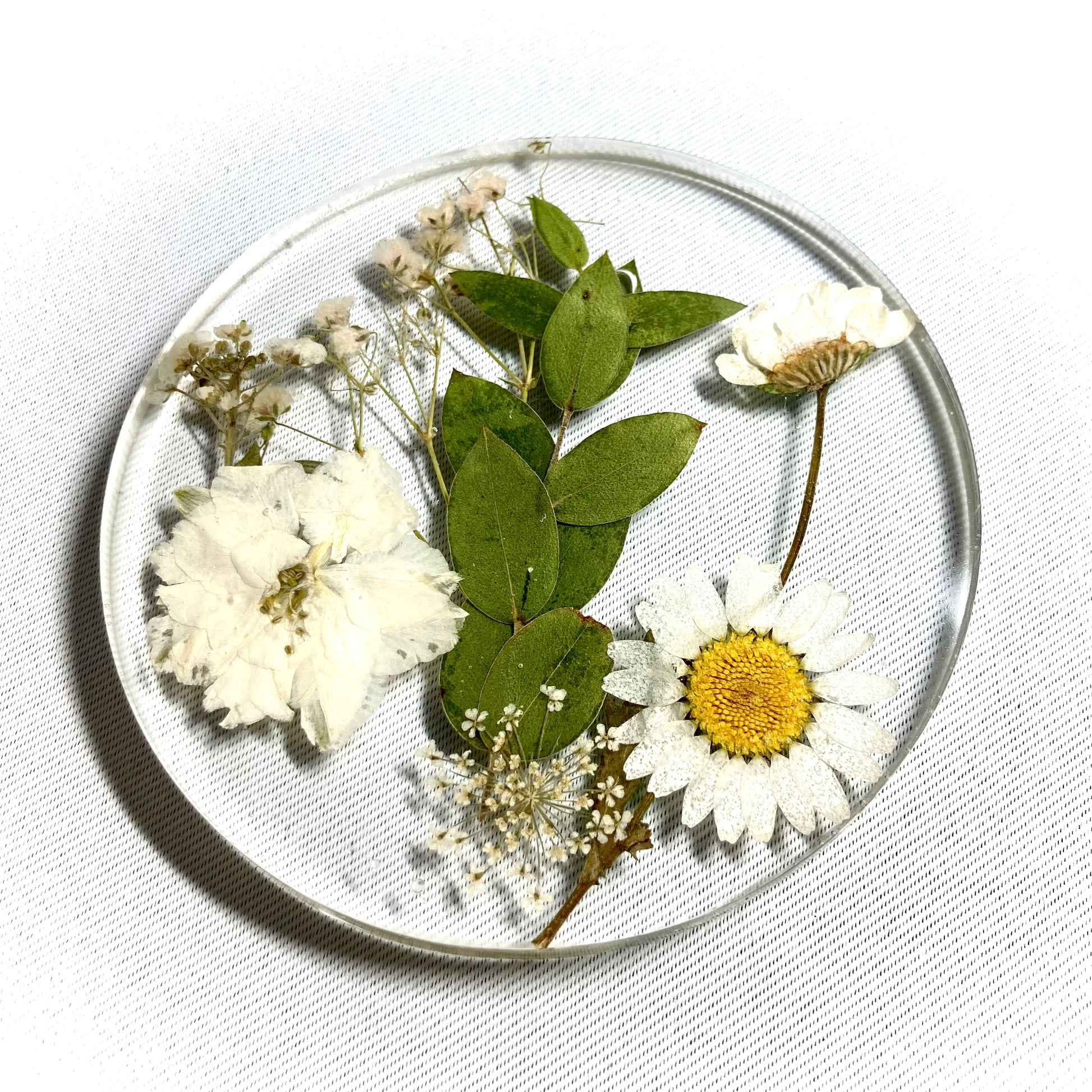 White floral themed coasters containing real flowers and foliage. This coaster is 10cm across and about 1cm deep and come fitted with anti slip rubber feet.