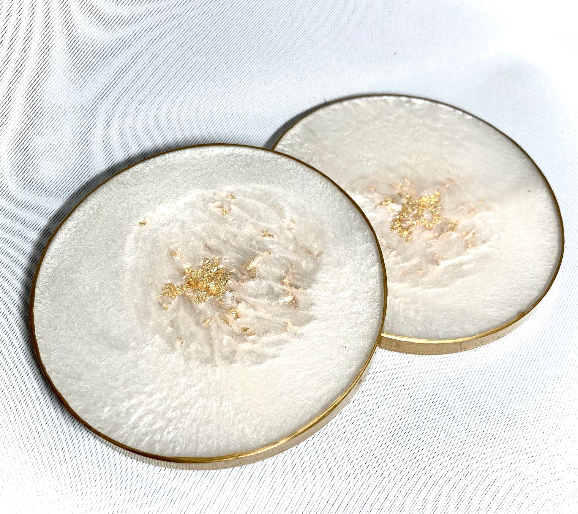 A made to order set of round style resin coasters made with cruelty free ethically sourced white mica powder and gold or silver leaf.