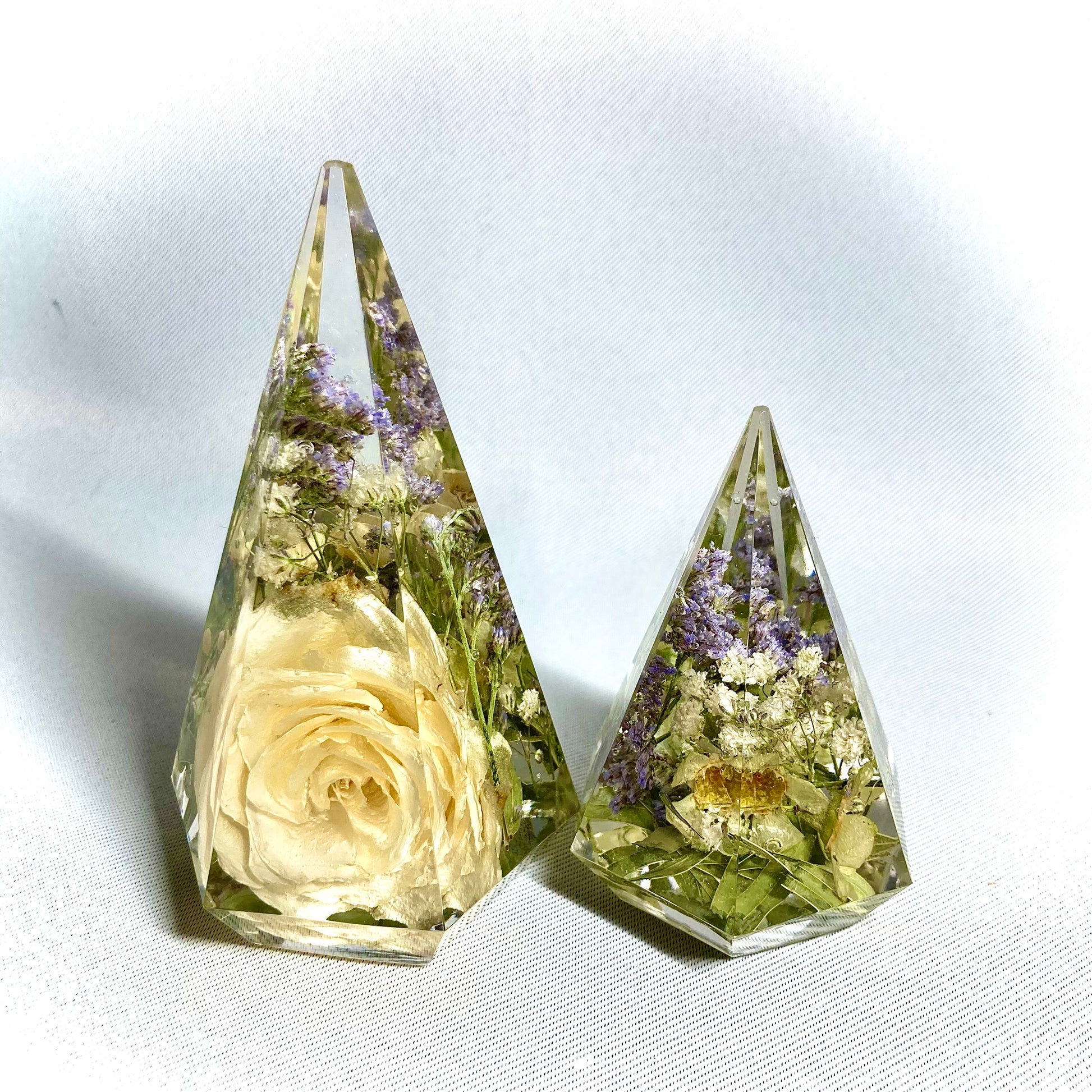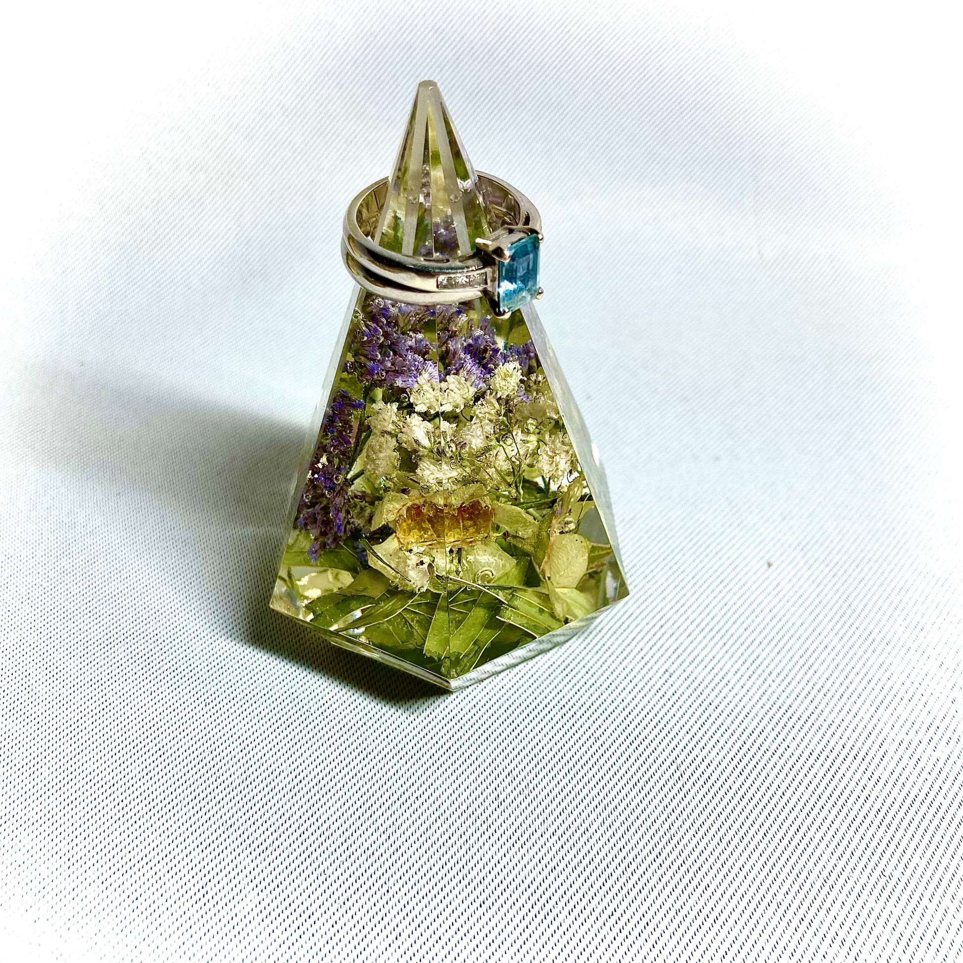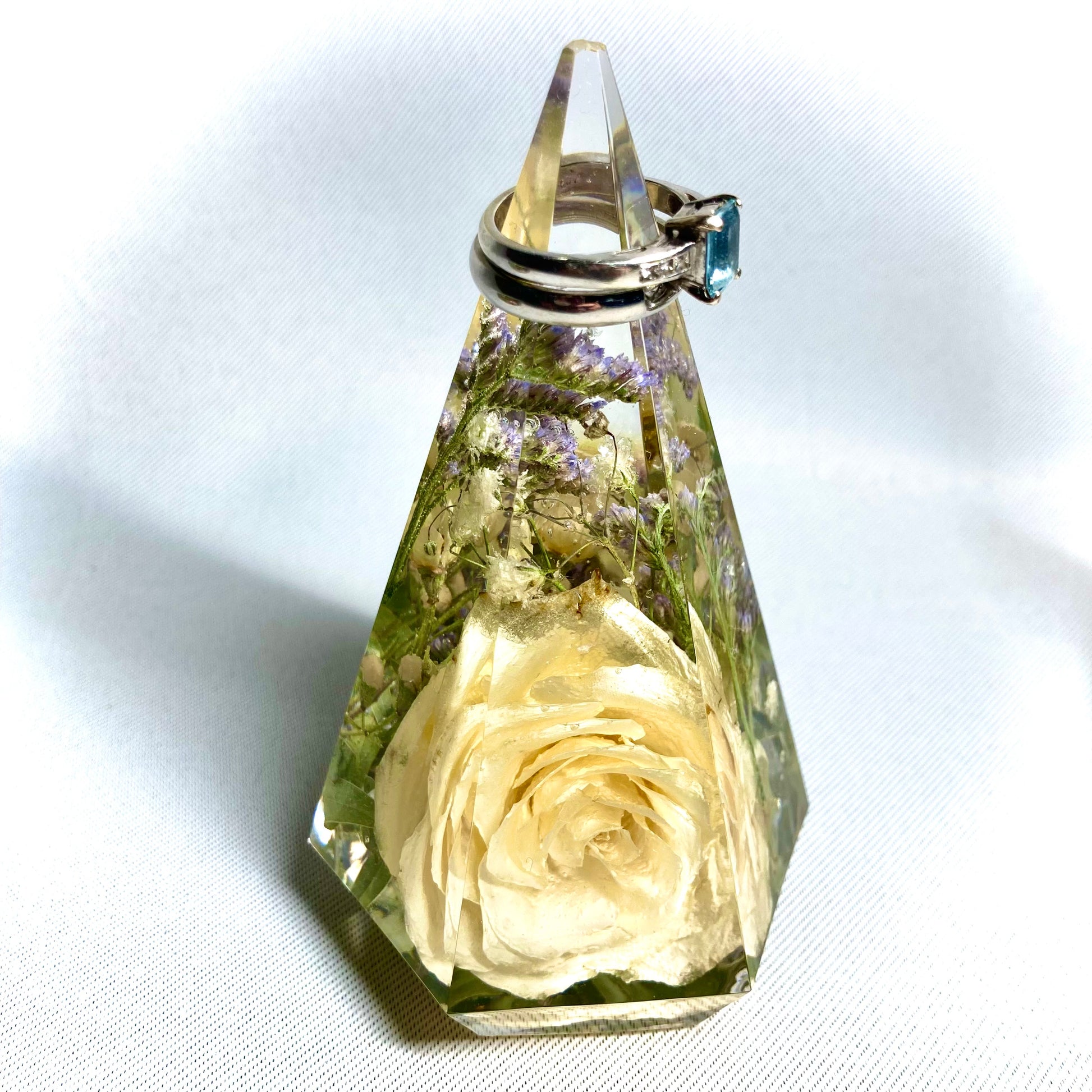 A beautiful faceted ring holder containing your own real dried flowers and foliage.