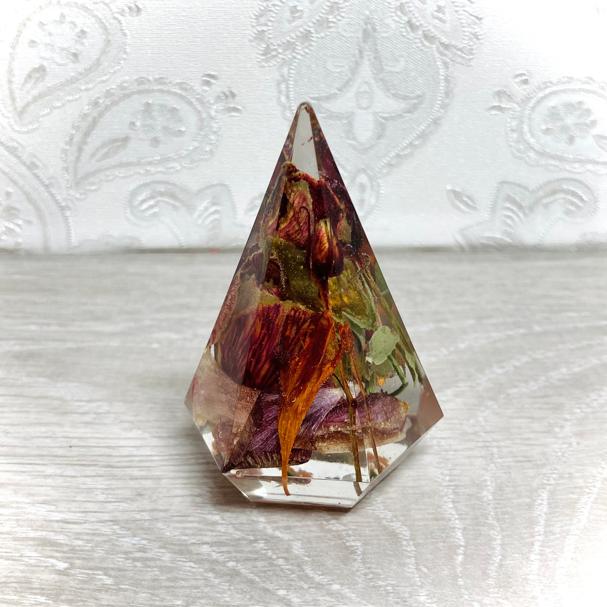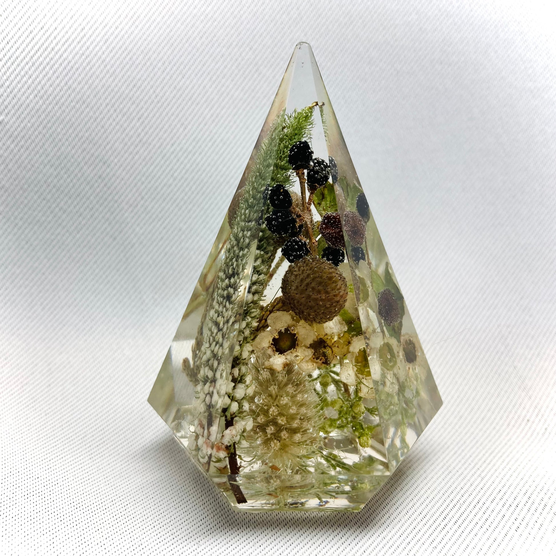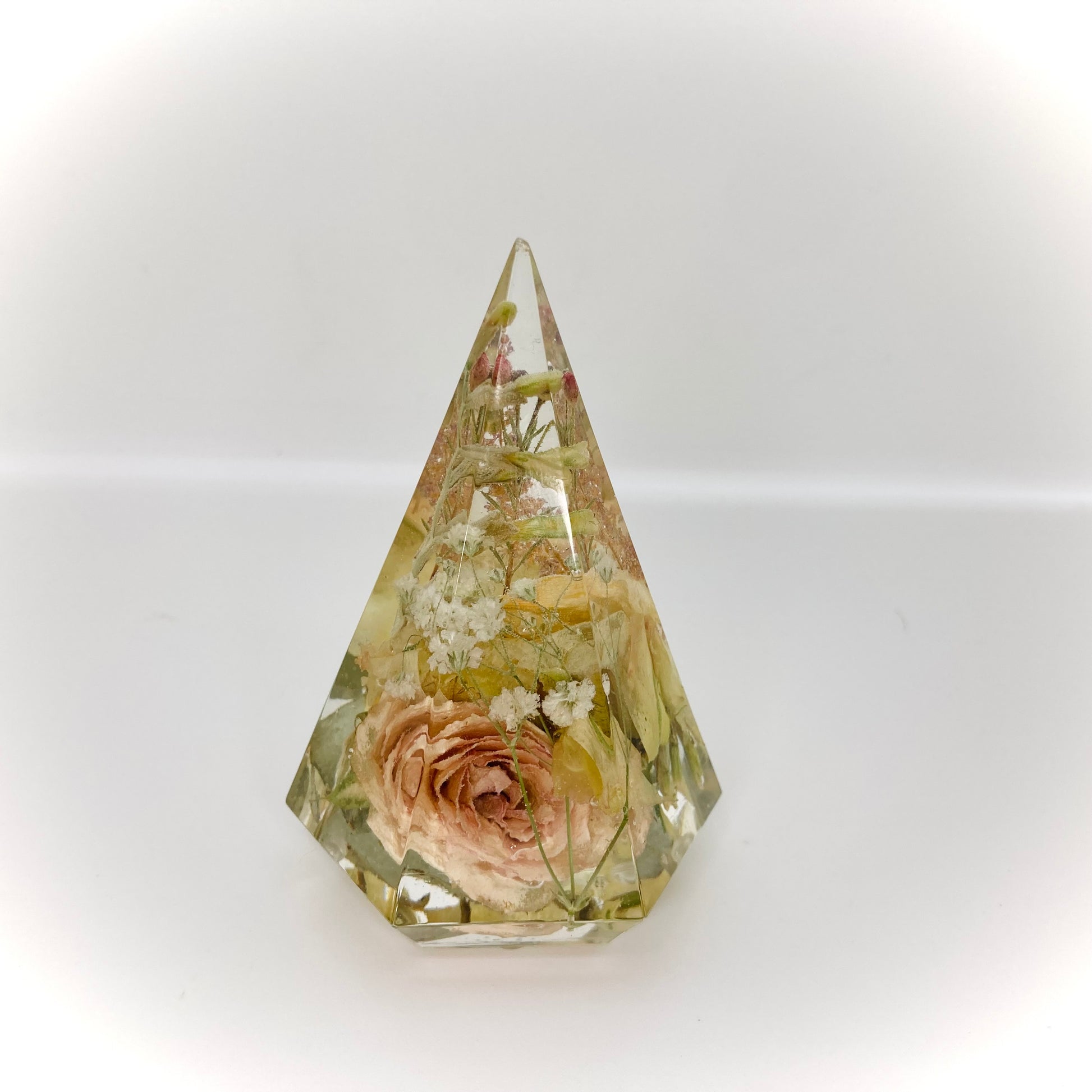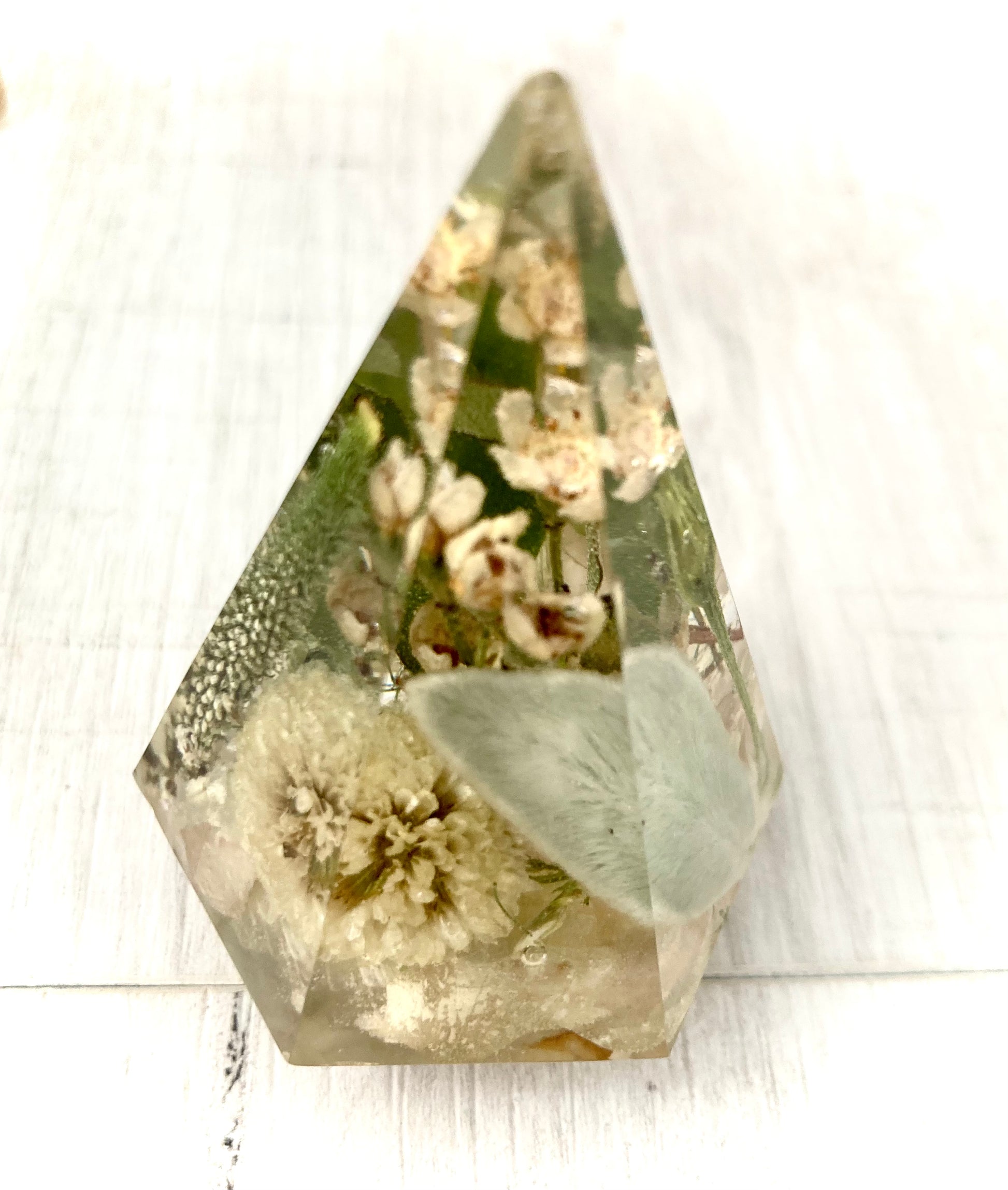 A beautiful faceted ring holder containing your own real dried flowers and foliage.