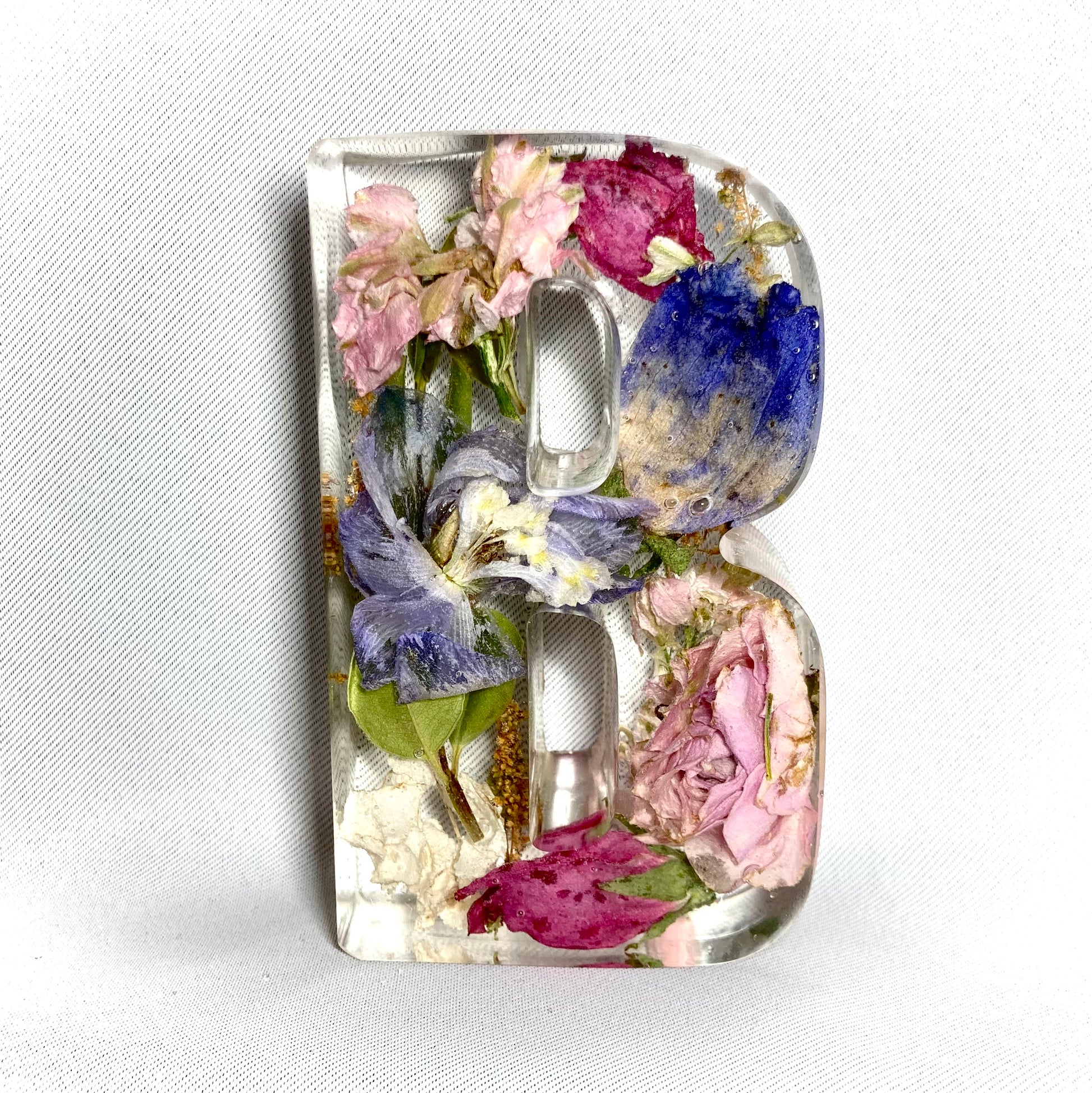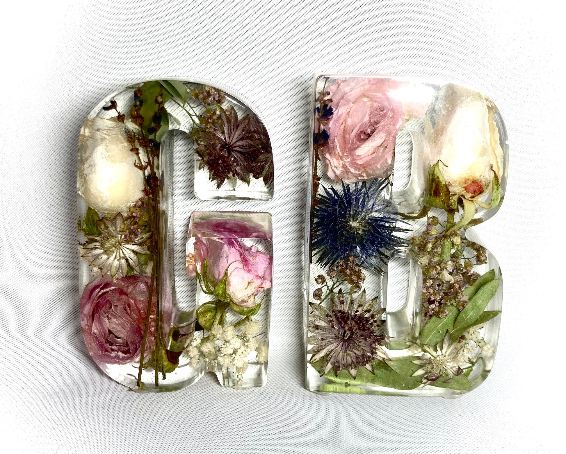 A beautiful 11cm freestanding letter containing your own preserved funeral or wedding flowers.